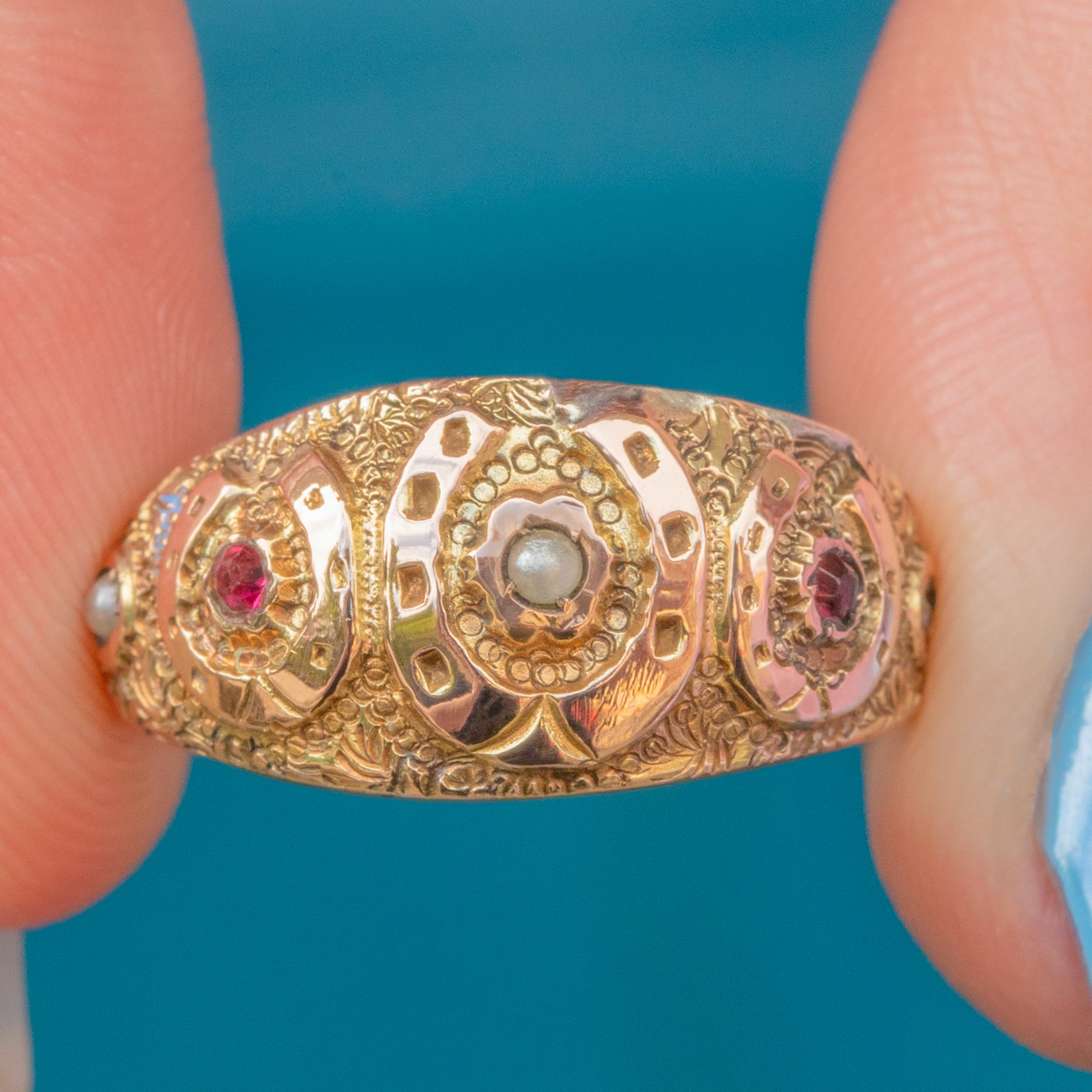 GOOD. The ring has been beautifully detailed with three horseshoes and set with both Rubies and Pearls. The Pearl furthest to the right has split, so there is only half of it left, but when you wear it, this isn't obvious as it is situated where the fingers meet. There is a resize mark on the back of the band, but this is only visible from the inside of the band. With a full set of hallmarks, including the rare Chester Assay stamp, we can accurately date this treatre to 1902!