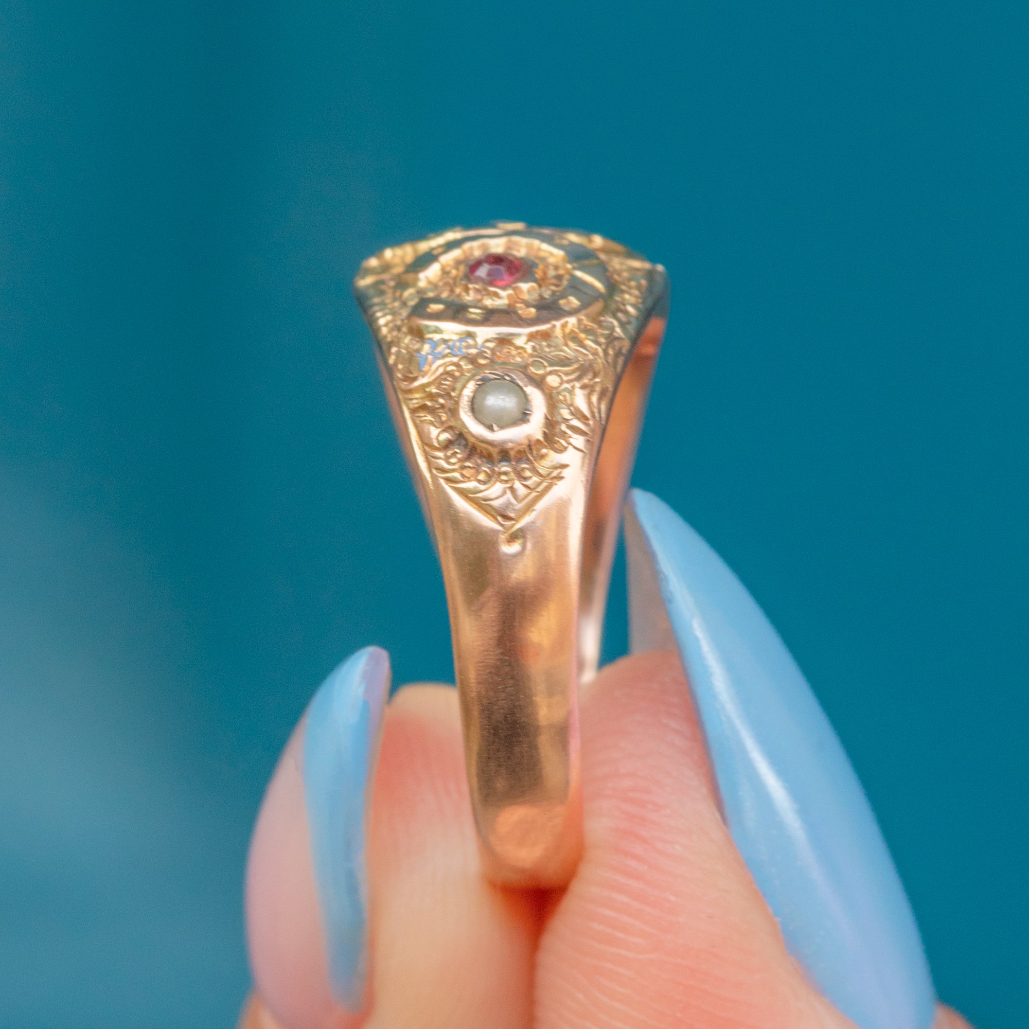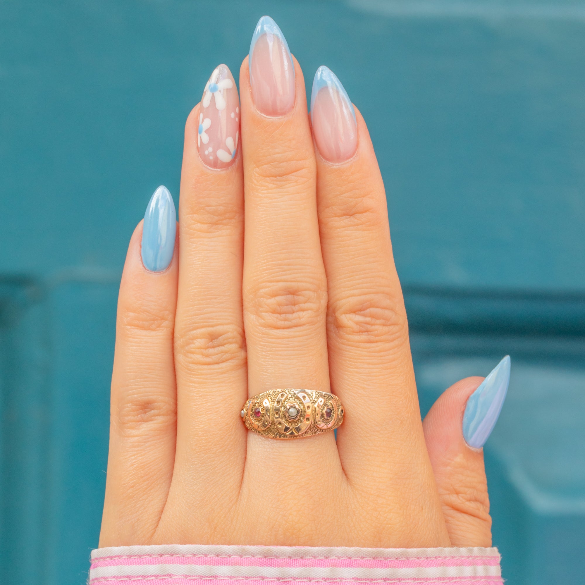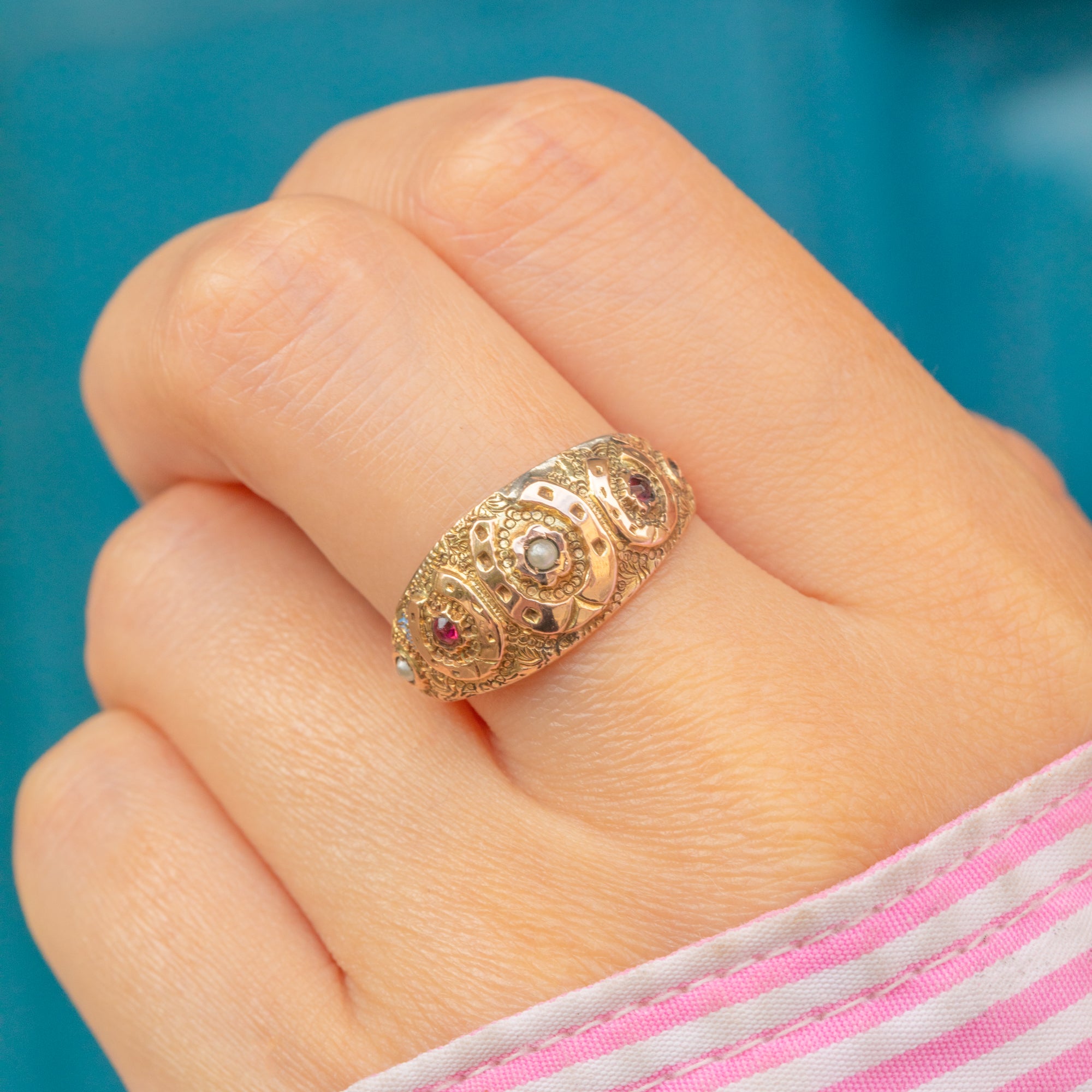 The front of the ring has three lucky horseshoes on it, each set with either a Ruby or a Pearl. A lot of thought has gone into creating this antique ring, and we adore the sentiment behind it!