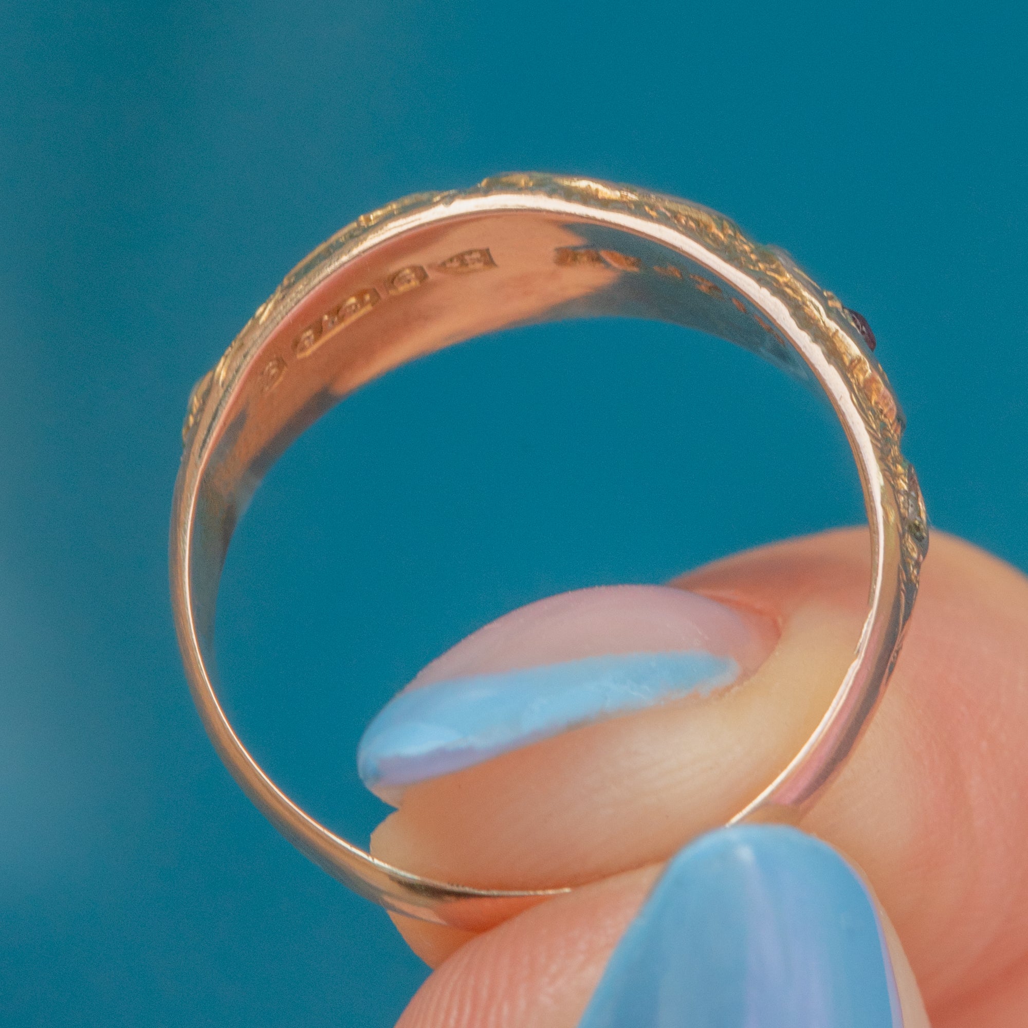 This early Edwardian ring carries deep symbolic meaning, with three horseshoes on the front and 'Mizpah' inscribed on the inside. Mizpah is a Hebrew word which means 'watchtower' and rose to popularity during the Victorian era, with pieces being gifted as tokens of love and remembrance.