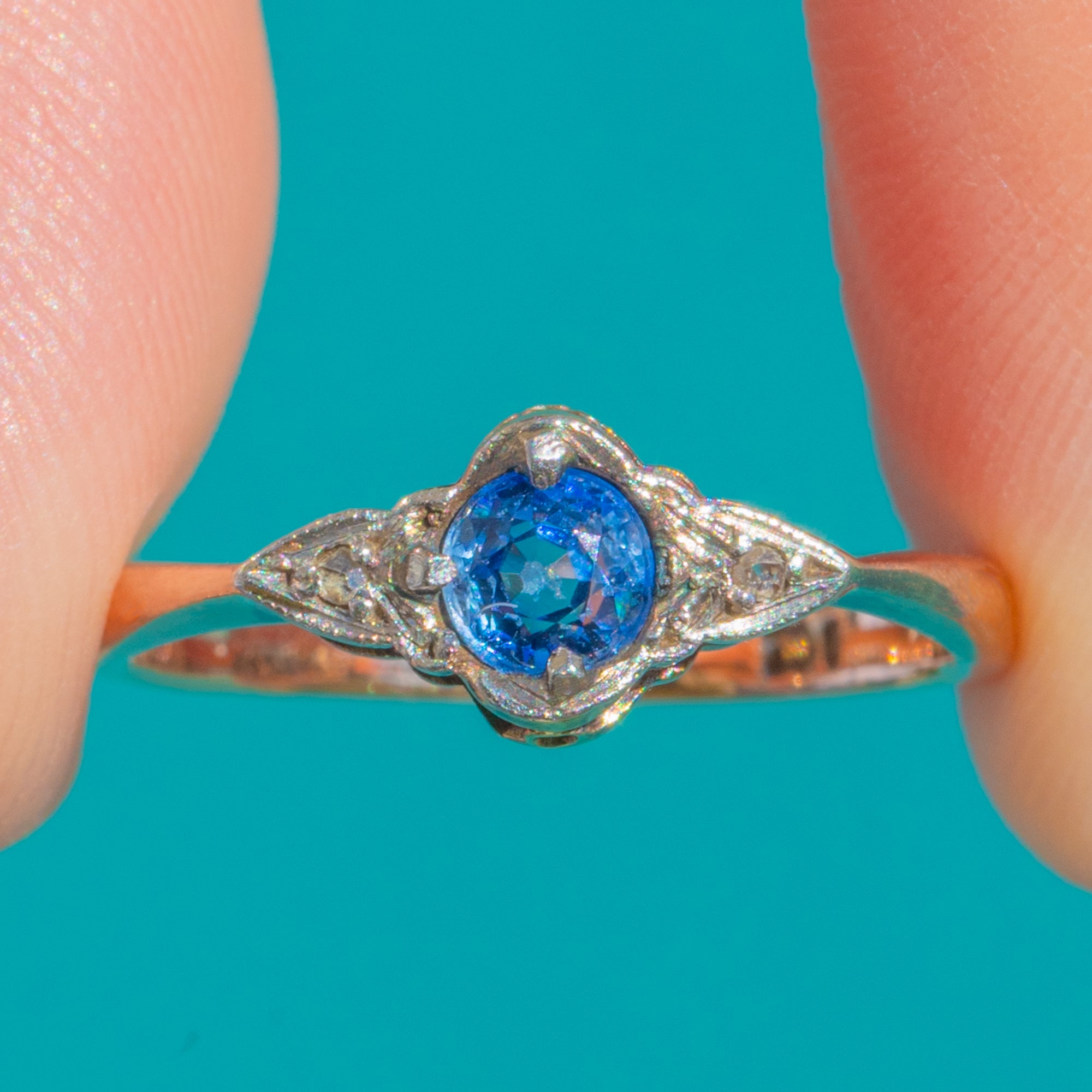 A delicate early 20th-century beauty, this antique ring centres a vivid, cornflower-blue Sapphire framed by a white-toned, milgrained head and flanked by twinkling rose-cut Diamond accents. The low, hand-finished collet and pierced gallery lend wonderful finesse, while the slender warm Gold shank creates an elegant two‑tone look that feels timeless on the hand.