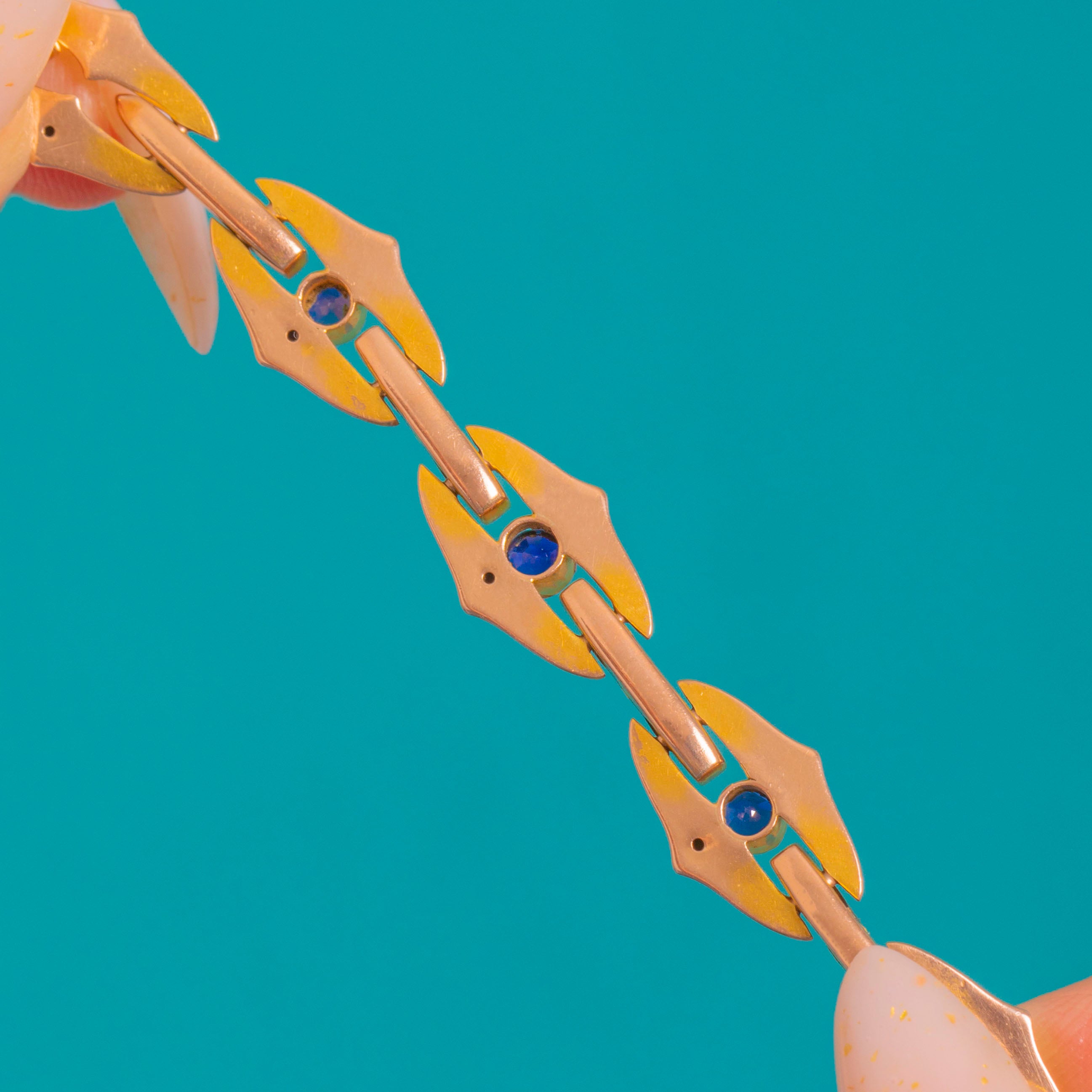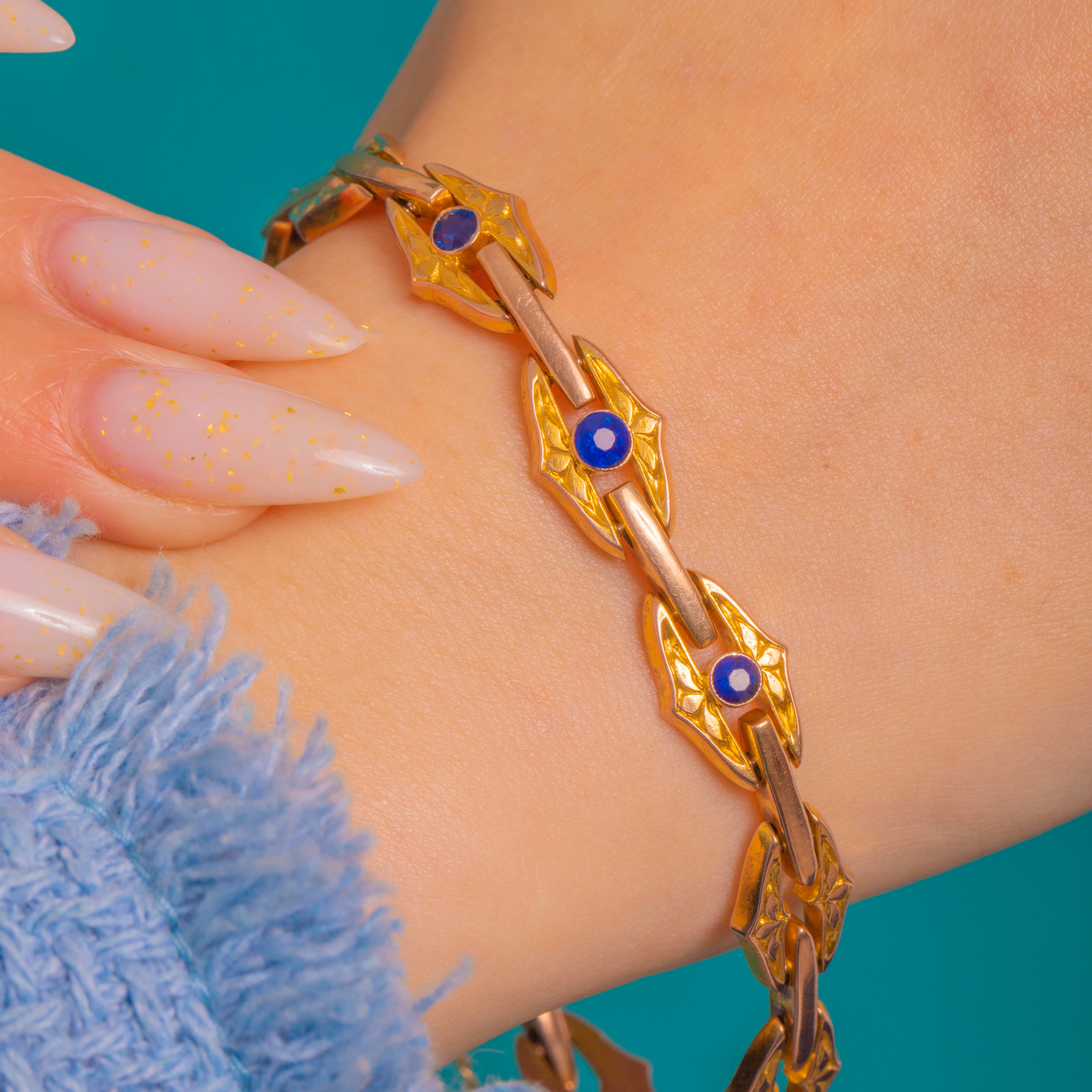 A refined Victorian bracelet crafted in two-tone 9ct Gold, its warm rose Gold bars alternating with elegant yellow Gold navette plaques. Each plaque is softly chased and centred with a round Sapphire in a neat rubover setting, creating a rhythmic line of vivid blue highlights across the wrist.