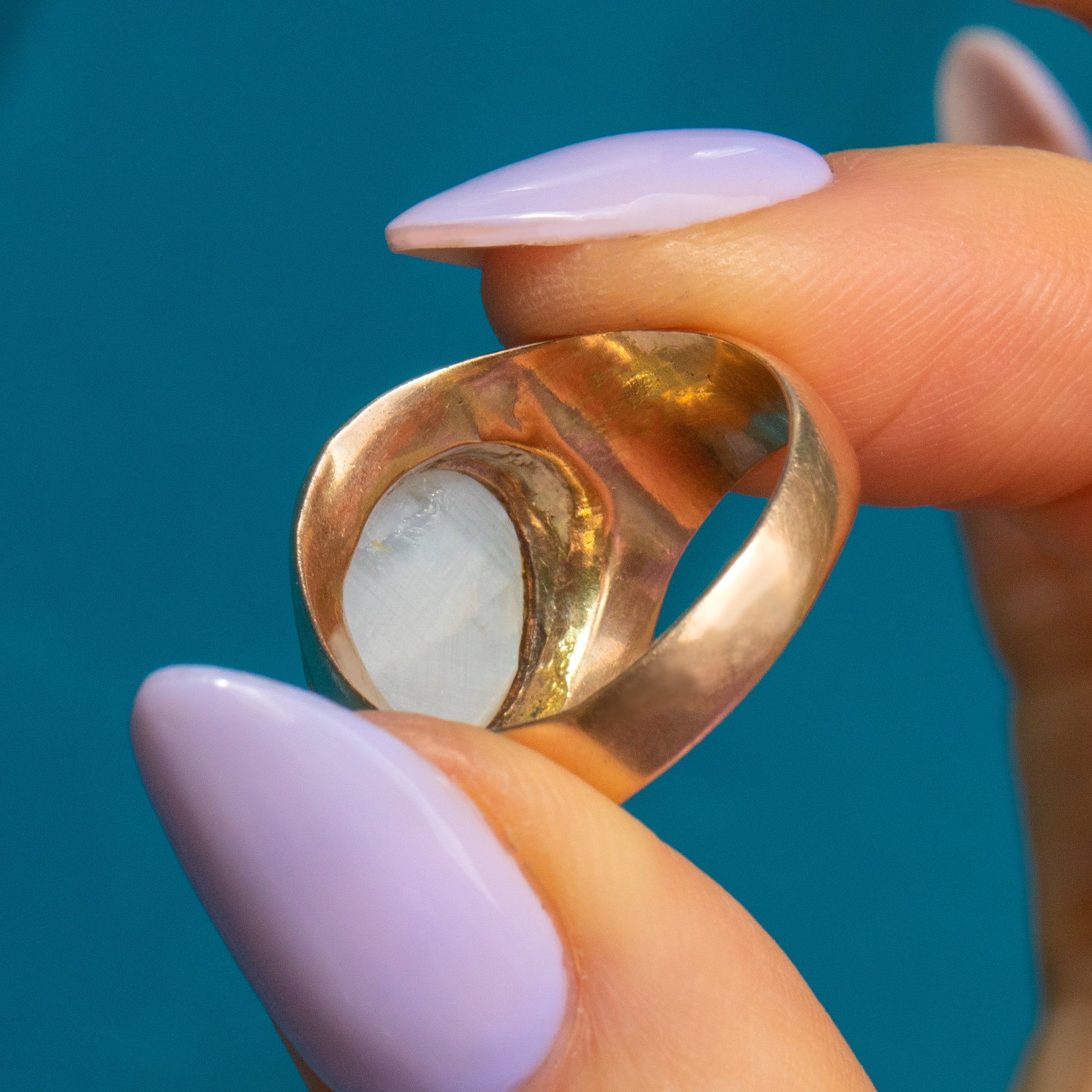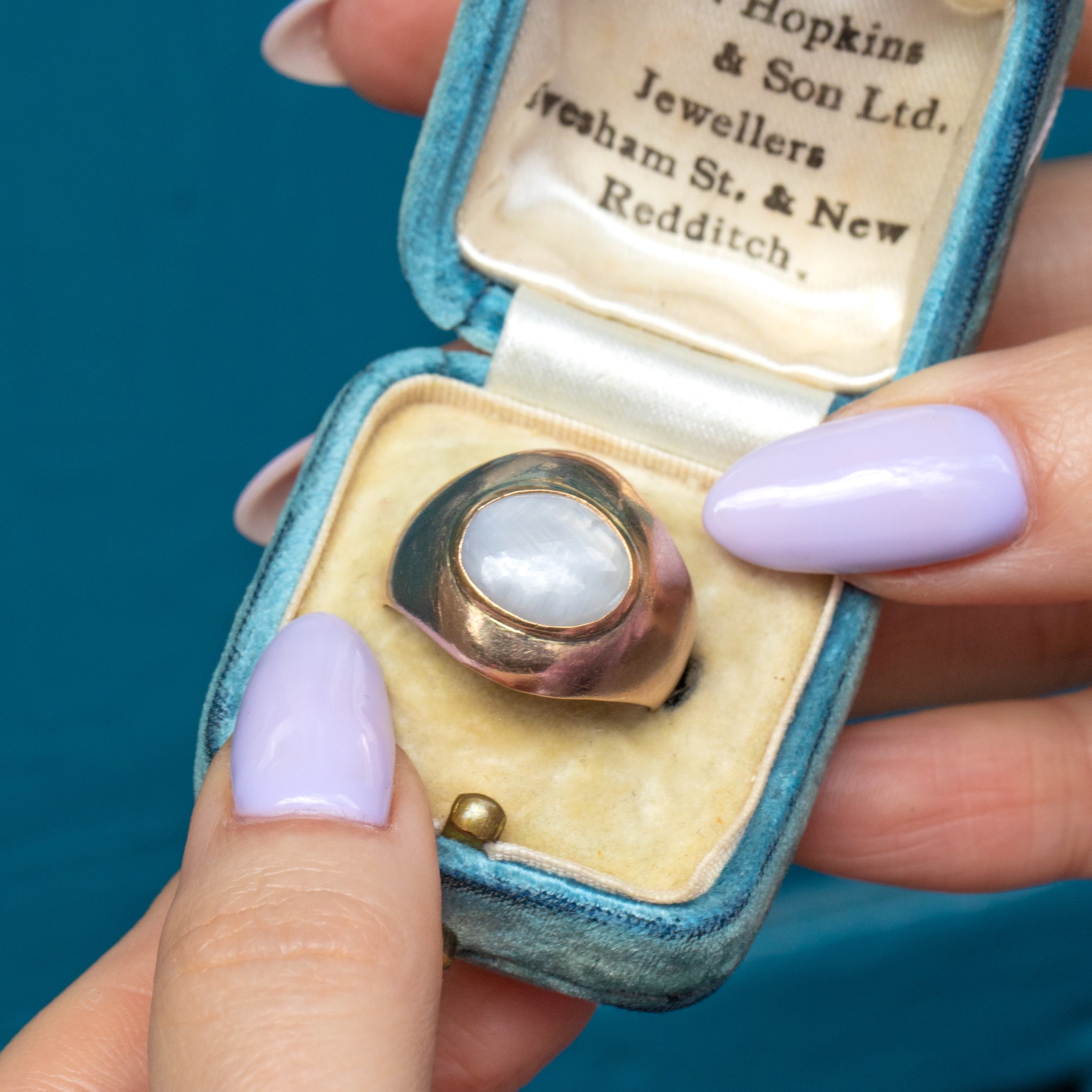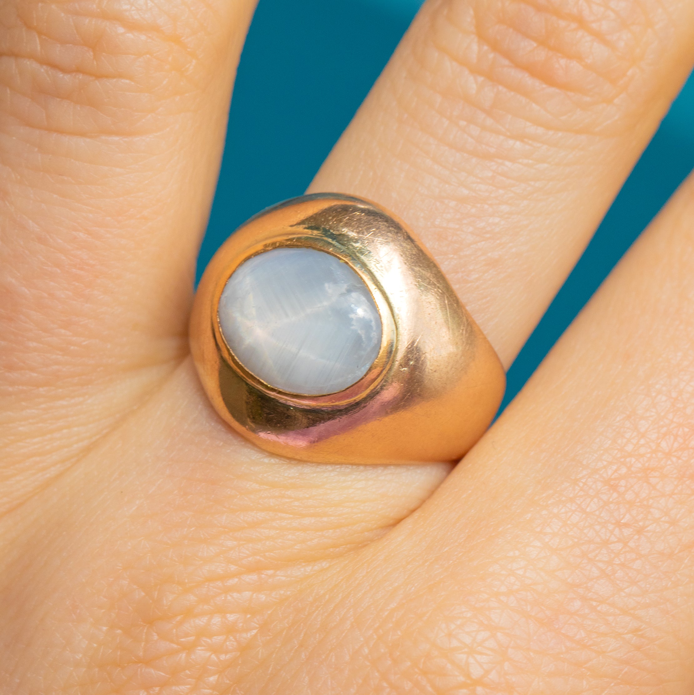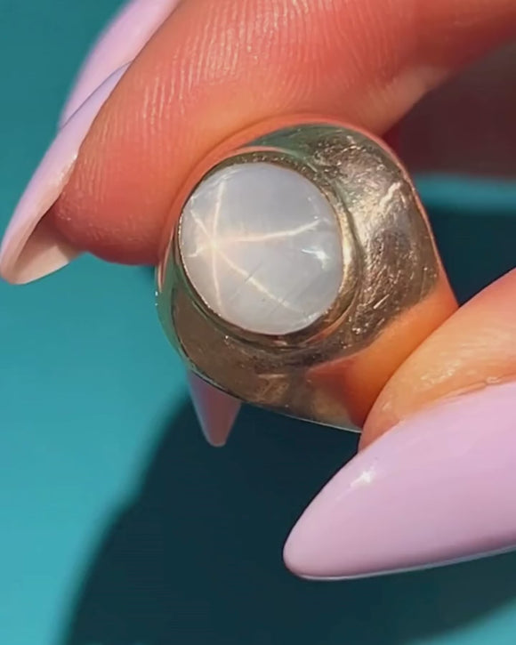 What a spectacular piece this chunky antique 9ct Gold star Sapphire signet ring is! With a 3.75ct galactic cabochon star Sapphire, the impressive ring face possesses a pool of pastel tones and a strong star running across her surface beneath the light!