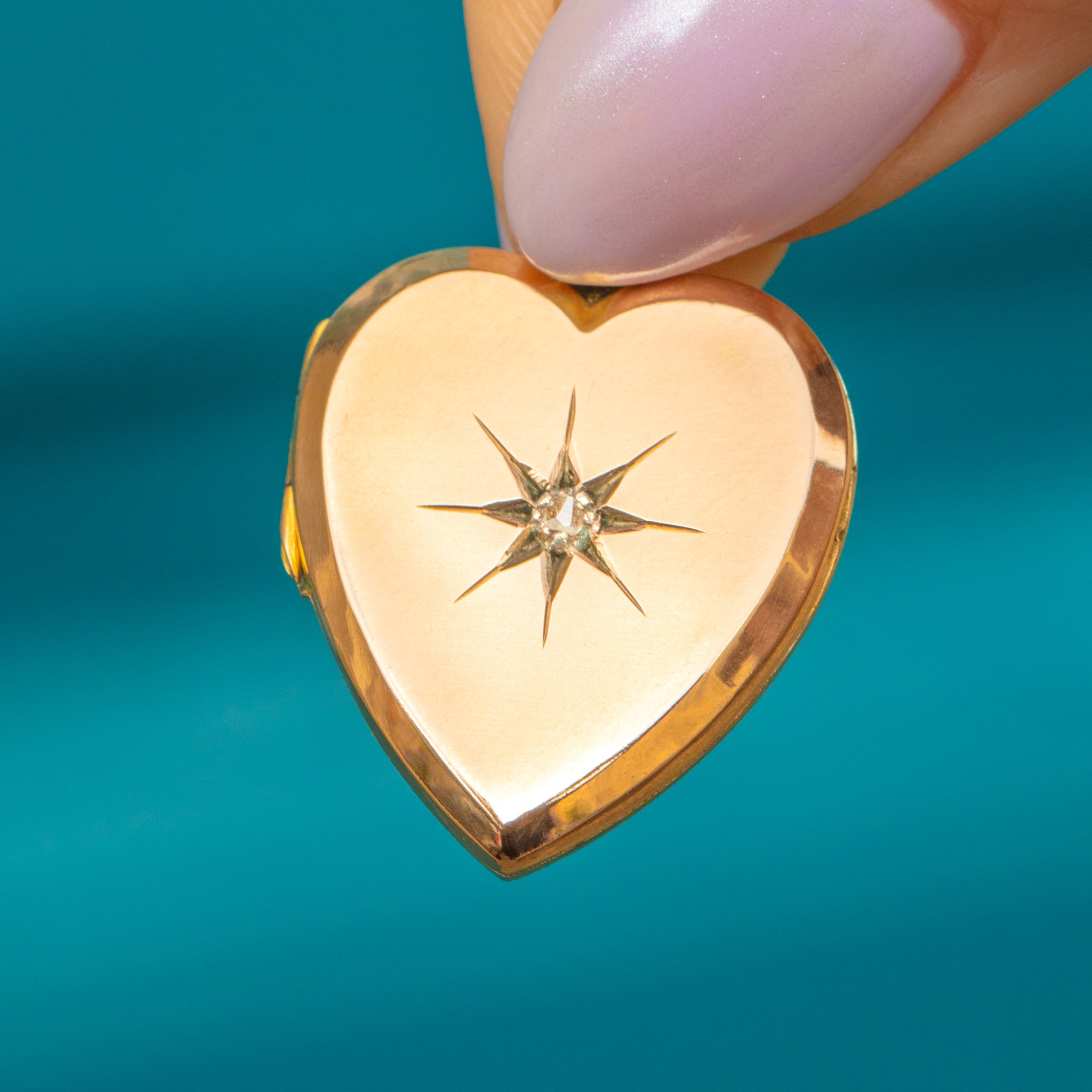 We simply adore this antique 9ct Gold Diamond star-set heart locket! This piece features a single star set rose-cut Diamond at her centre, adding a delightful sparkling accent.