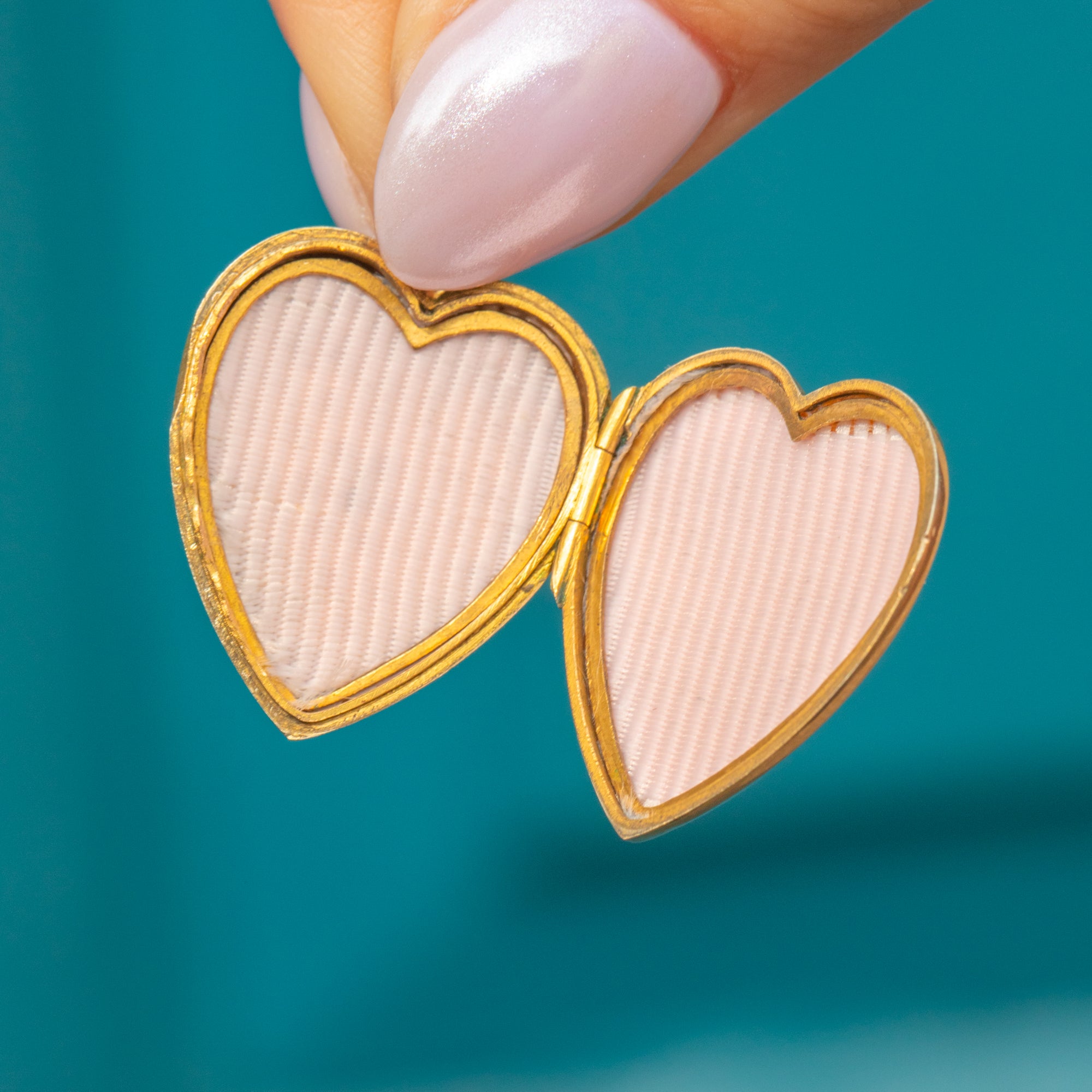 EXCELLENT. This antique 9ct Gold star set Diamond heart locket is in fabulous condition! Her heart shape has kept its her delightful form and her Gold has a lovely saturated hue throughout. The Diamond is securely set and the star outline is crisp. Complete with space for two photos to be placed inside, this Victorian heart locket is ready to be worn with pride!