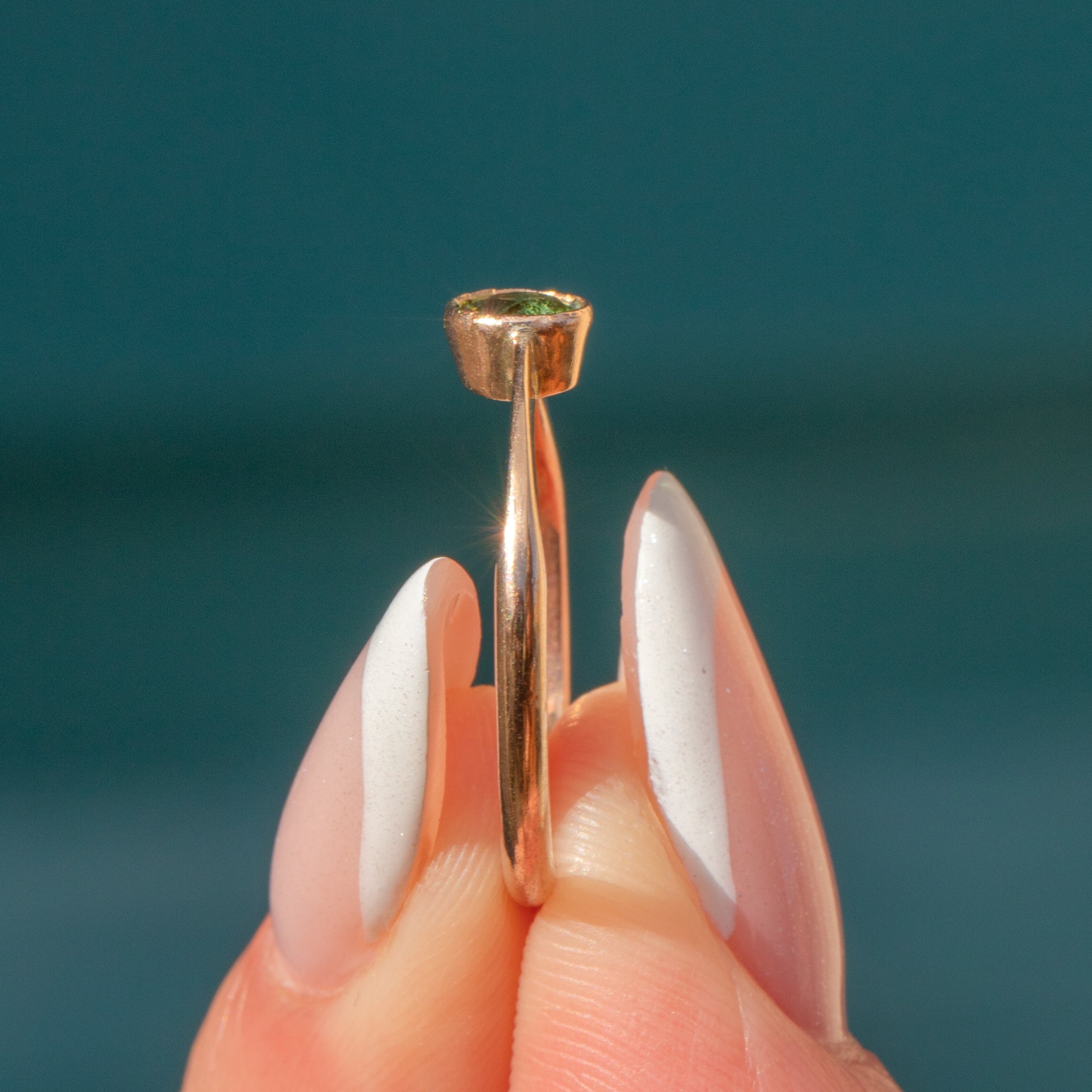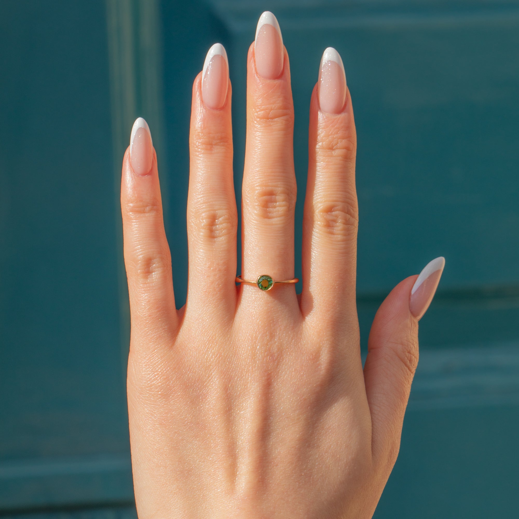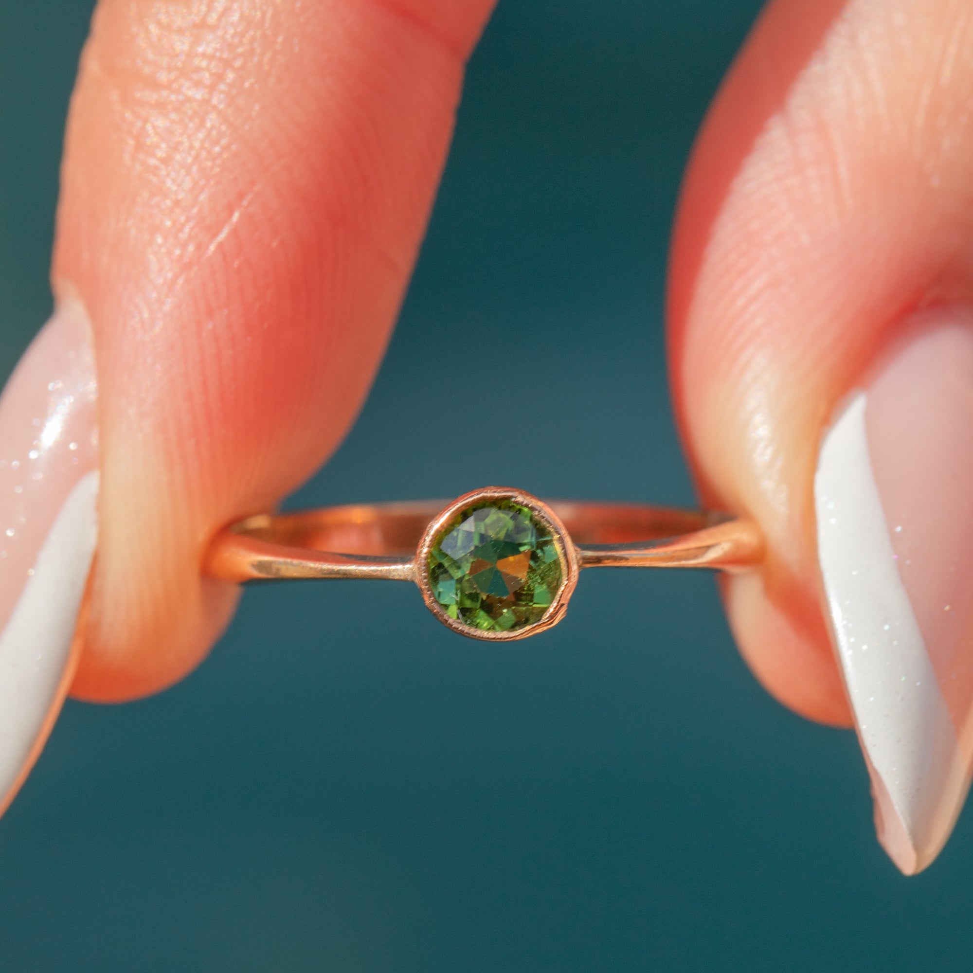 With a rosy-warm 9ct Gold band and setting effortlessly complementing the saturated green Tourmaline, you can wear this petite ring alone or stacked alongside your collection.