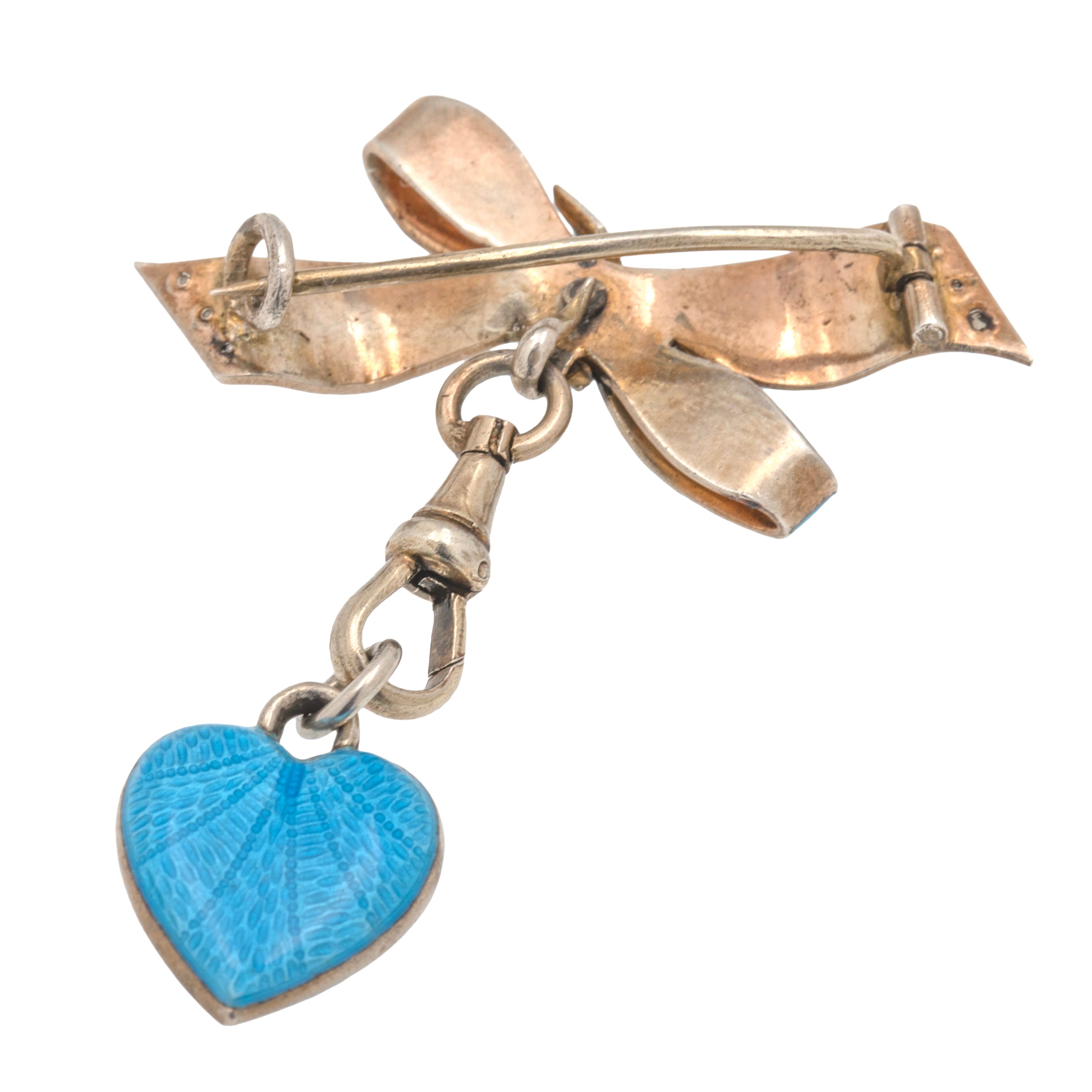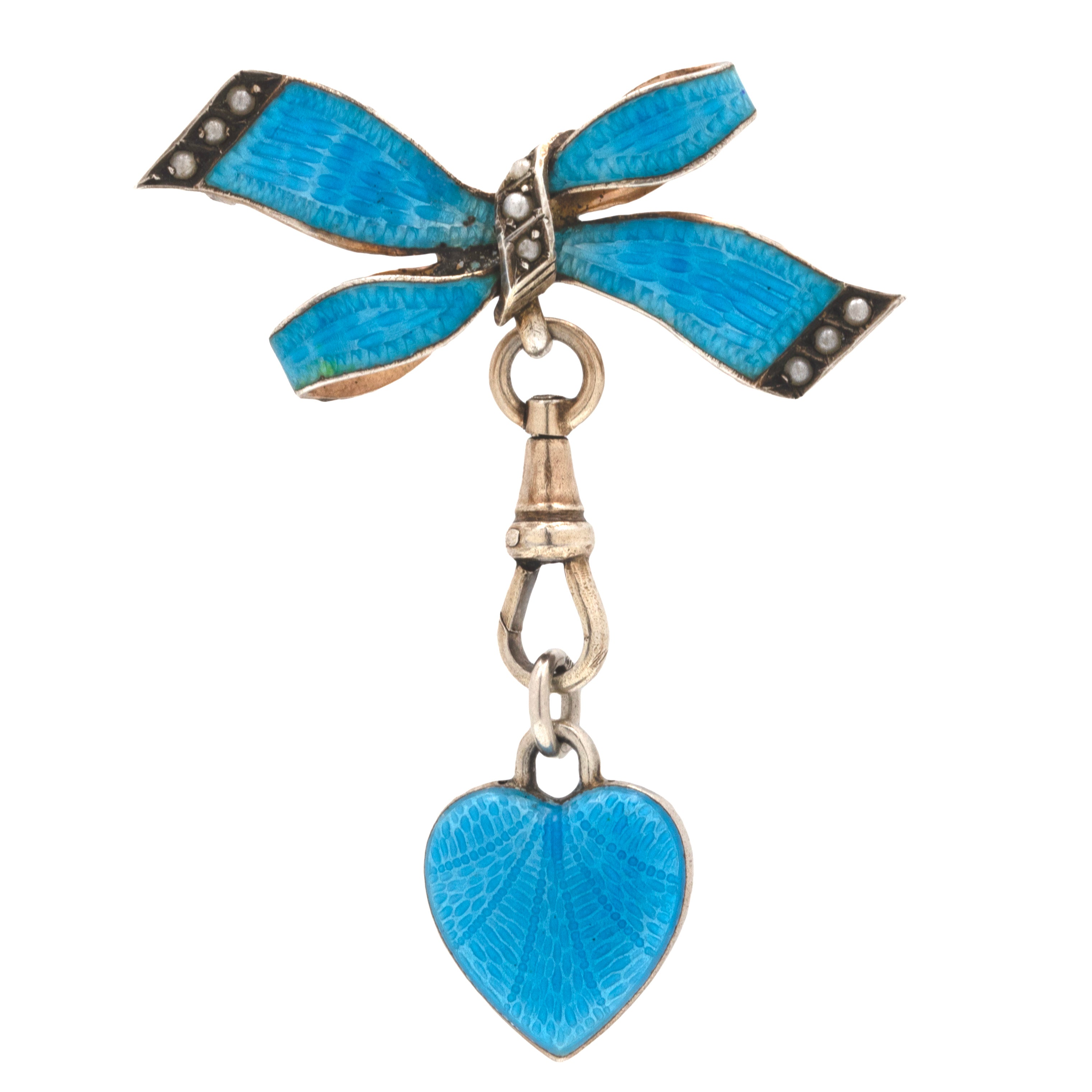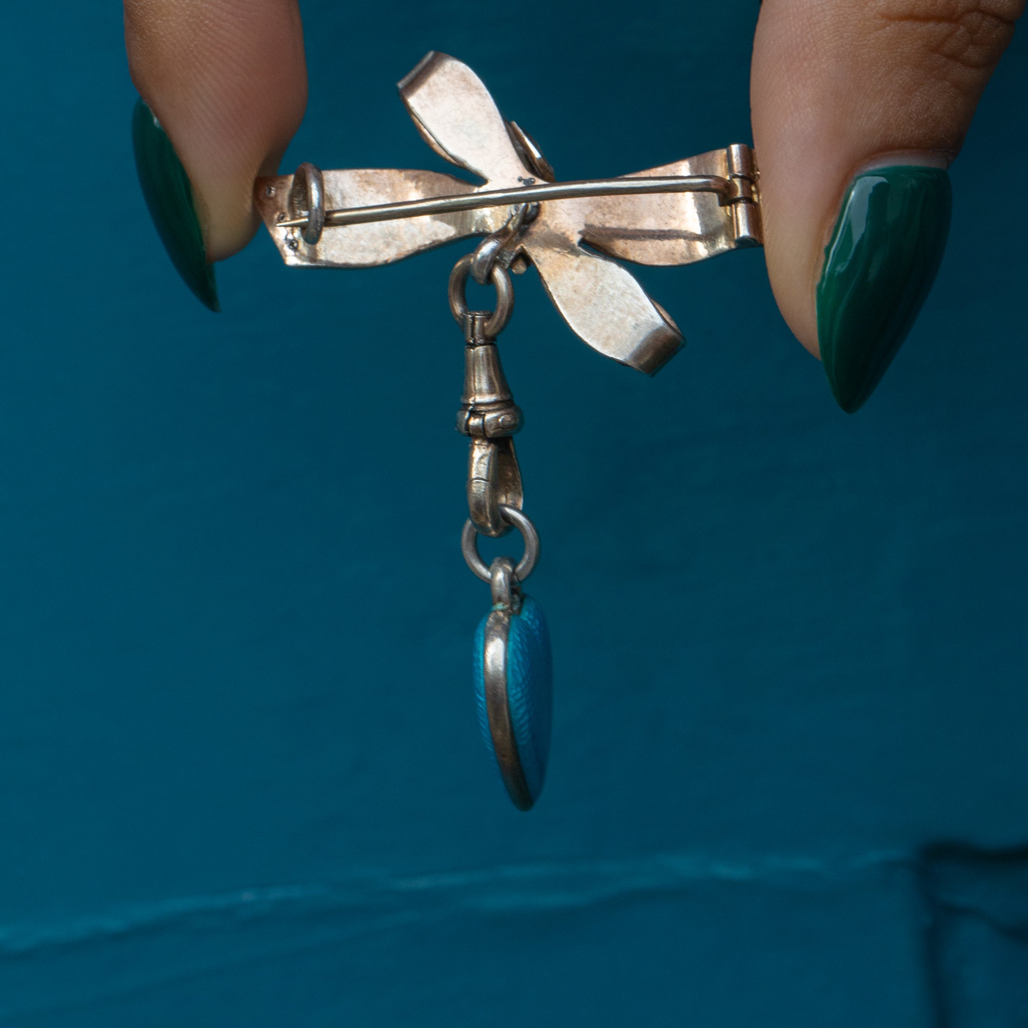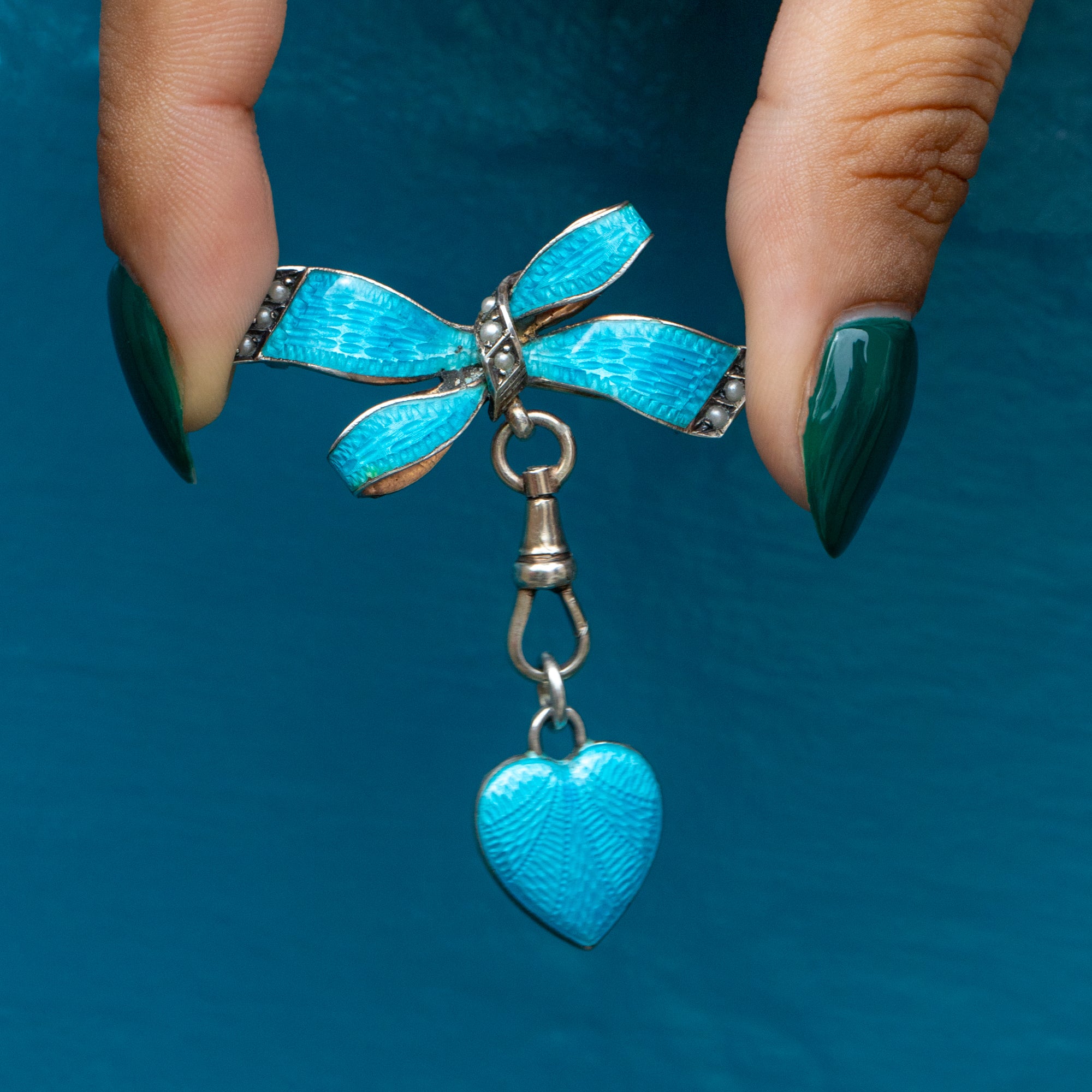 Making this antique blue Enamel Pearl brooch yours will open up a world of styling opportunities! Unapologetically early 20th century, this Silver Enamel brooch features a whimsical bow suspending an antique Silver dog-clip encased entirely in powder blue Guilloché Enamel, with a dainty heart charm to match.