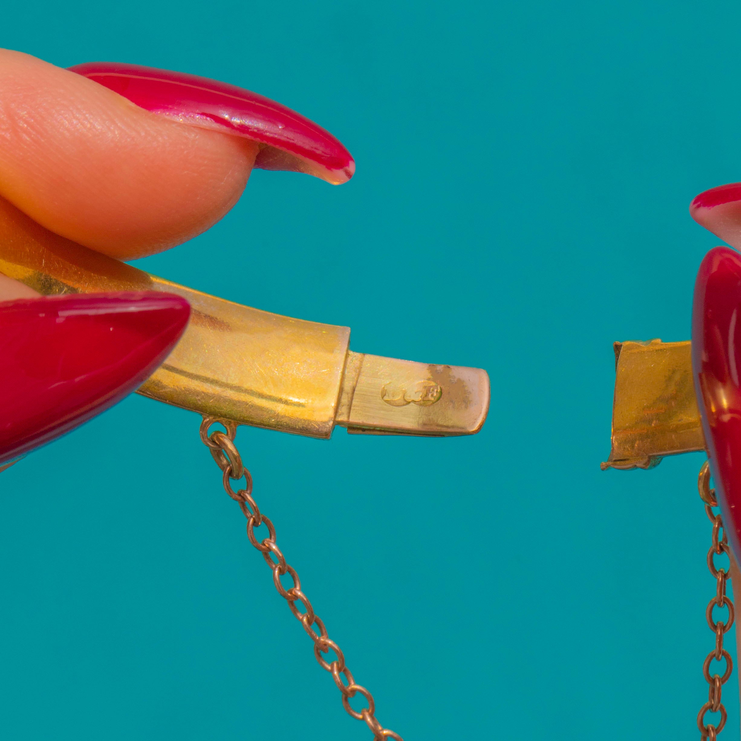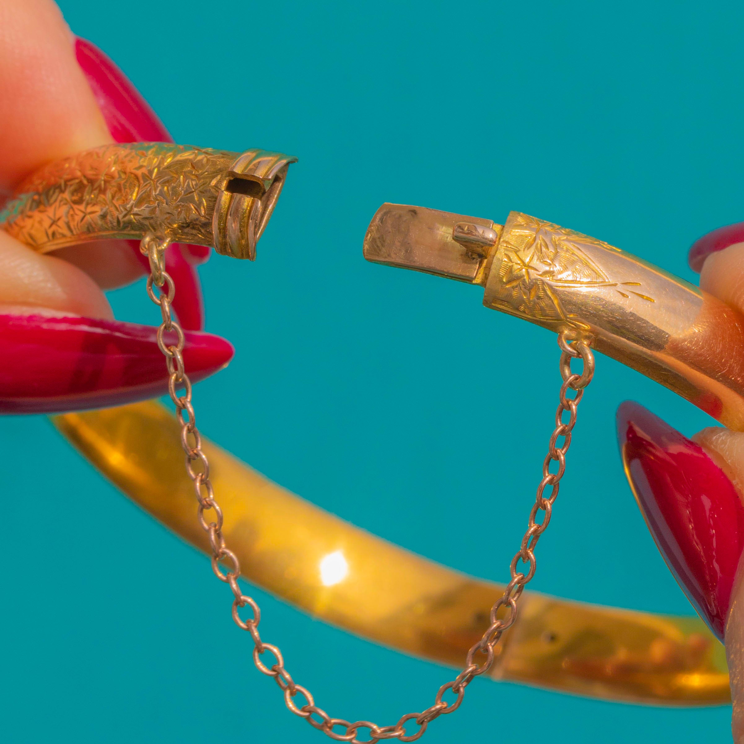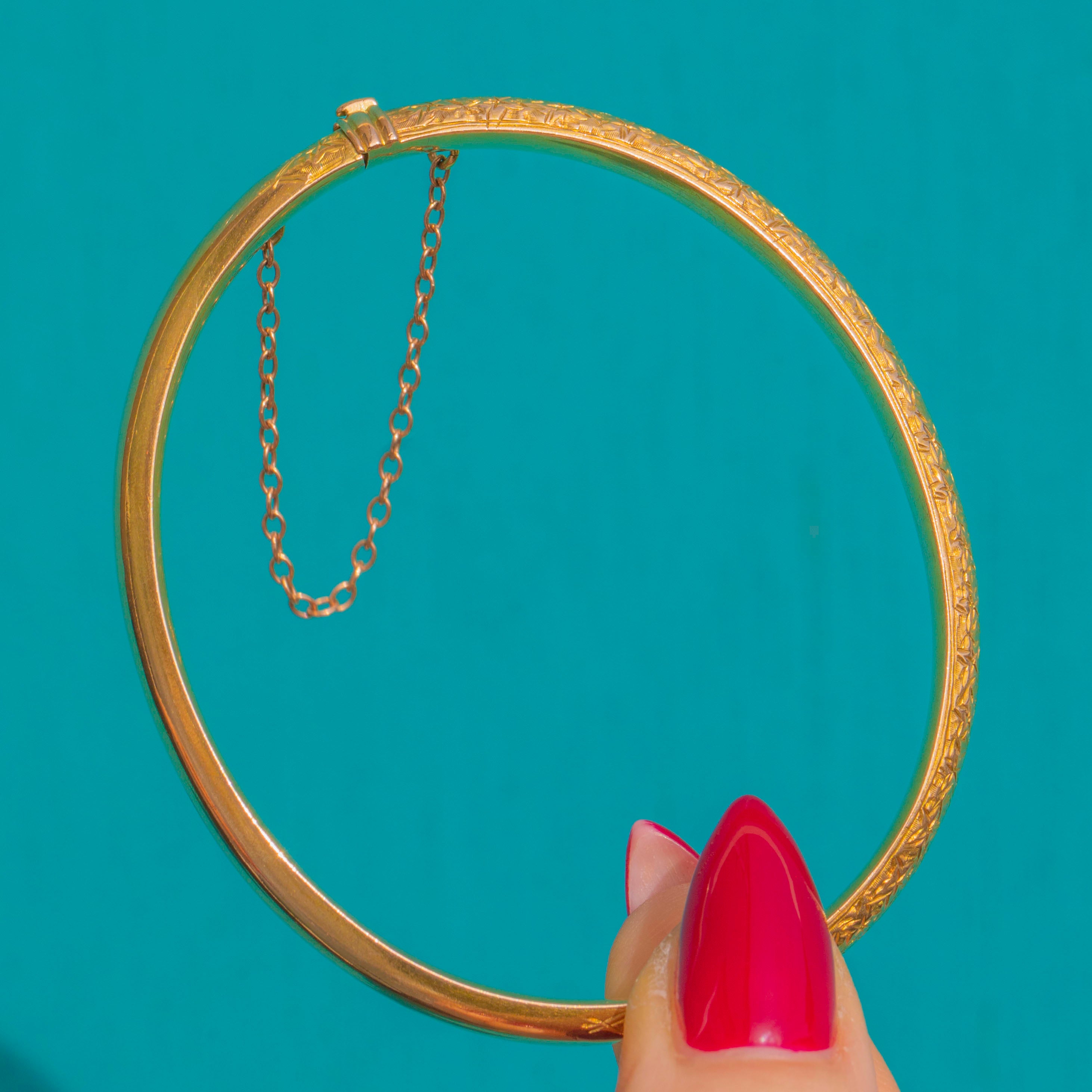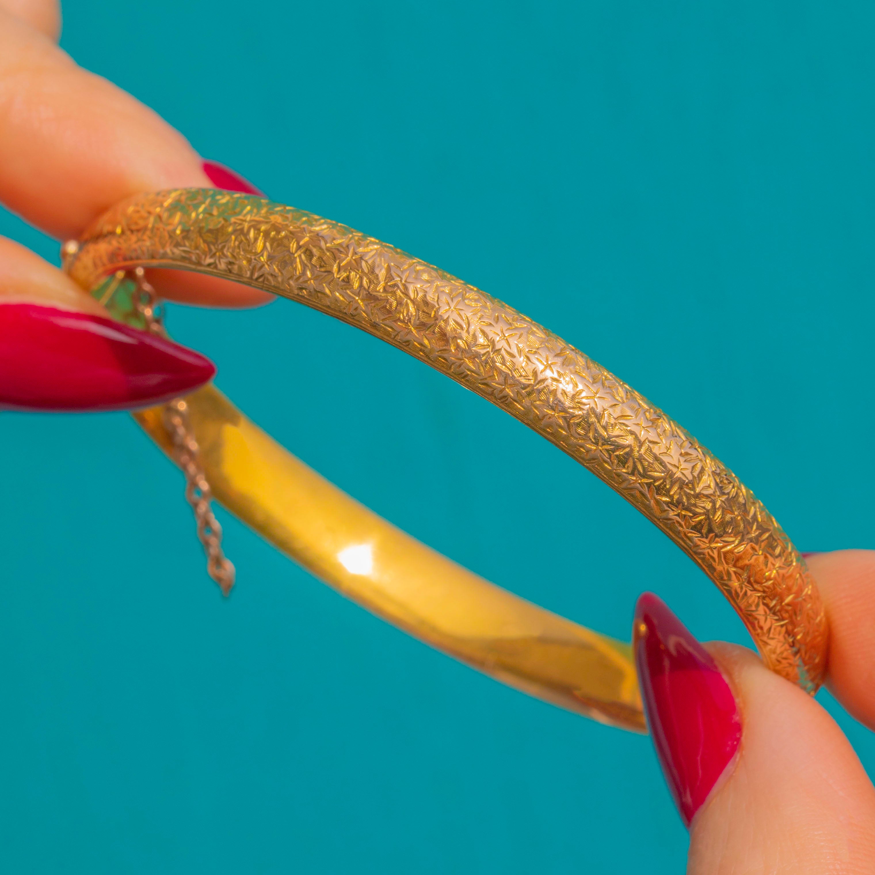 Refined yet charming, it closes with a neat tongue-and-box clasp and is further secured by a short safety chain. Worn solo or in a stack, this elegant Gold bangle brings a whisper of Edwardian romance to every ensemble.