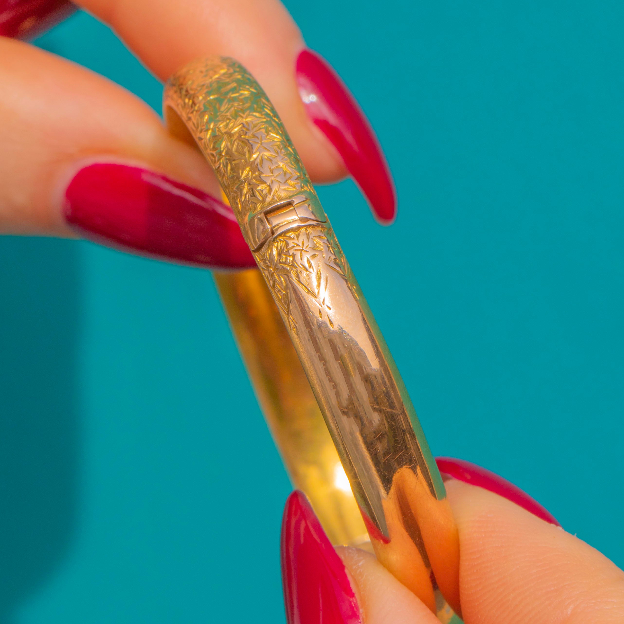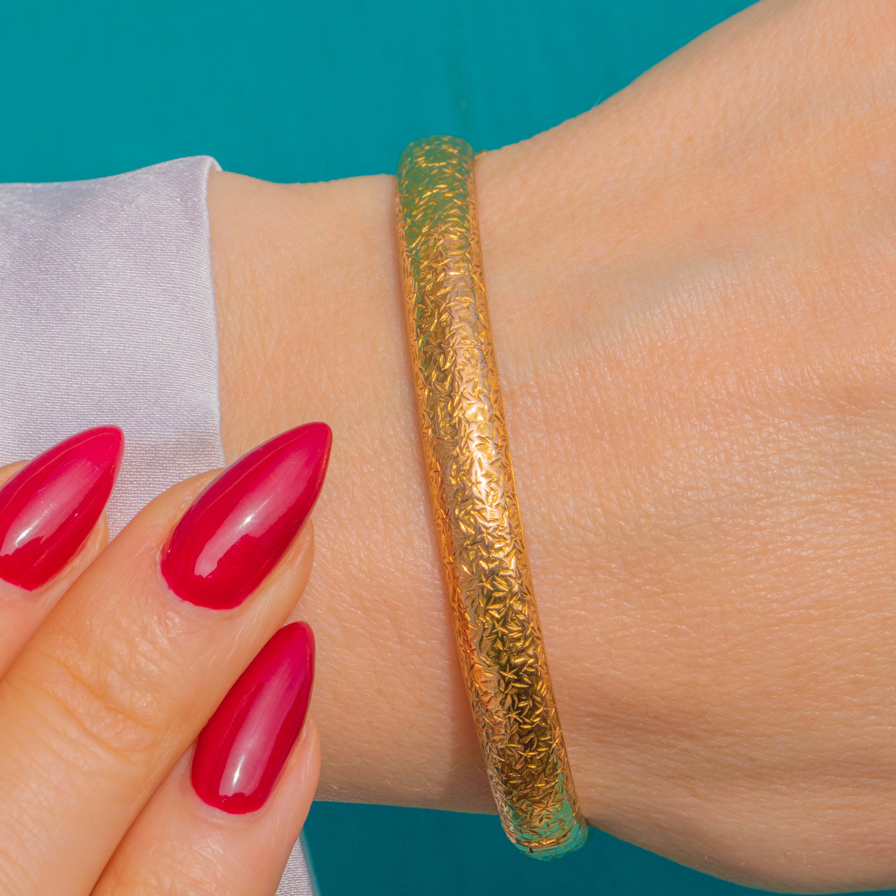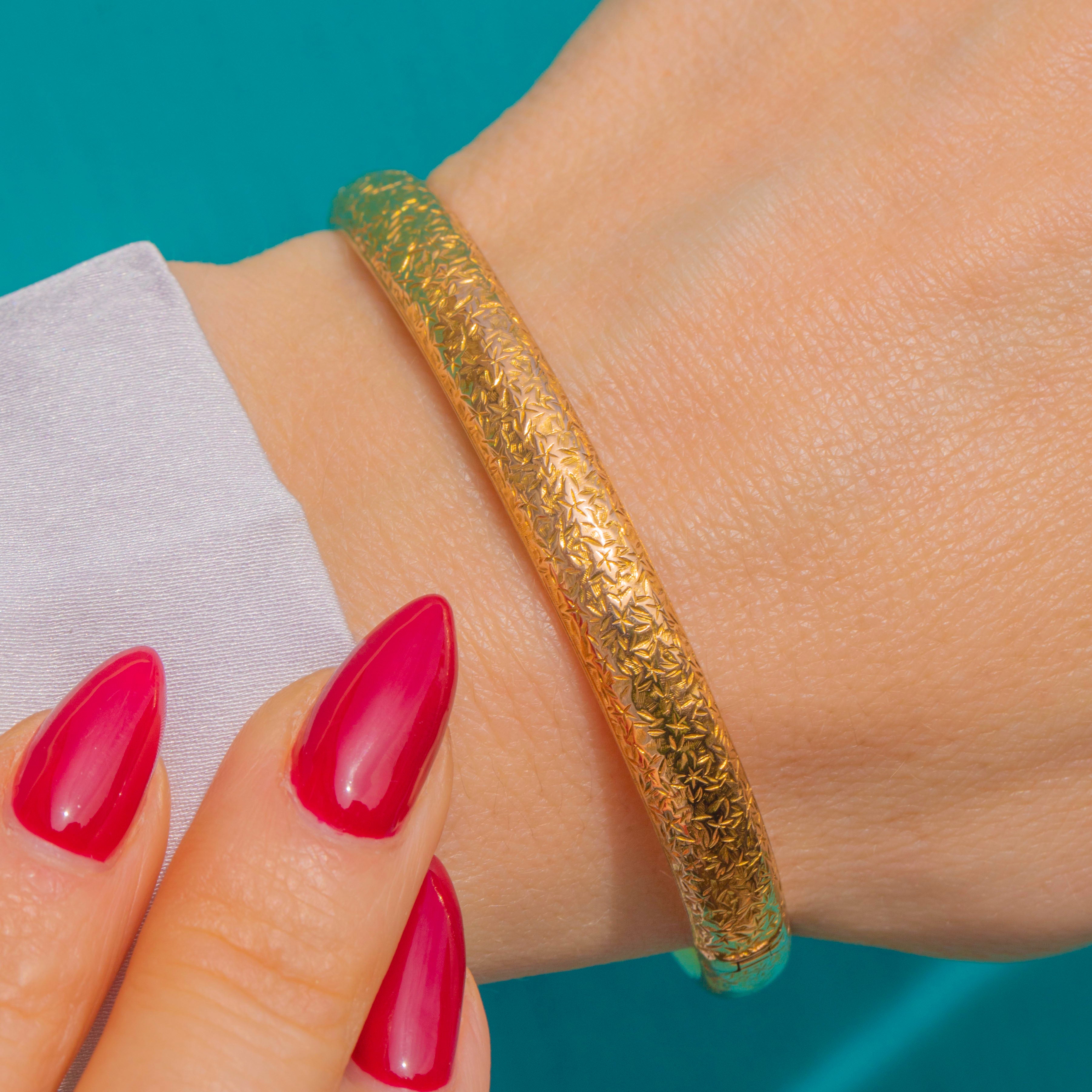 Butter-smooth and beautifully engraved, this antique 9ct Gold hinged bangle is a timeless Edwardian treasure. Its domed profile is richly adorned with crisp starburst and foliate motifs that dance with the light, while the interior remains sleek and polished for effortless wear.