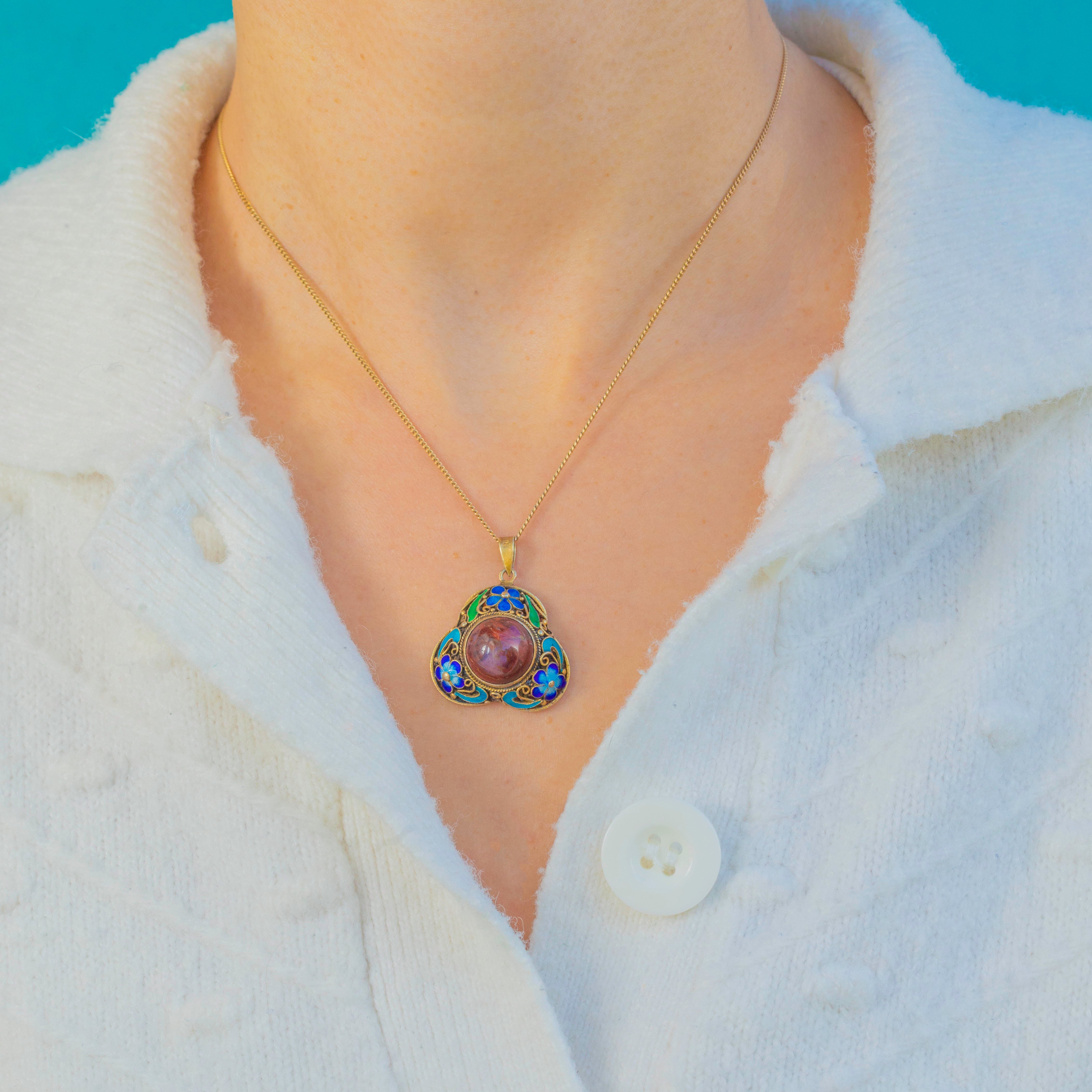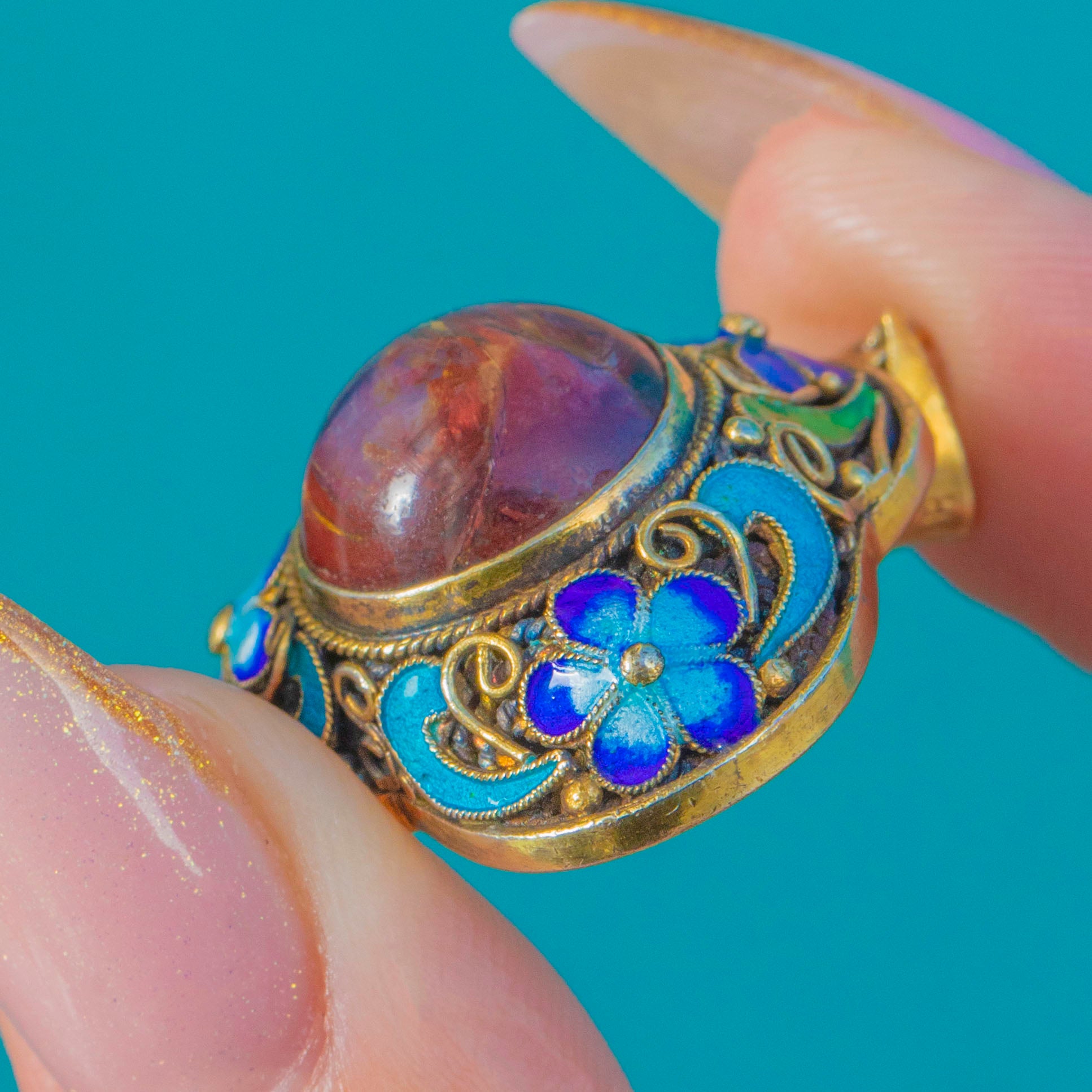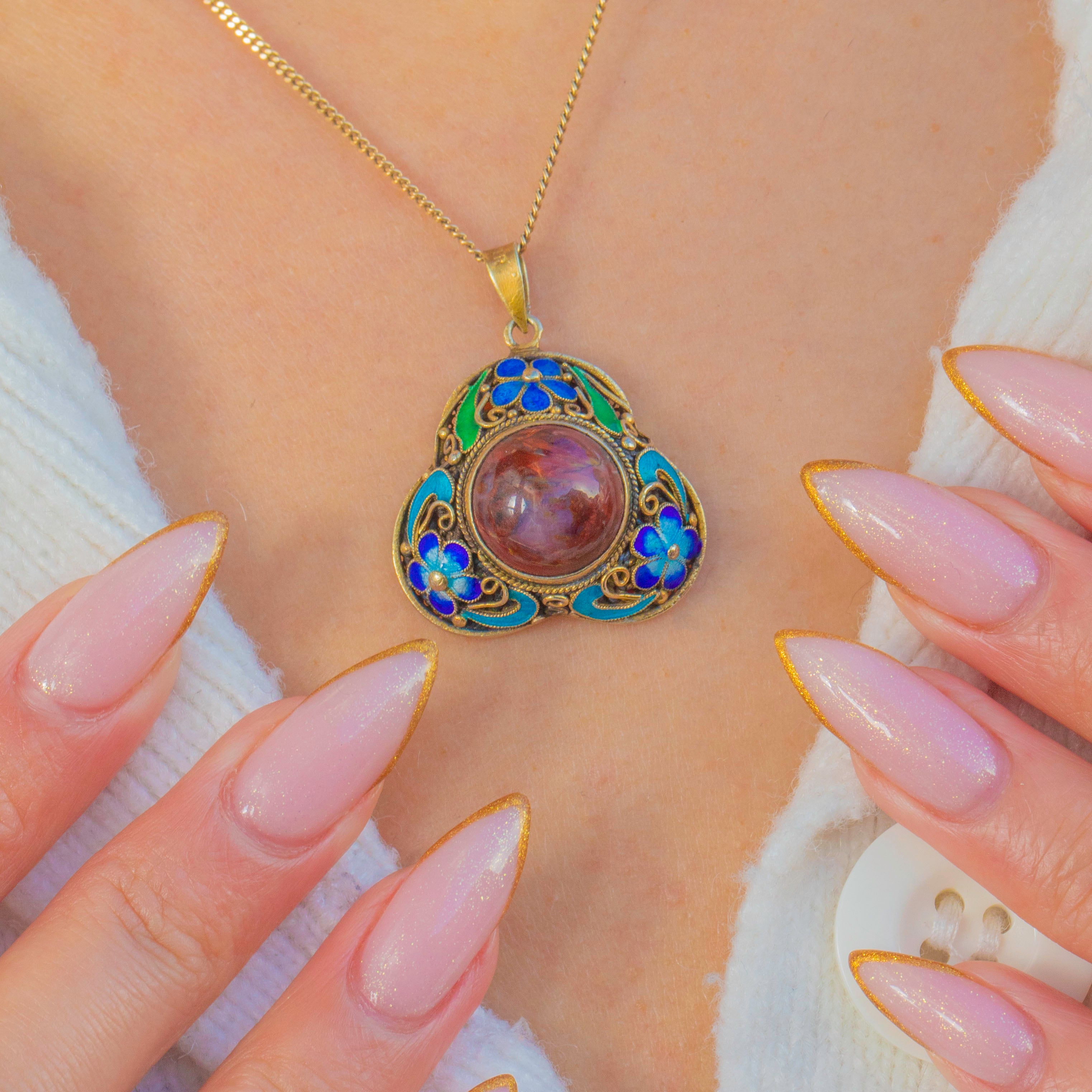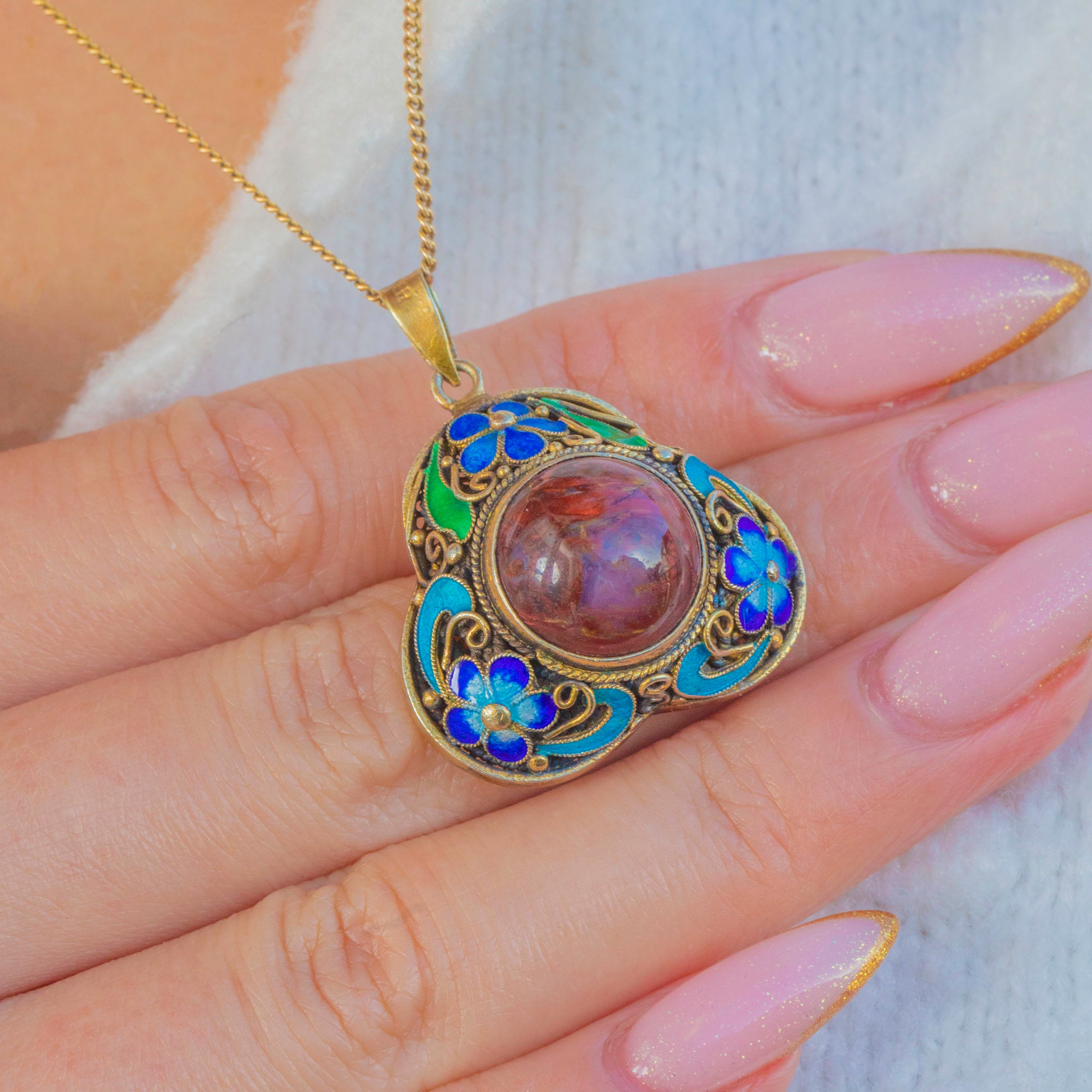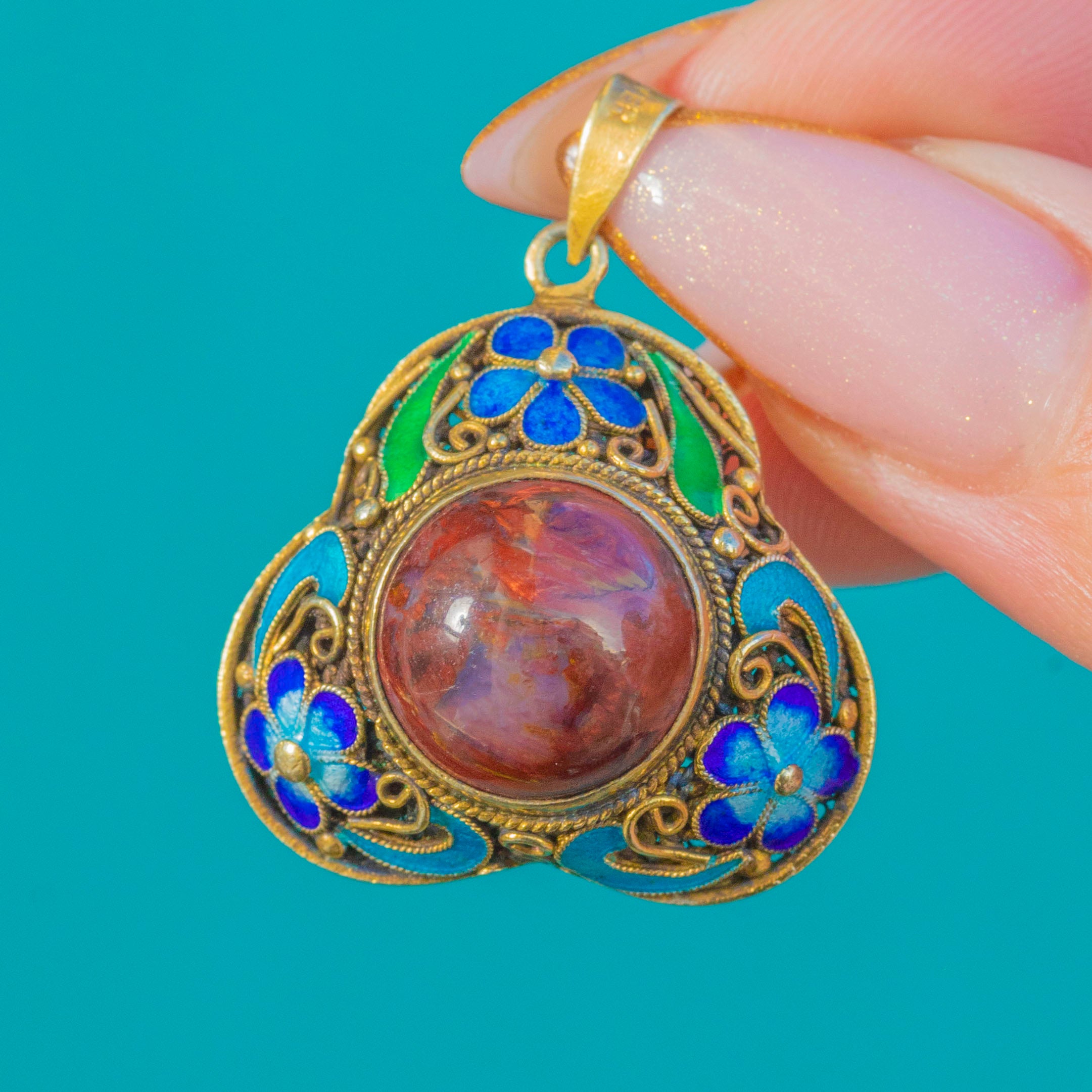 The pendant is crafted in gilded Silver and stamped “SILVER” on the bale, typical of Chinese export jewellery made for Western markets between c.1890 and 1930. Bold, colourful and beautifully made, it wears wonderfully as a standalone statement piece or layered with a favourite chain.