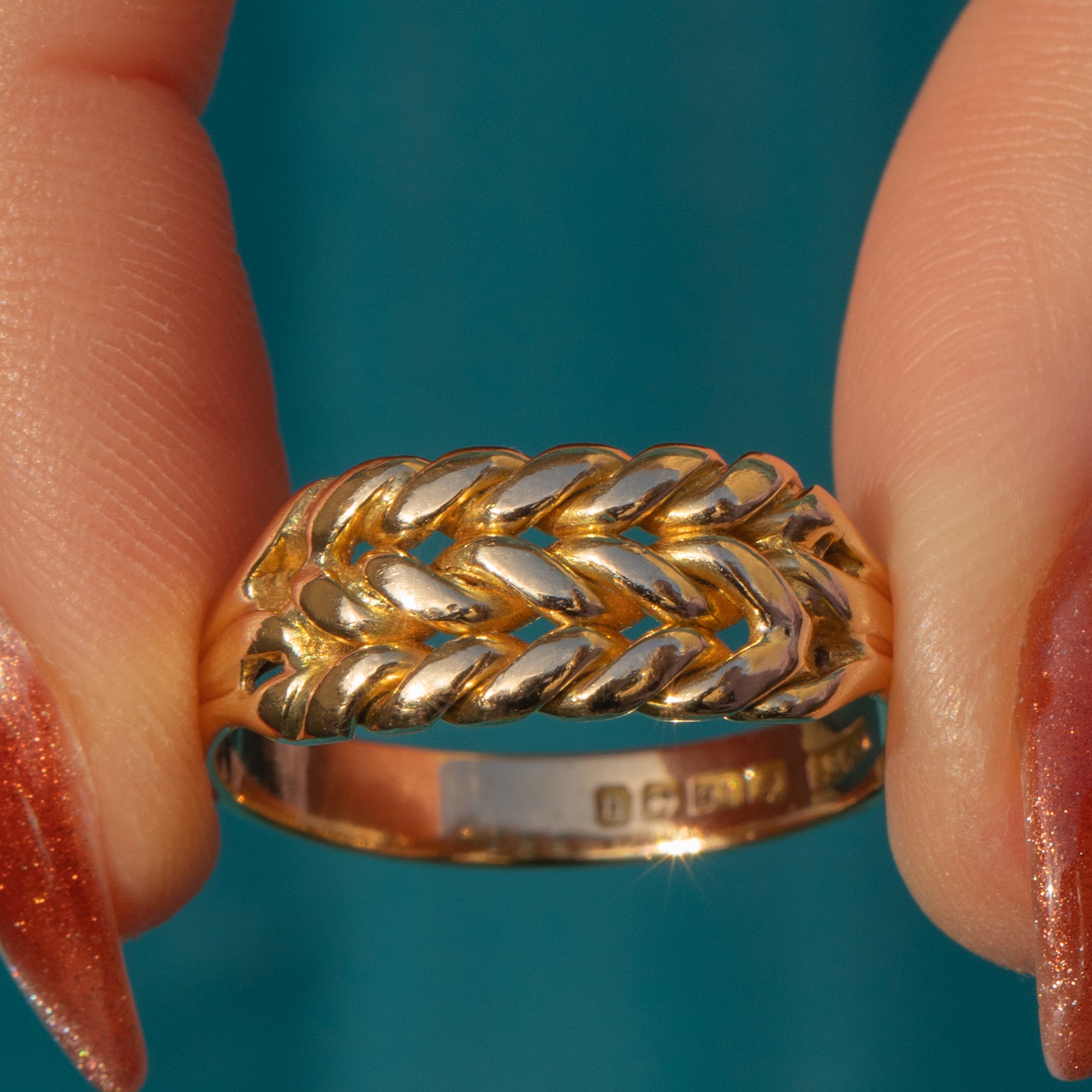 This substantial antique 18ct Gold keeper ring is a beautiful chunky piece suitable for everyday wear. With a beautifully braided face, this ring has a distinctive textural centre with a smooth surface, providing ample depth and lustre. This is an authentic antique piece dated with English hallmarks for the year 1919!