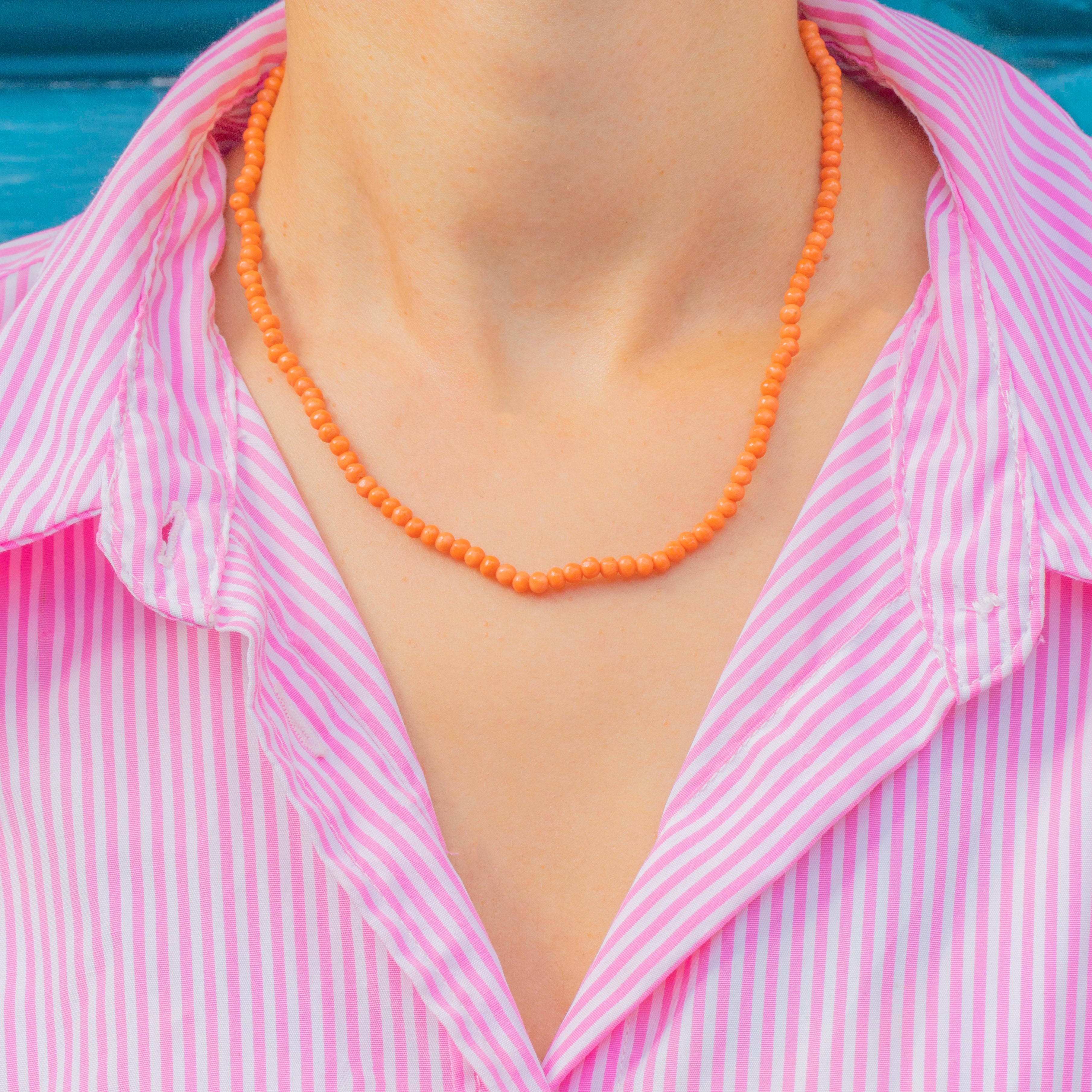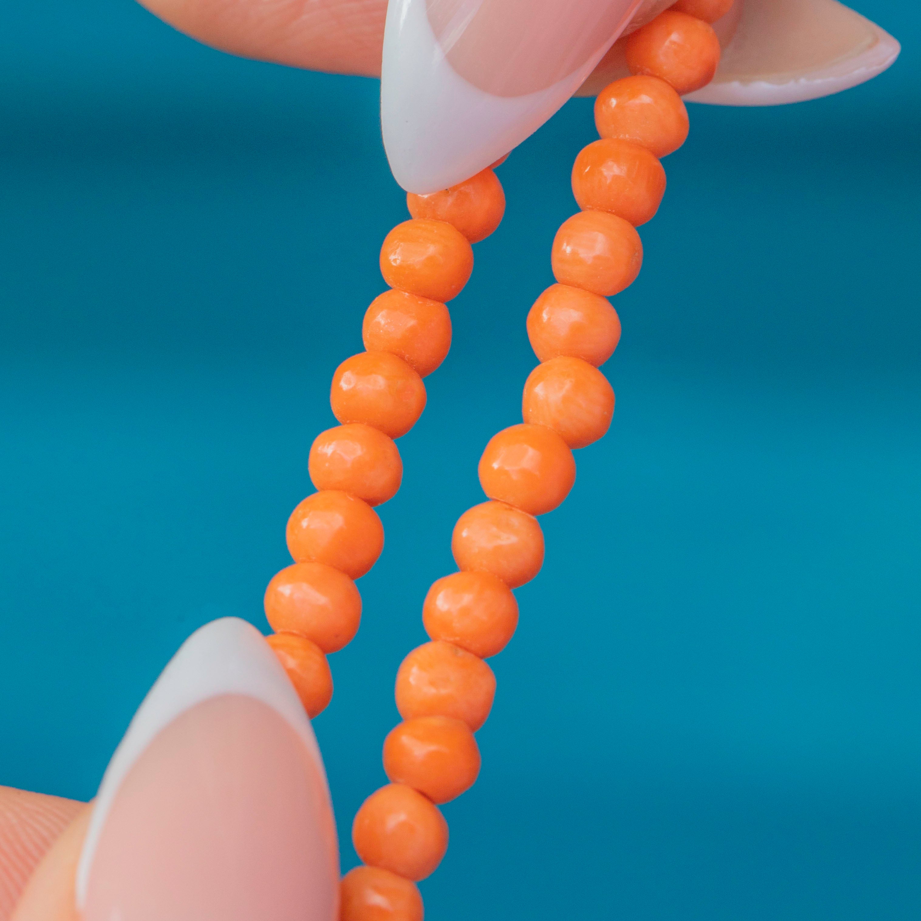 A delicate Antique Victorian Coral beaded necklace, strung with uniform beads of a rich, warm orange hue. Each Coral bead is beautifully polished, radiating a soft natural glow that makes this piece both charming and timeless. Its simplicity allows the natural beauty of the gemstones to shine, making it perfect for layering or wearing alone as a subtle statement.