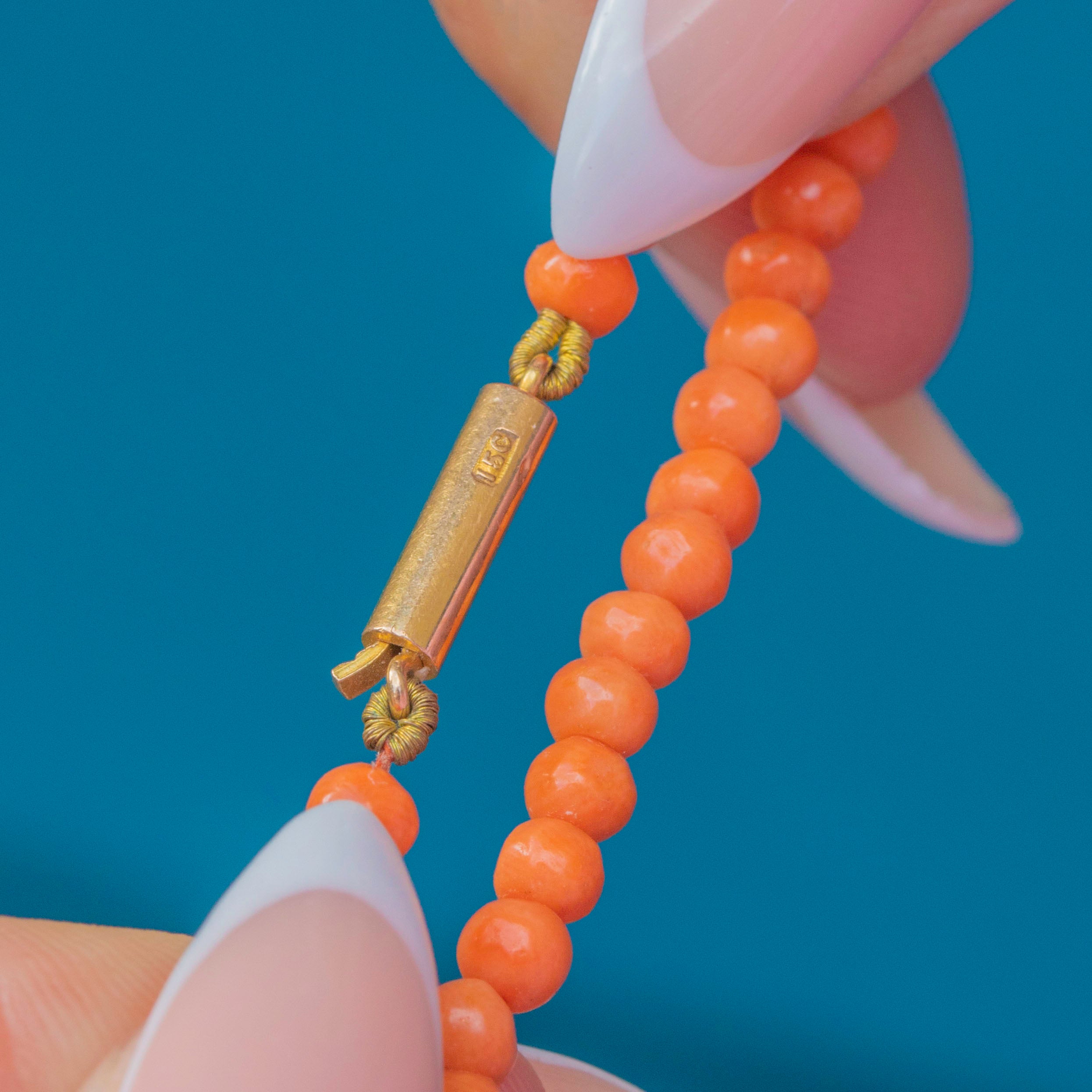 EXCELLENT: This necklace is in wonderful condition. The Coral beads are smooth and well-matched in colour, with no chips or cracks. The 15ct Gold barrel clasp is secure and in perfect working order, making the necklace ready to wear and enjoy.