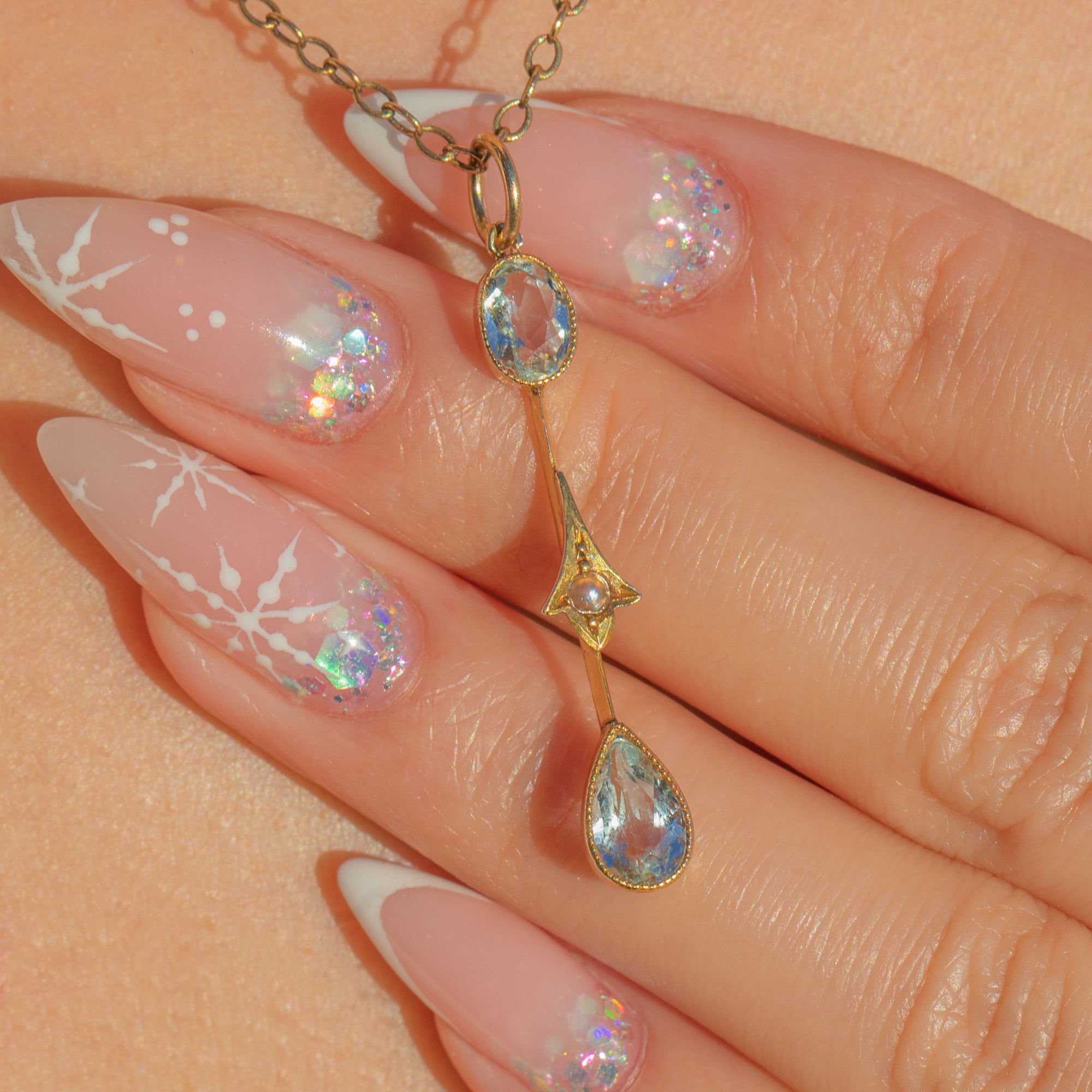 Airy and elegant, this Edwardian lavalier pendant is crafted in 9ct Gold with crisp millegraine detail. Two pale blue Aquamarines—an oval above and a pear drop below—sparkle with that soft, watery glow so beloved of the era, totalling approximately 0.65ct. Between them sits a tiny central Pearl, adding a luminous whisper of white.