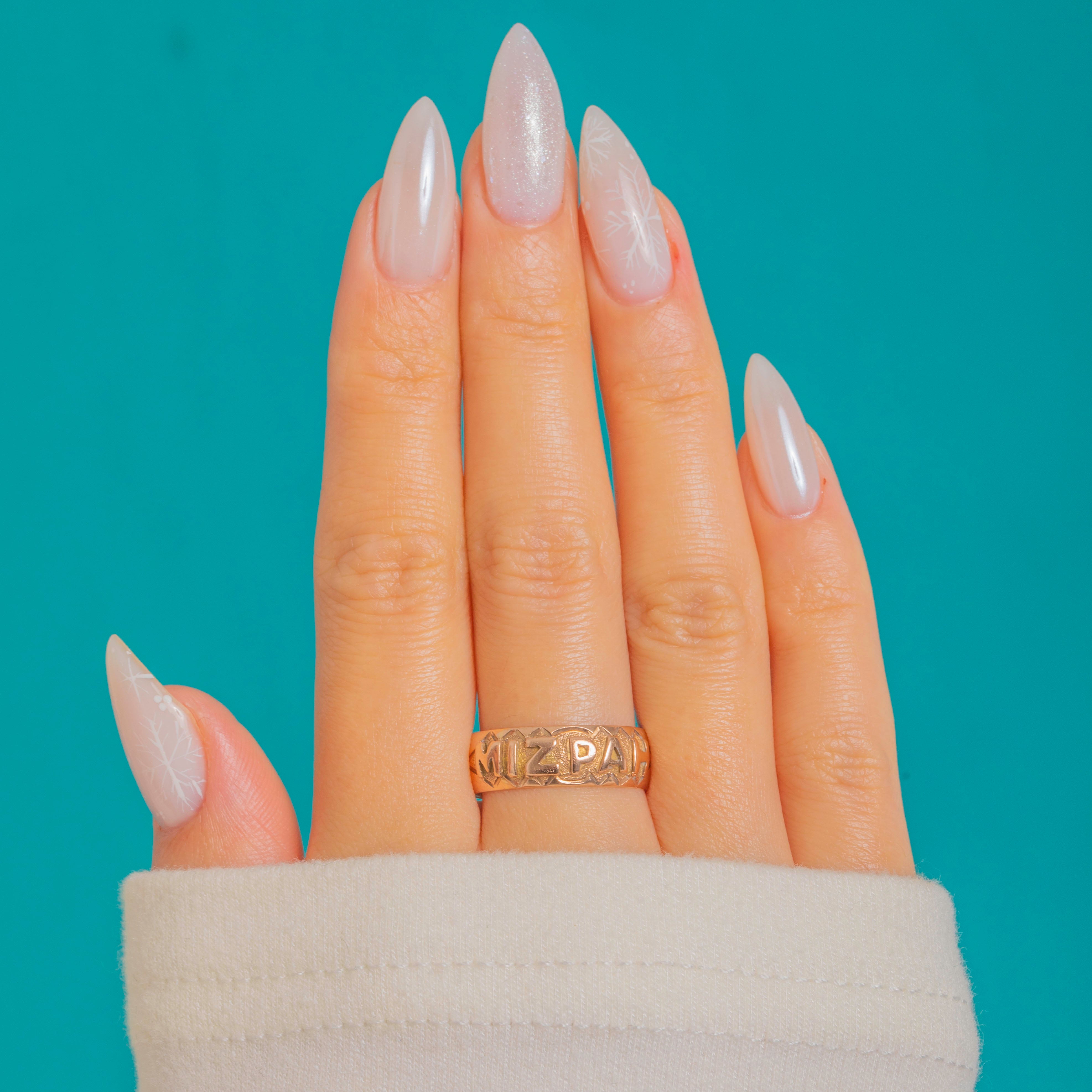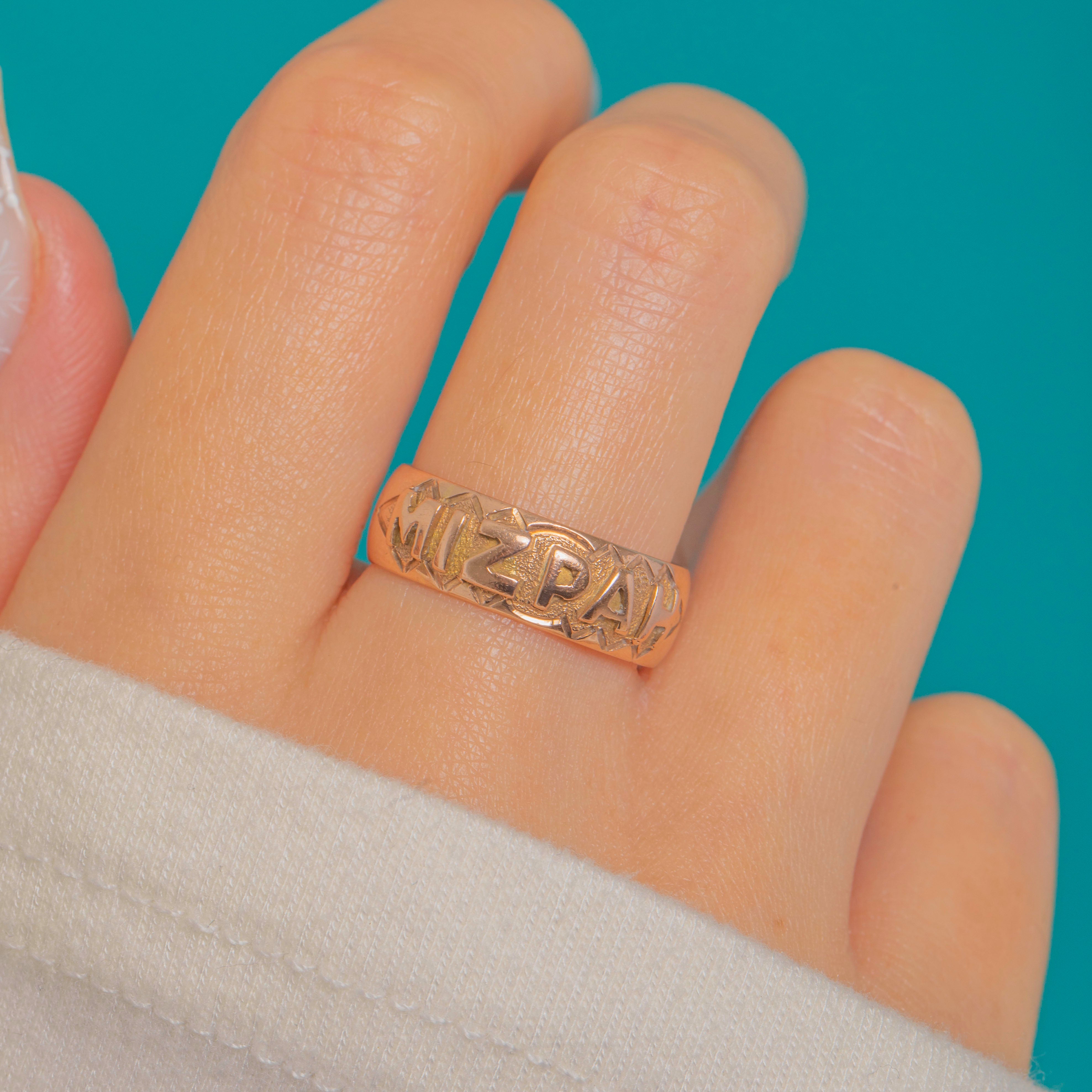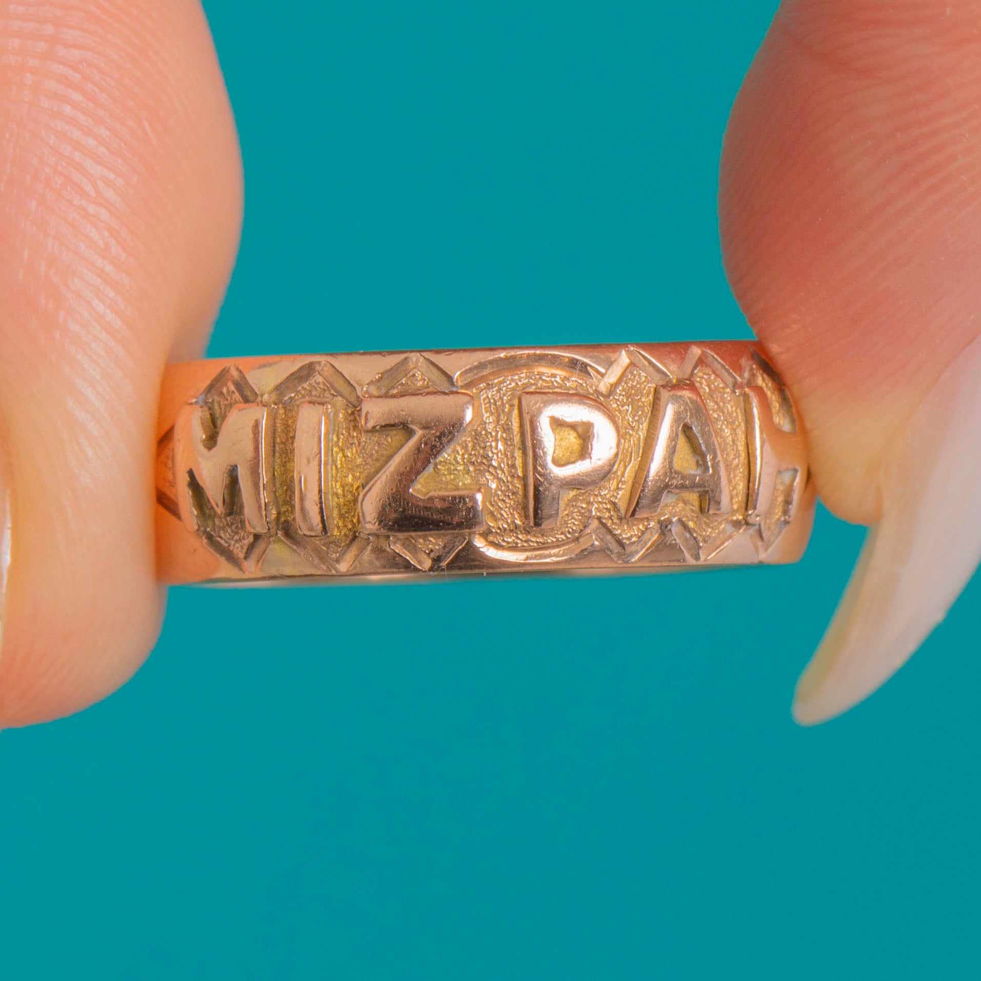 EXCELLENT: Minimal surface wear with gentle softening to the highest points; the raised “MIZPAH” remains crisp and legible with the textured ground well-preserved. The band is strong and retains a good circular shape, with clear interior hallmarks. No dents, splits, or obvious resizing observed.
