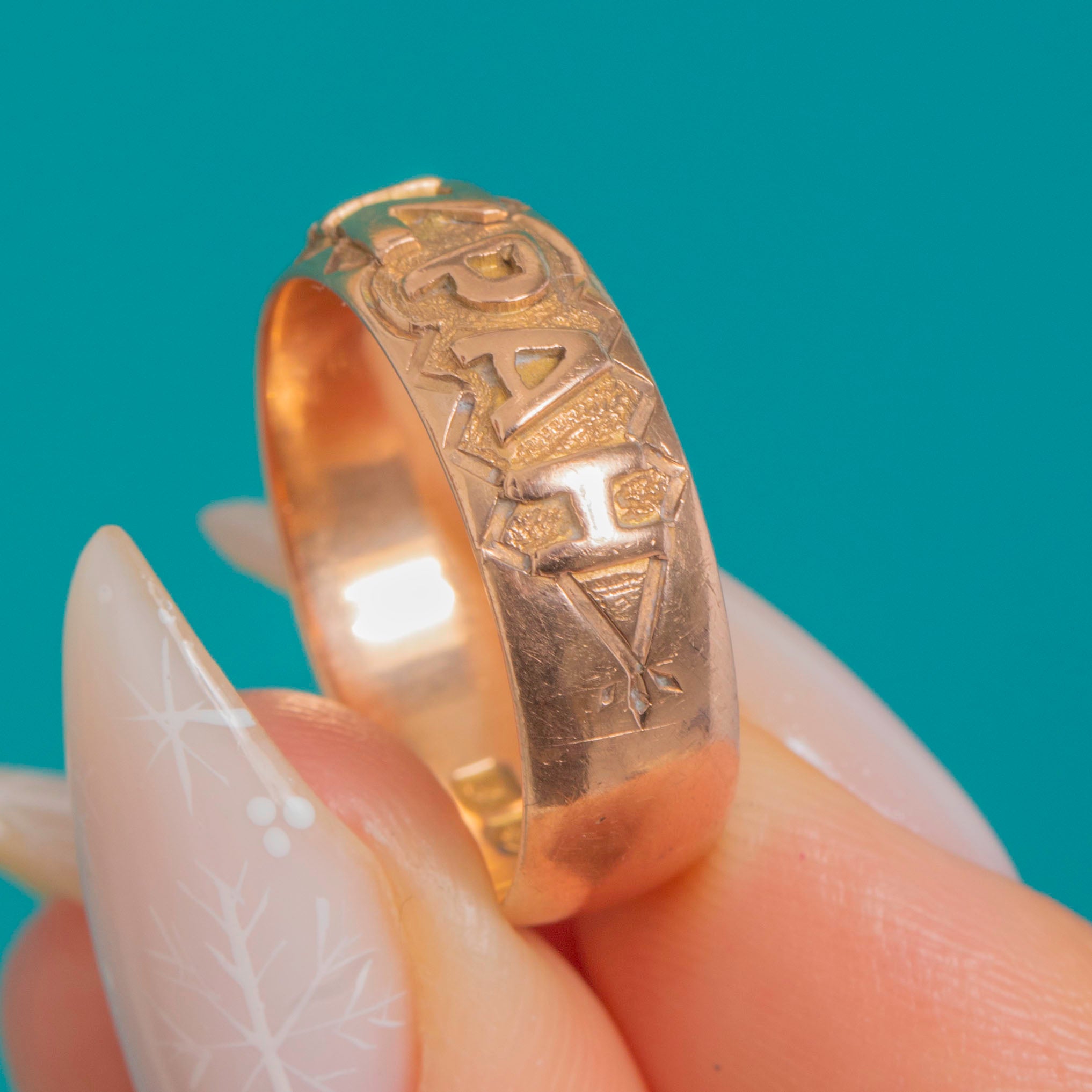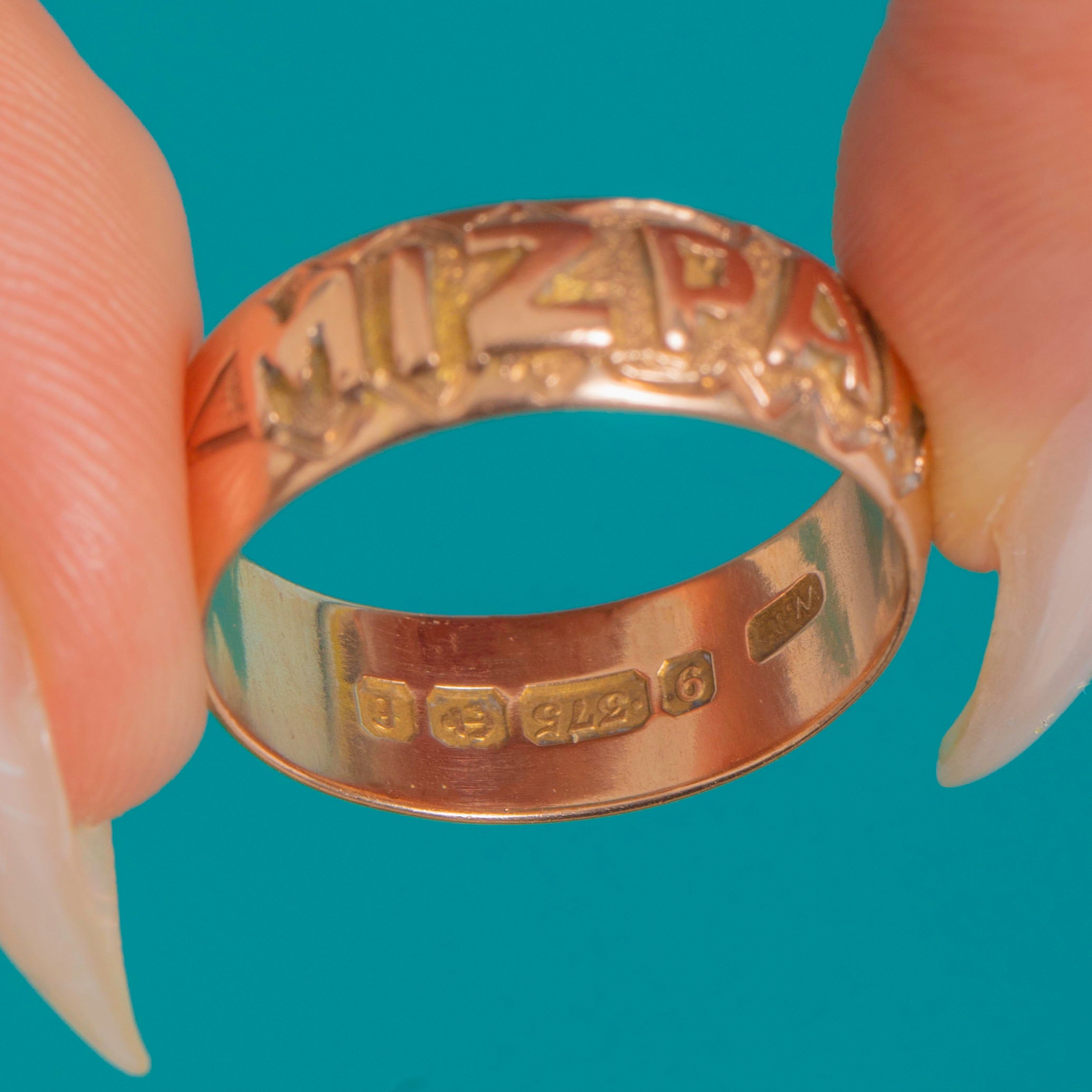 Finely made as a solid one-piece band with a polished interior, it’s a classic example of early 20th-century craftsmanship. Fully hallmarked for Birmingham 1905, it’s a timeless token with superb texture and typographic flair.
