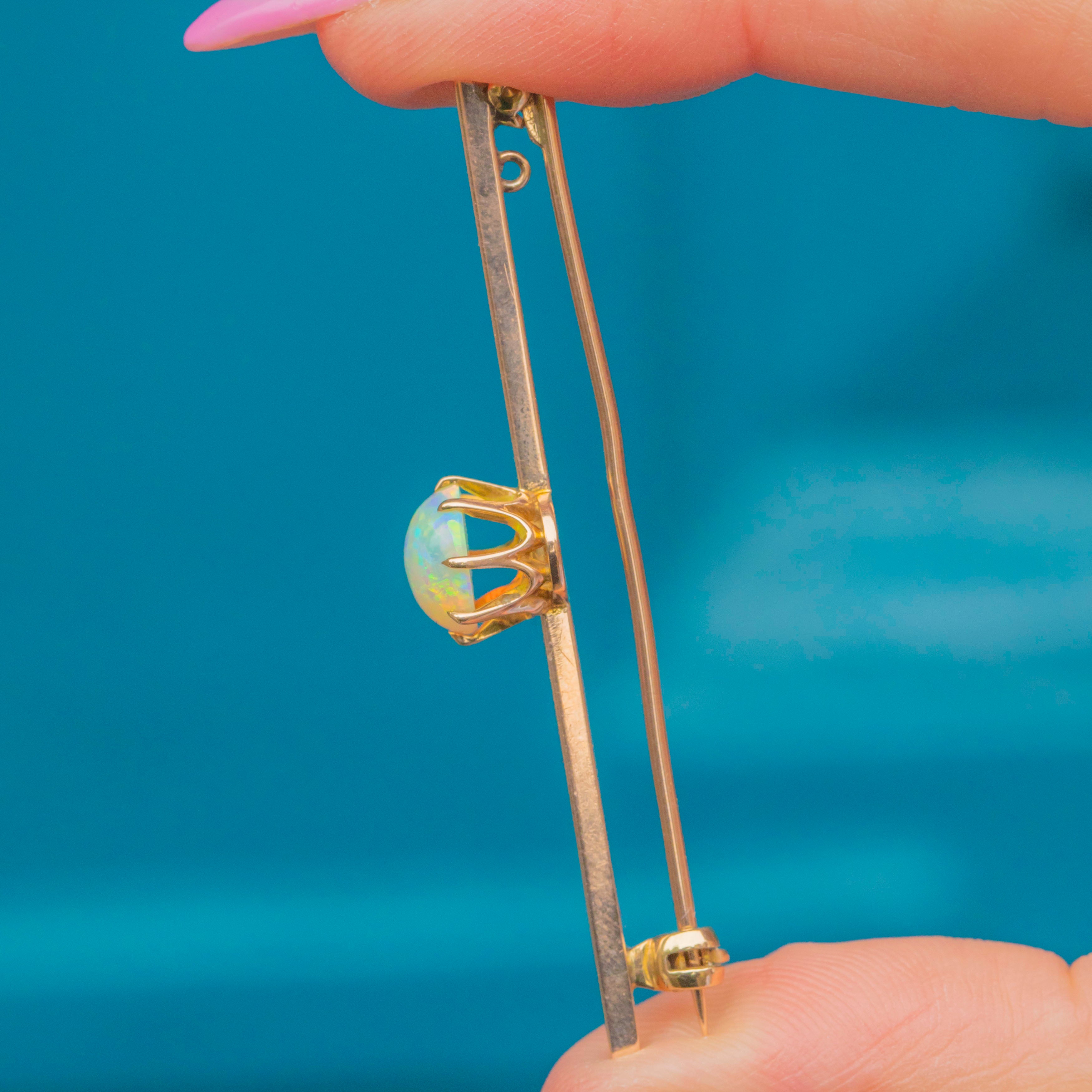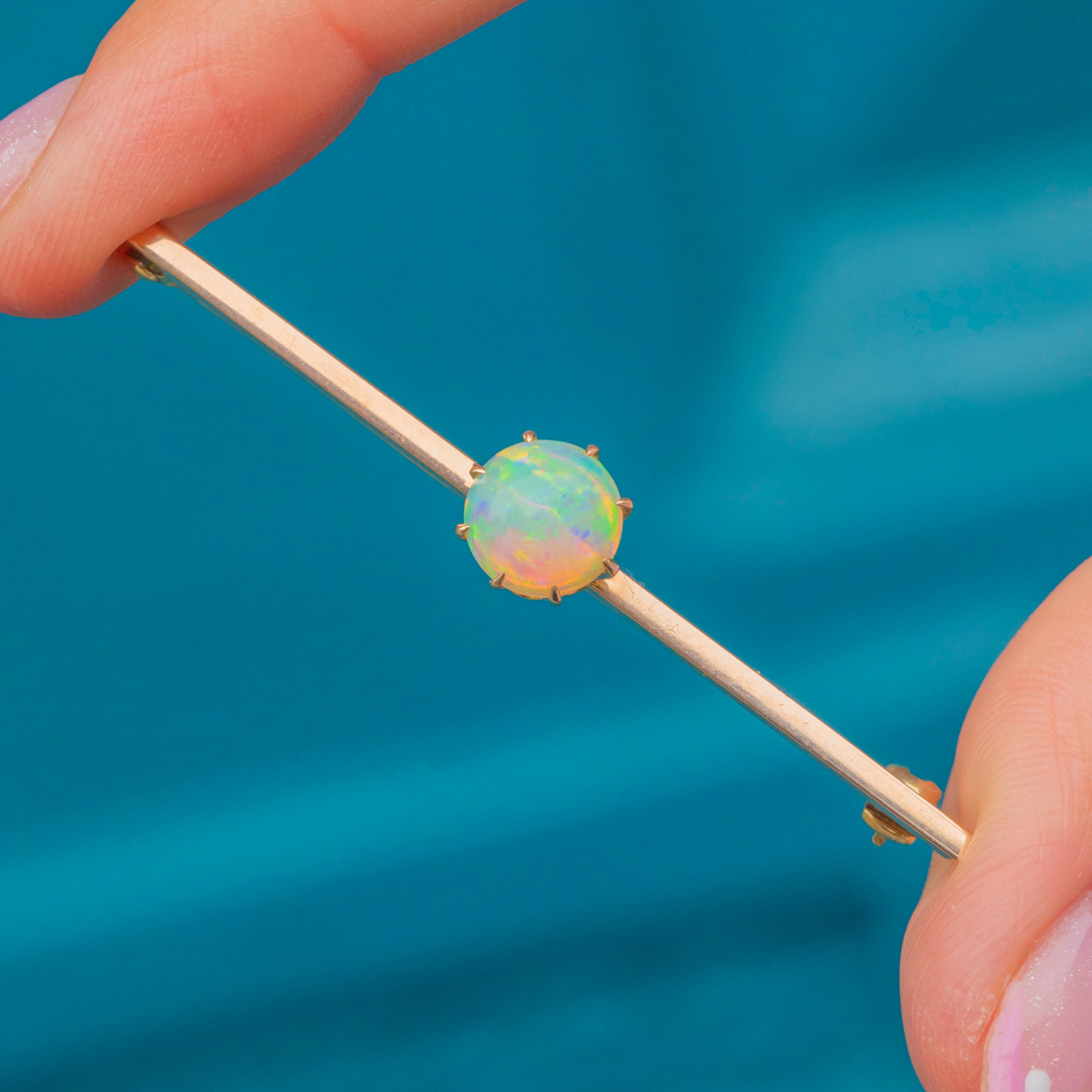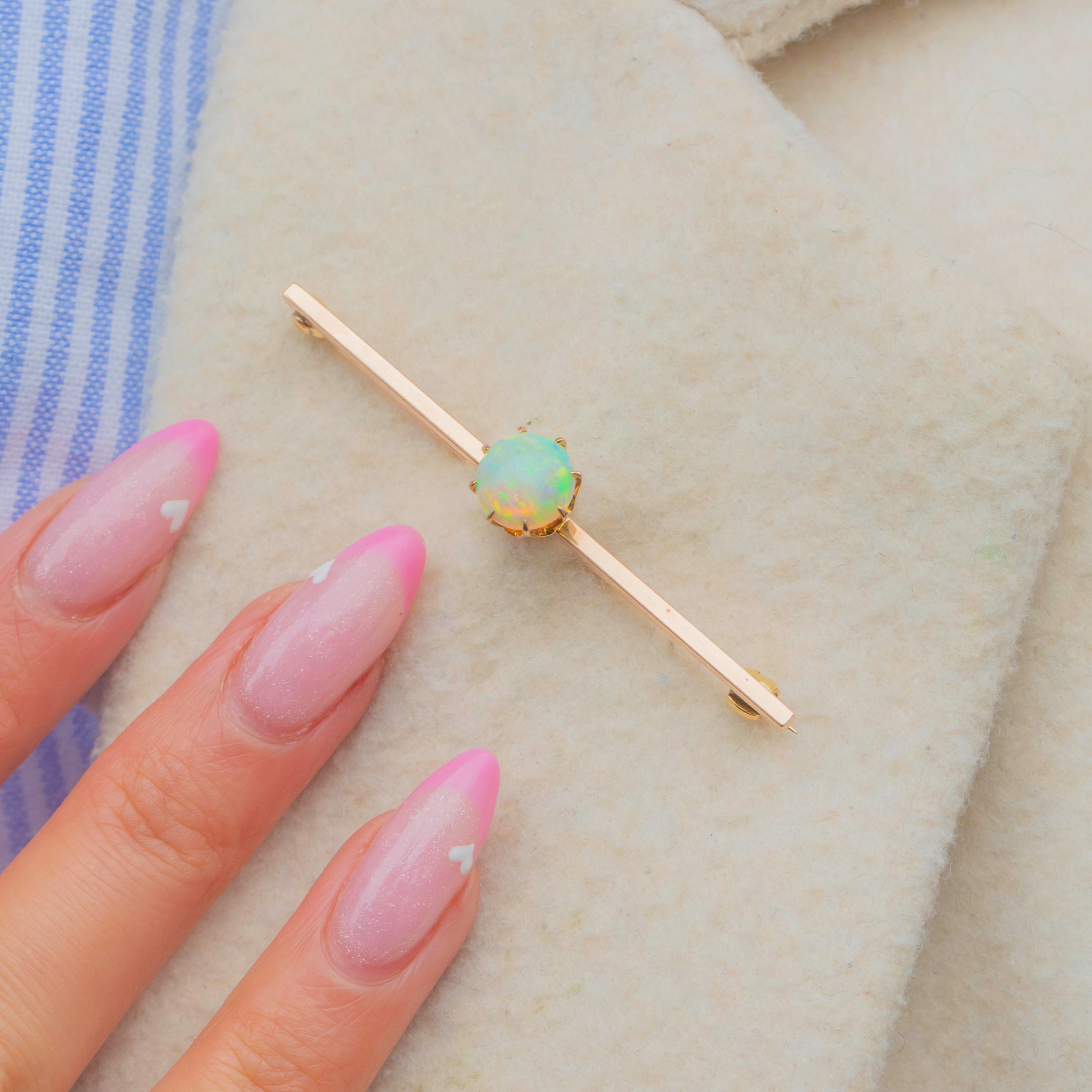 This elegant Edwardian bar brooch is crafted in 9ct Gold and set with a captivating natural solid Opal cabochon, alive with soft flashes of green, pink and blue. The slender Gold bar perfectly frames the Opal’s iridescent play of colour, embodying the refined simplicity of Edwardian design.