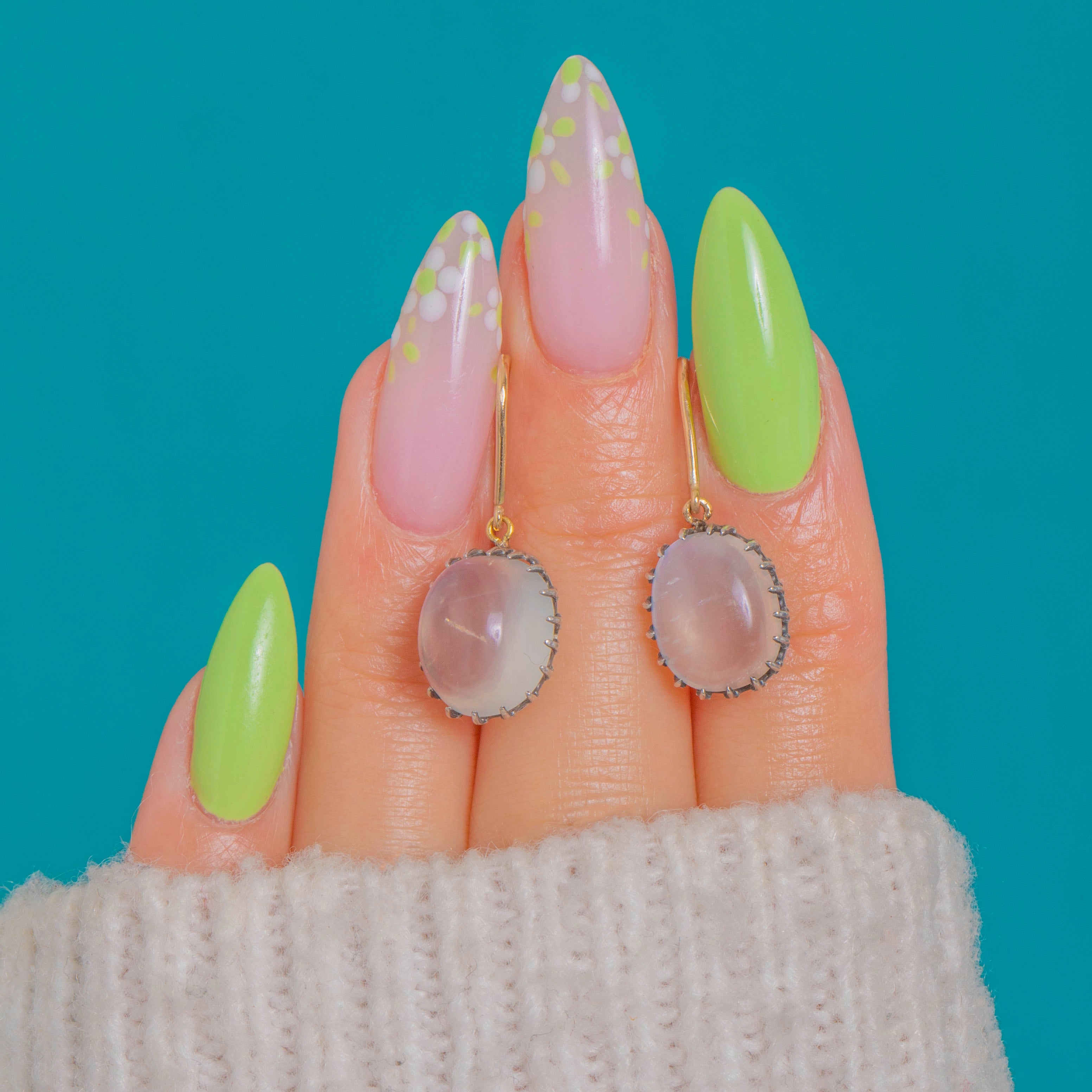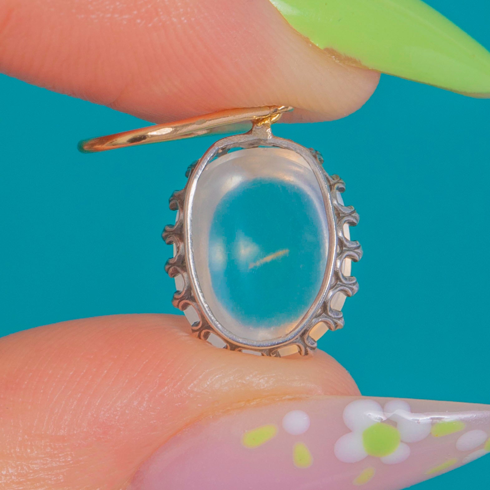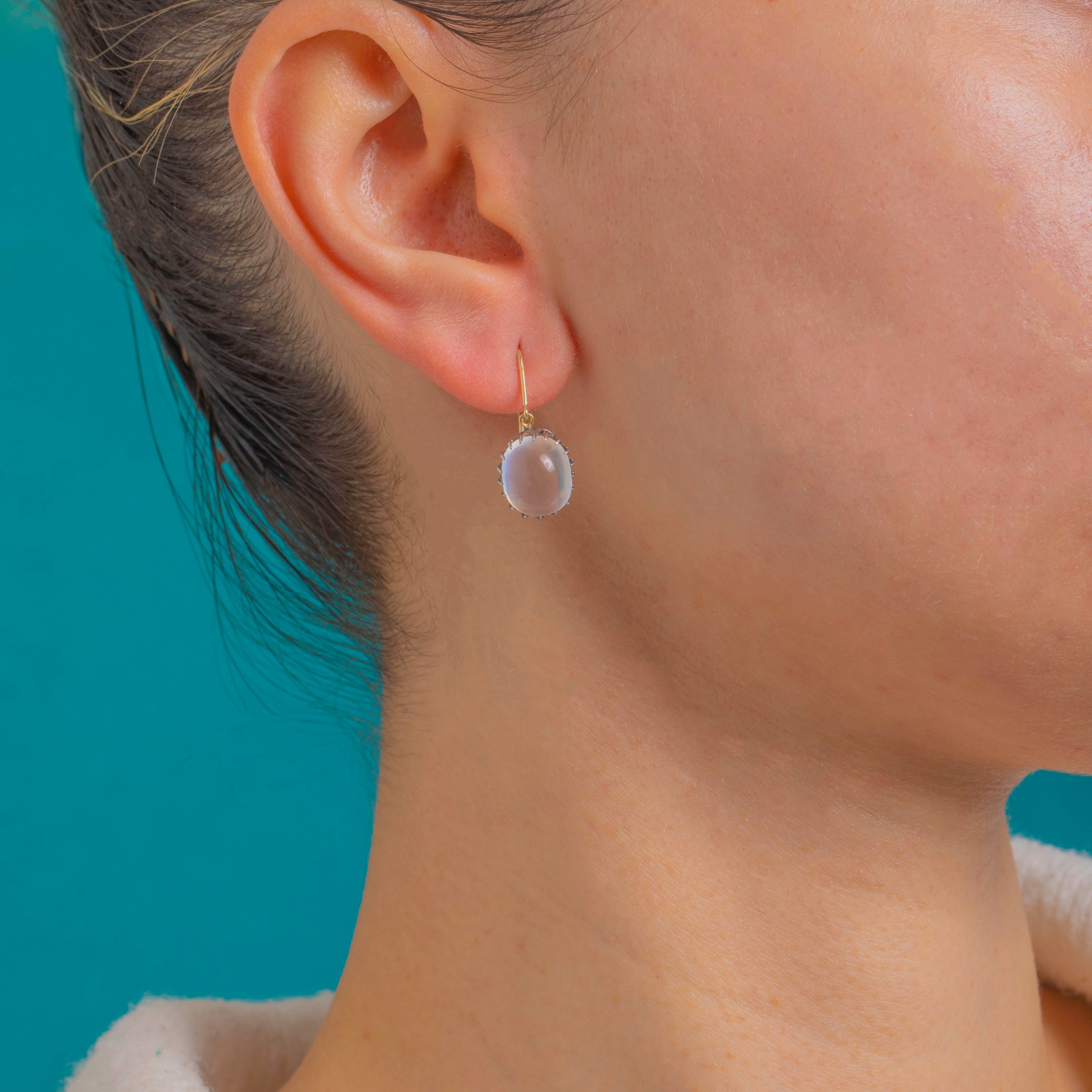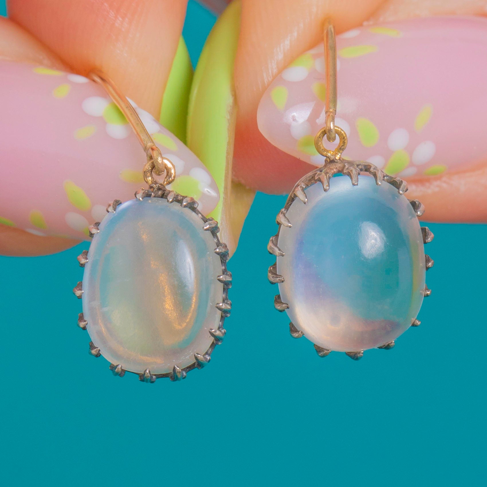 Bathed in an ethereal glow, these Edwardian Moonstone drop earrings are irresistibly romantic. Each high-domed oval Moonstone shimmers with delicate blue and peachy flashes, cradled in pretty Silver claws that lend a crown-like finish. The drops sway from elegant 9ct Gold hooks, the two-tone palette highlighting the Moonstones’ luminous adularescence.