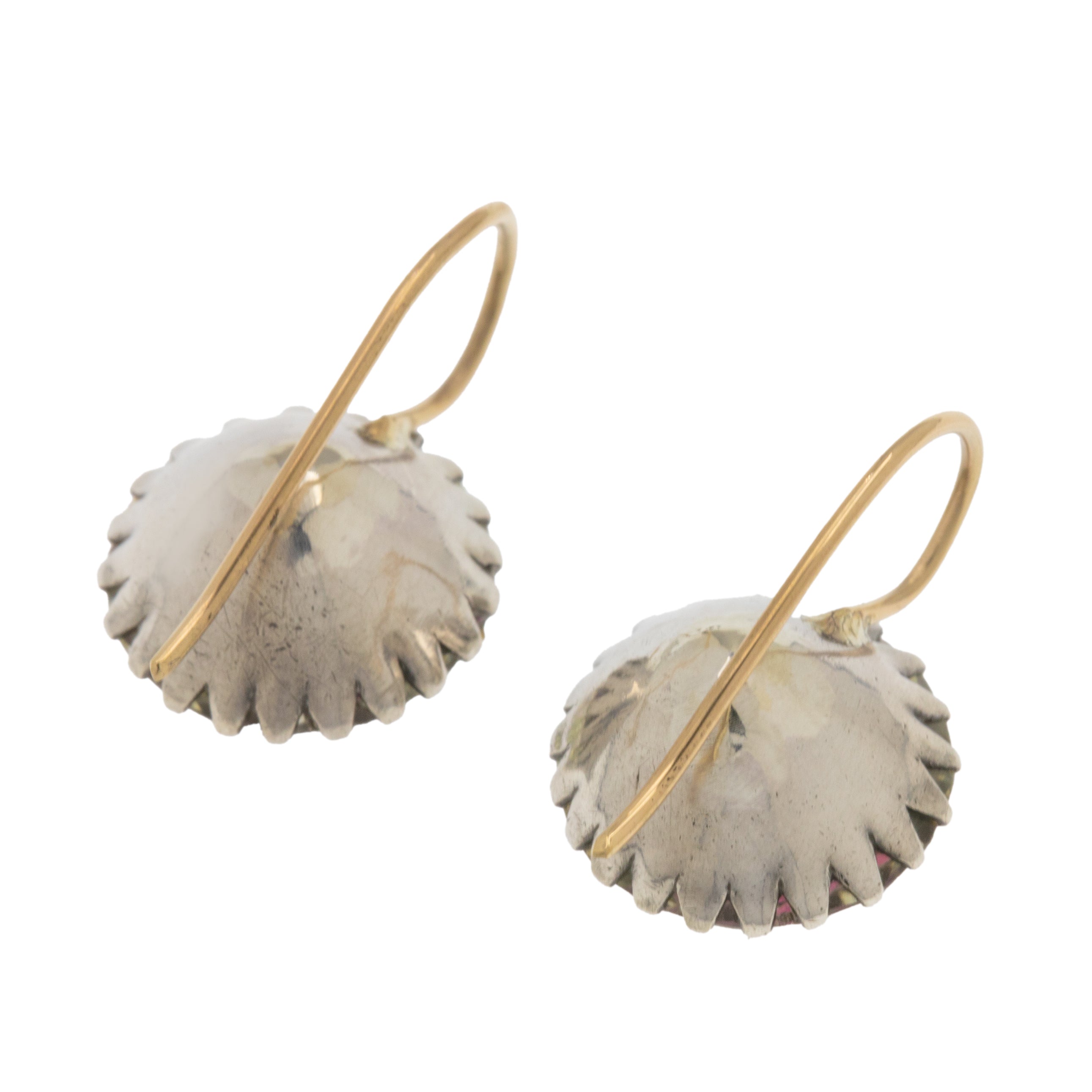 EXCELLENT. These antique foiled pink Paste earrings are in wonderful condition. The Paste gemstones have a beautiful pink hue and the foils have been well preserved. The 15ct Gold hooks are robust and generously sized, allowing you to confidently wear these magnificent Victorian Paste earrings comfortably whatever the occasion! The domed back of the earrings have some slight surface wear present, but they are smooth and for the most part even in colour.