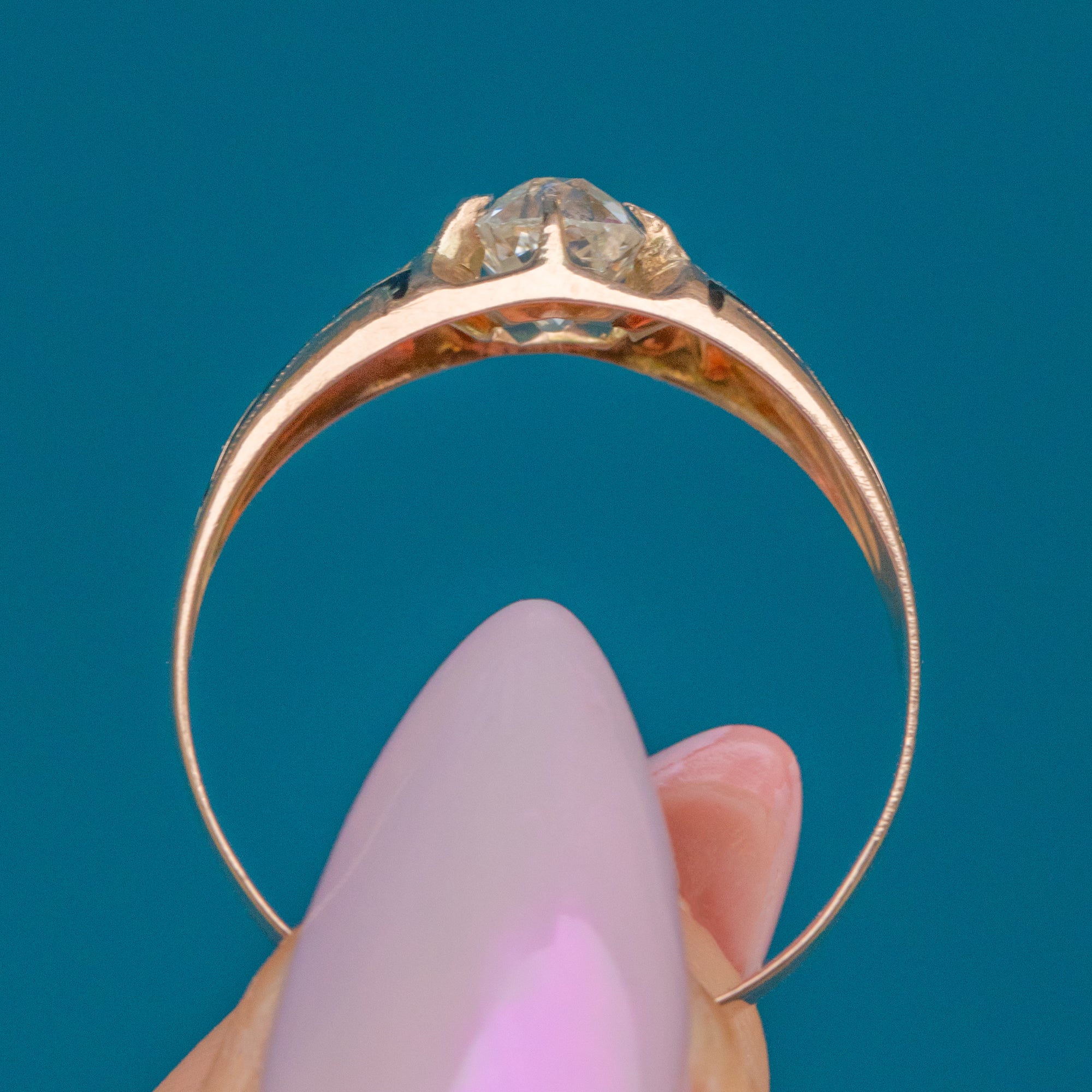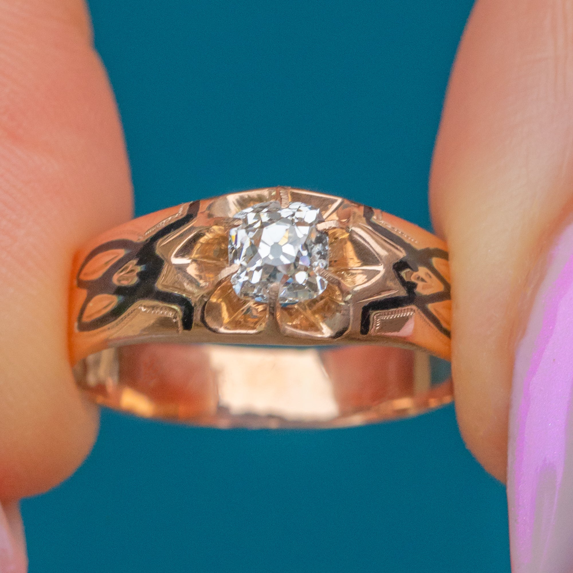 VERY GOOD-EXCELLENT: The Diamond is bright and secure with no visible chips or fleabites. It is also remarkably clear, with no inclusions under x10 magnification. The black Enamel details remain very crisp and well-preserved for its age. The band shows a very neat resizing mark, professionally done and unobtrusive, which is only visible if you really look for it.