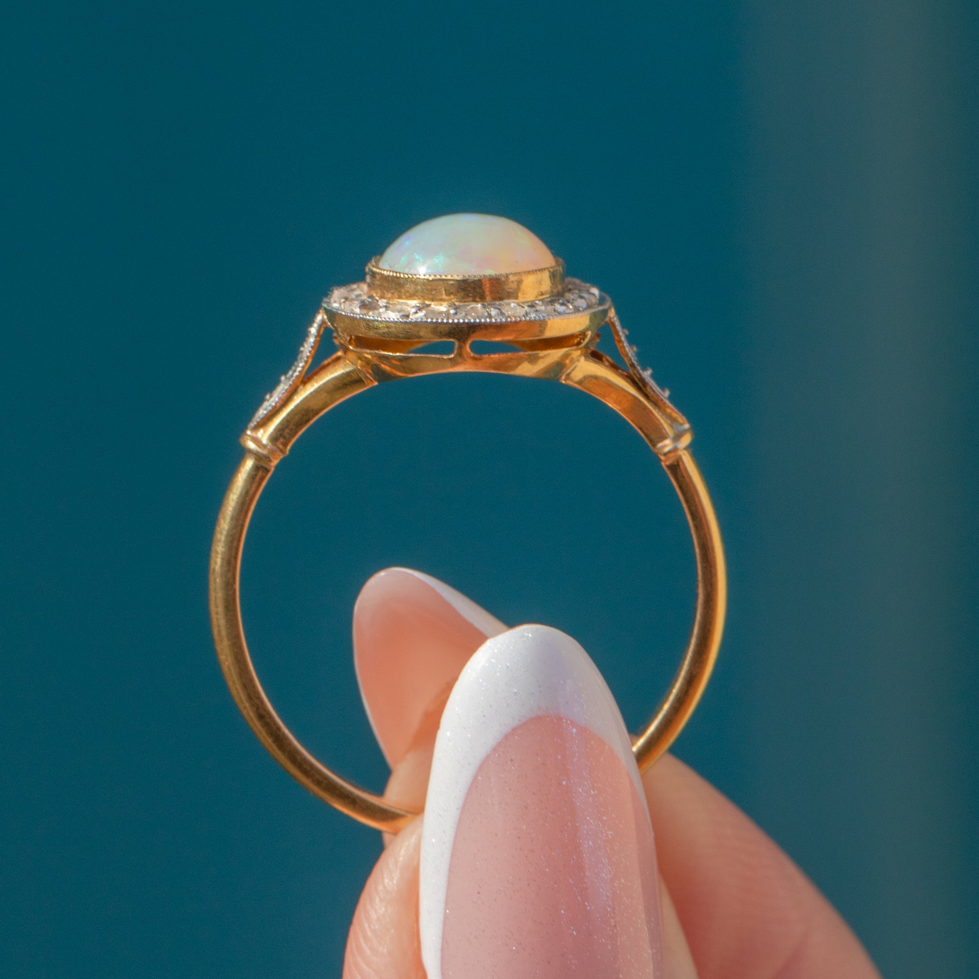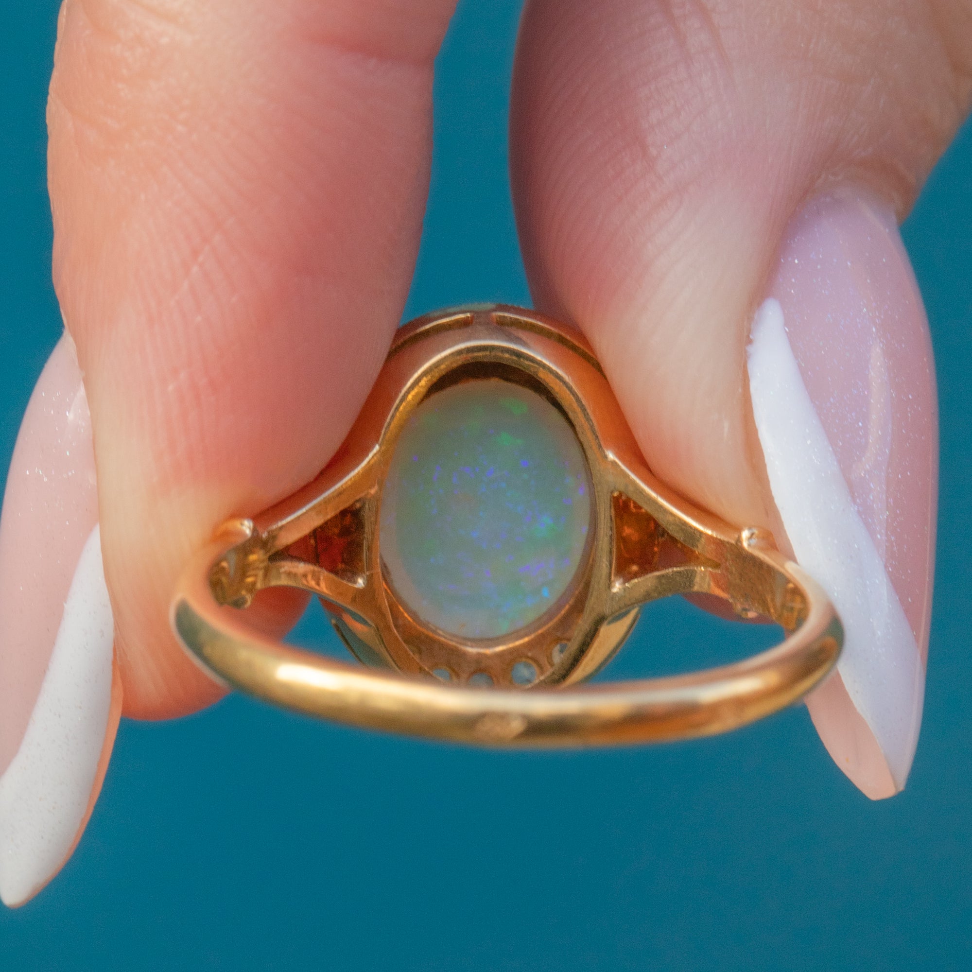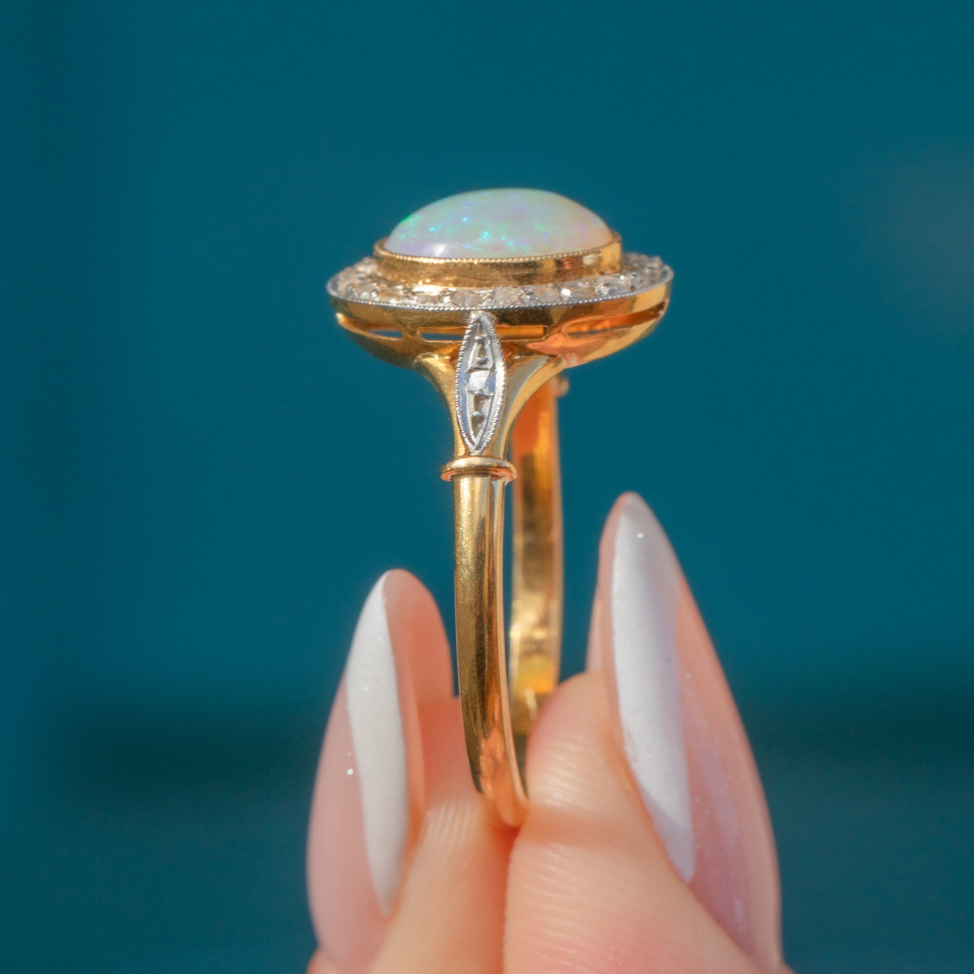 VERY GOOD-EXCELLENT: We are pleased to present this antique French 18ct Gold Opal Diamond cluster ring in wonderful condition. Meticulously crafted, each gemstone sits securely within its setting. There is some wear to the Diamonds commensurate with age, but her Opal remains immaculate. With a smooth band, you can wear this beauty with confidence!