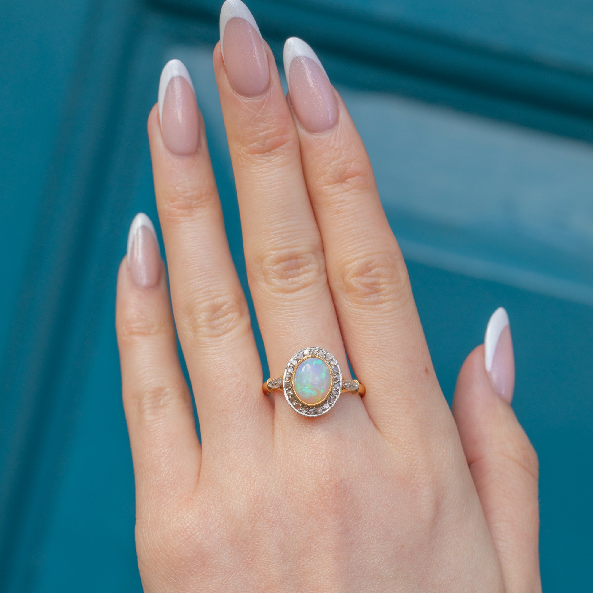 This antique French 18ct Gold Opal Diamond cluster ring is divine!