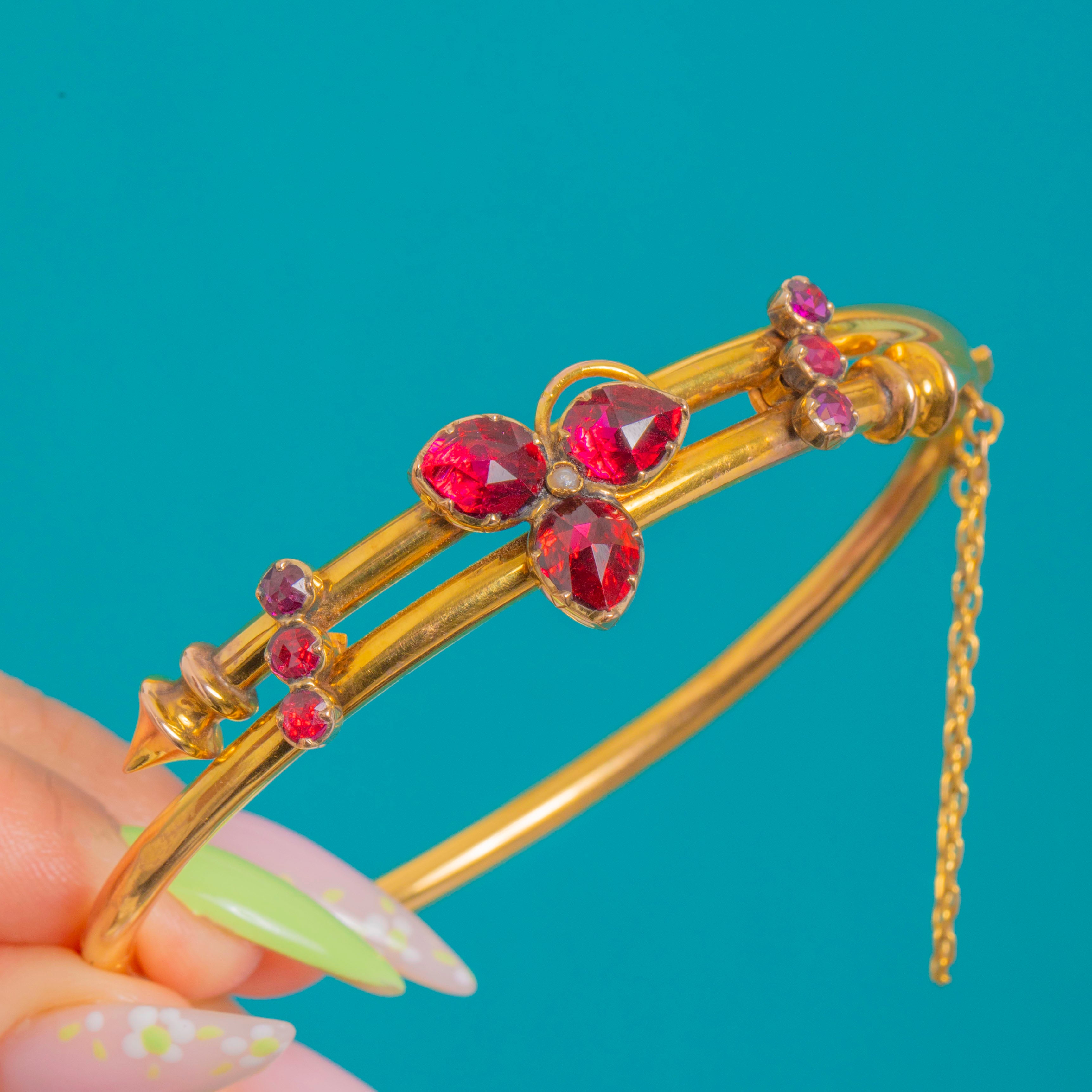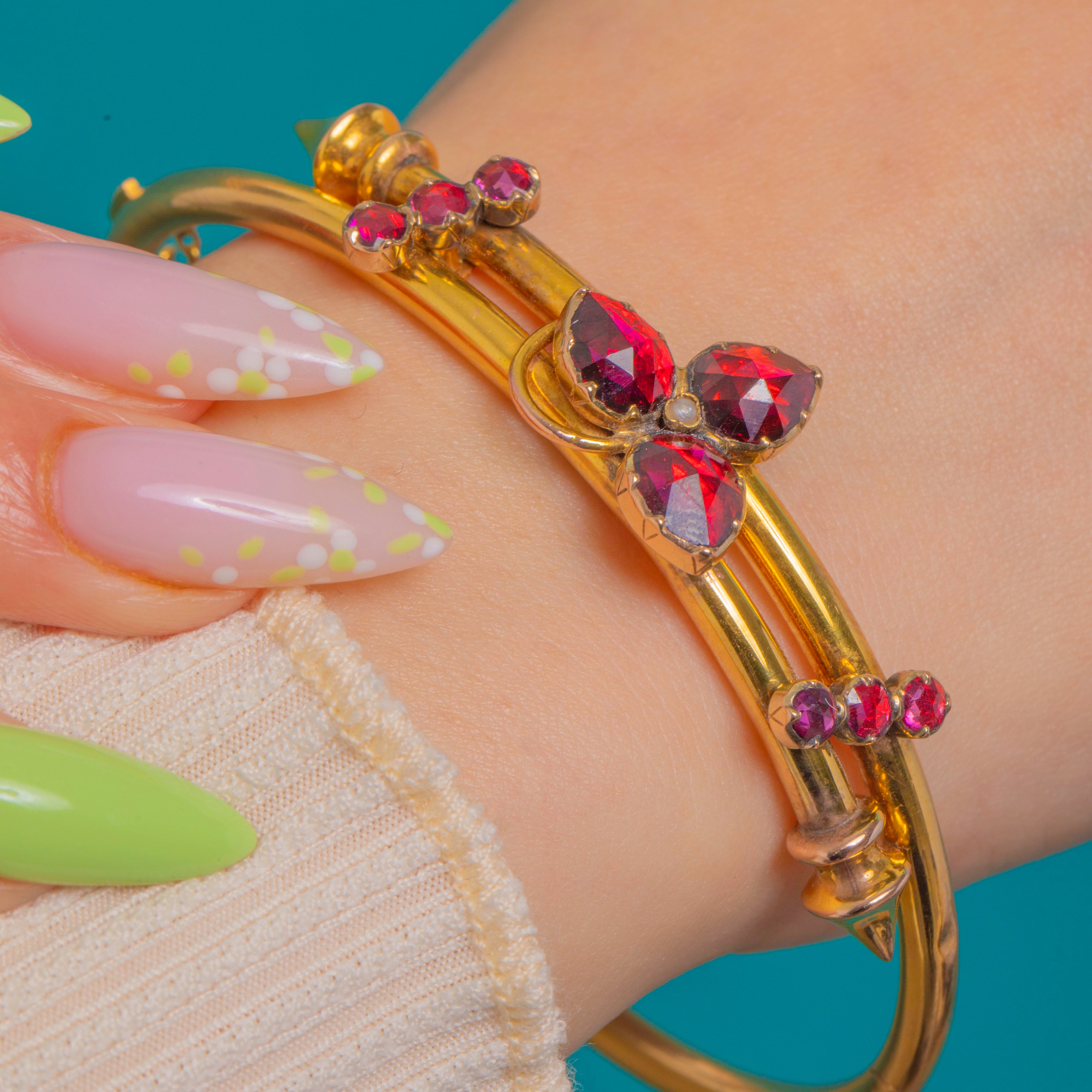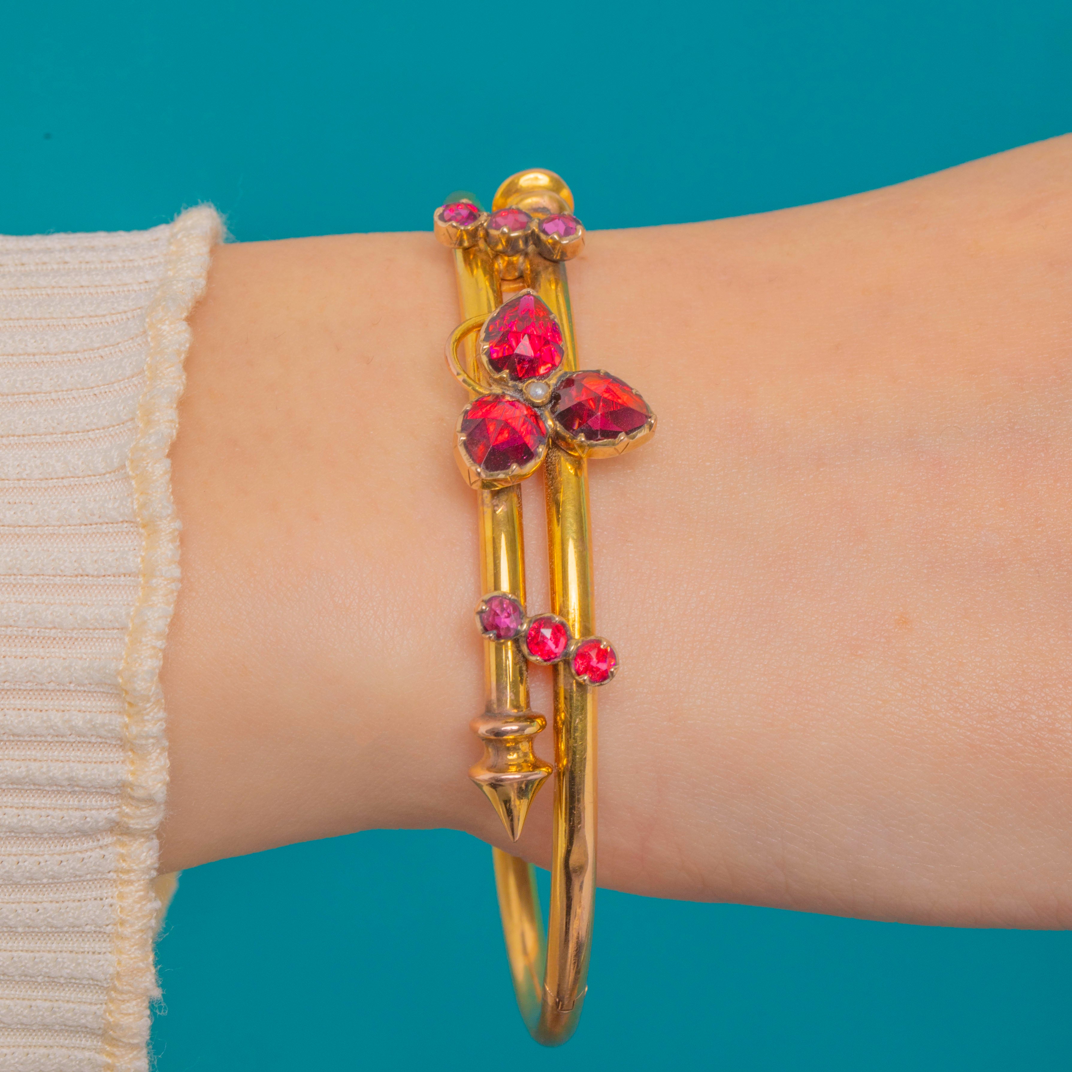 A dreamy Antique French Victorian bangle crafted in rich 18ct Gold and set with glowing Perpignan Garnets. At the centre, three pear-cut Garnet “petals” form a charming shamrock, kissed with a tiny Seed Pearl at the heart. The graceful twin-wire silhouette flows around the wrist, dotted with round Garnet accents for a refined flicker of light, and secures with a hinge and safety chain for ease and confidence.