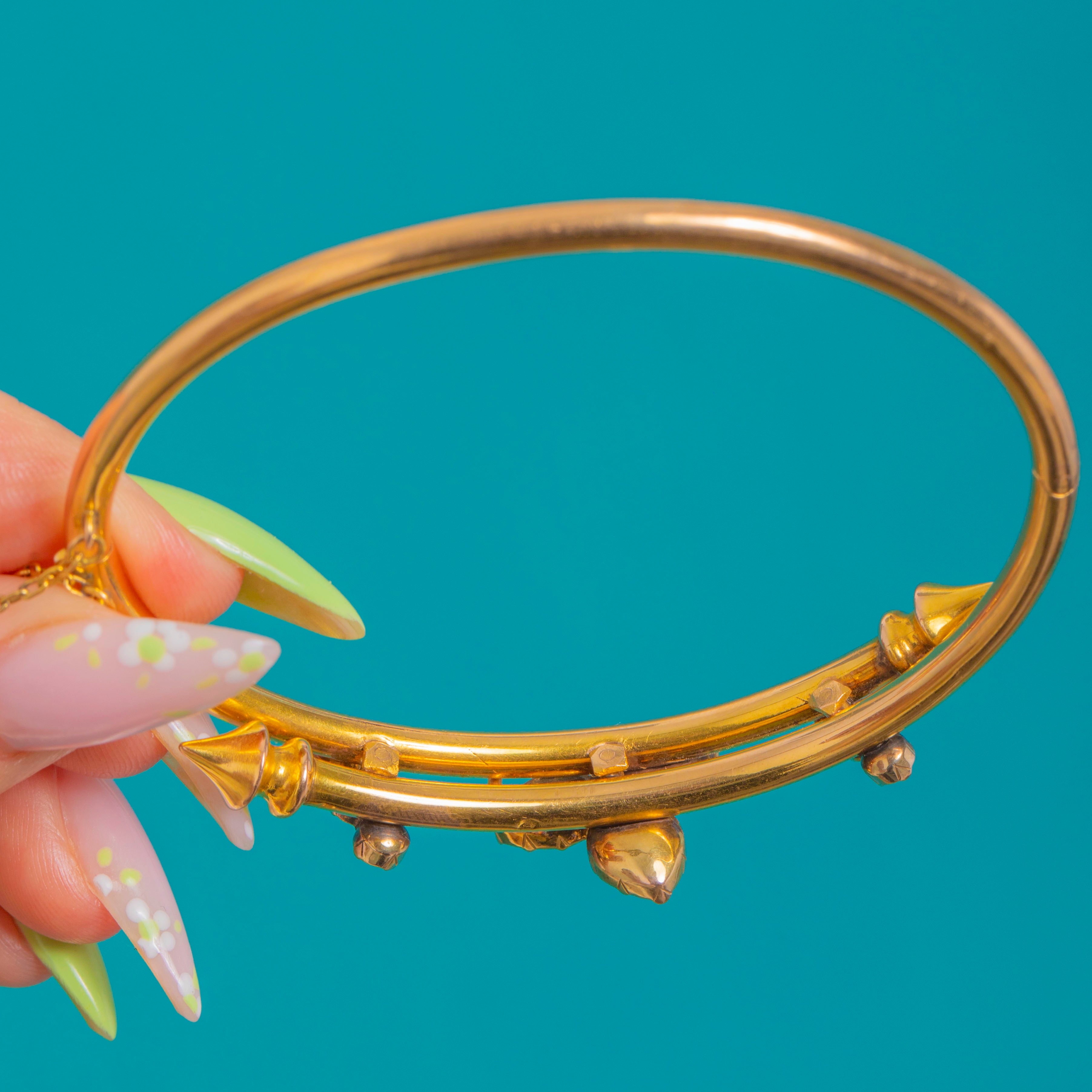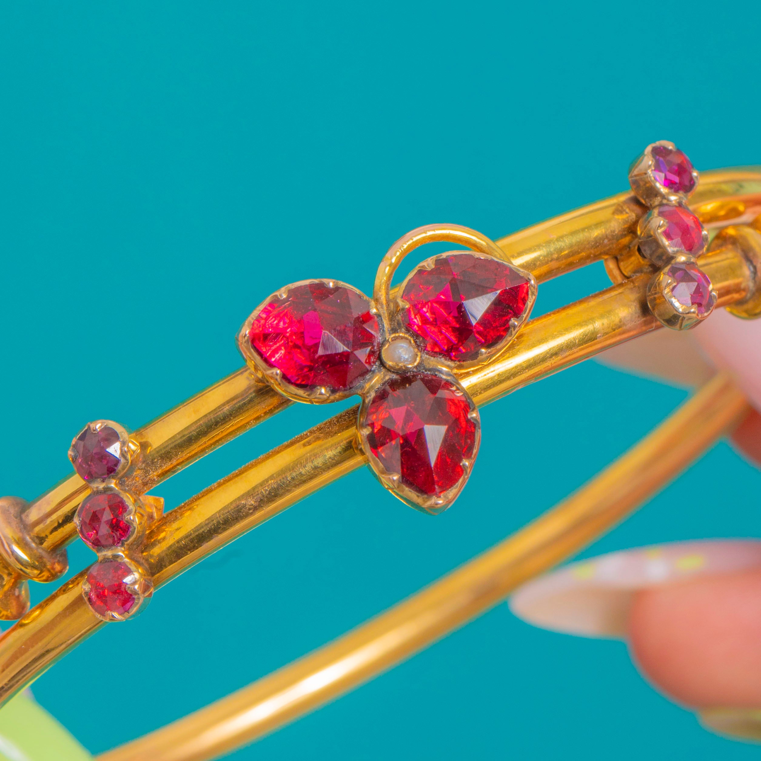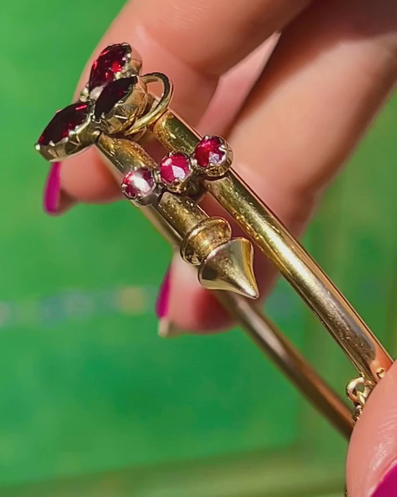 A dreamy Antique French Victorian bangle crafted in rich 18ct Gold and set with glowing Perpignan Garnets. At the centre, three pear-cut Garnet “petals” form a charming shamrock, kissed with a tiny Seed Pearl at the heart. The graceful twin-wire silhouette flows around the wrist, dotted with round Garnet accents for a refined flicker of light, and secures with a hinge and safety chain for ease and confidence.