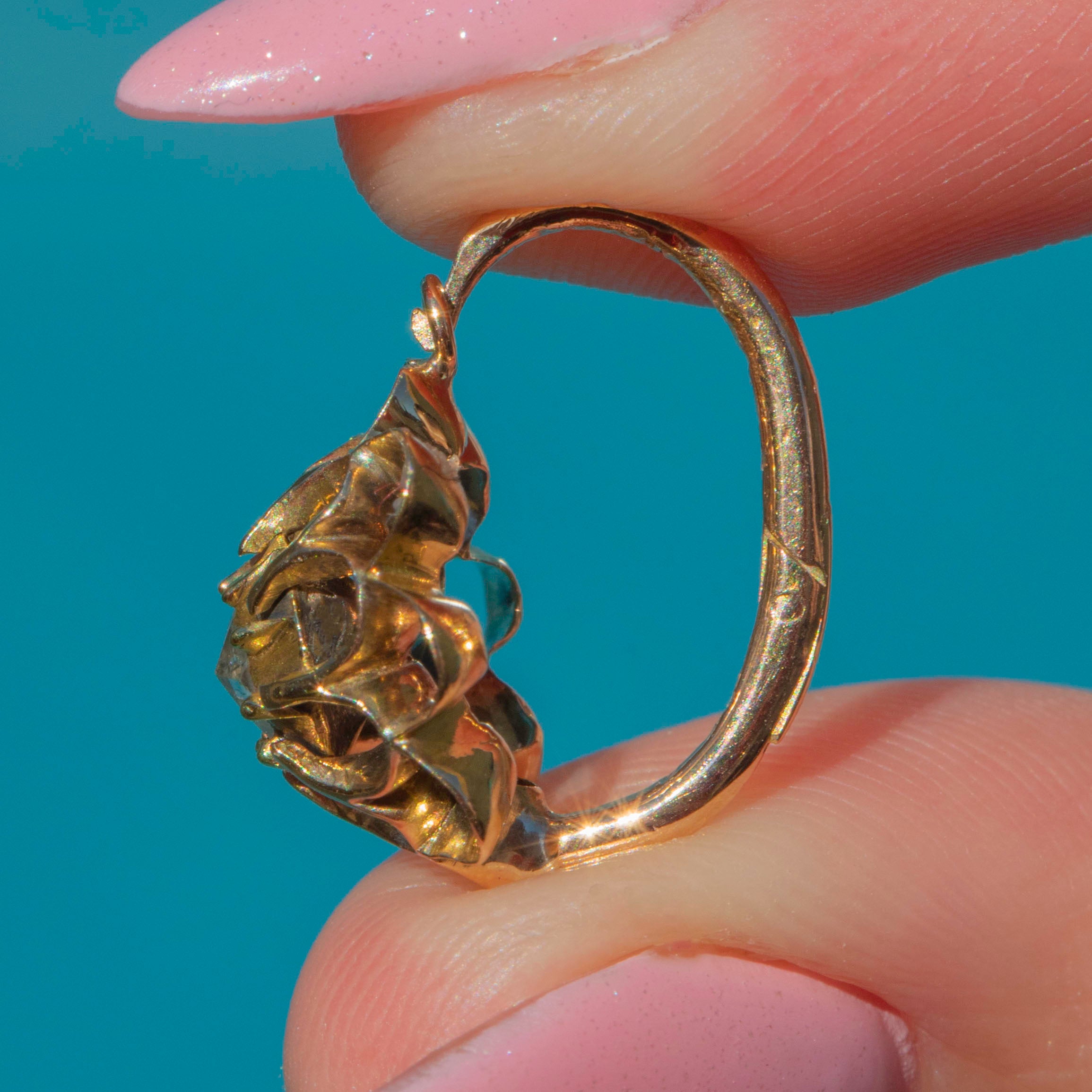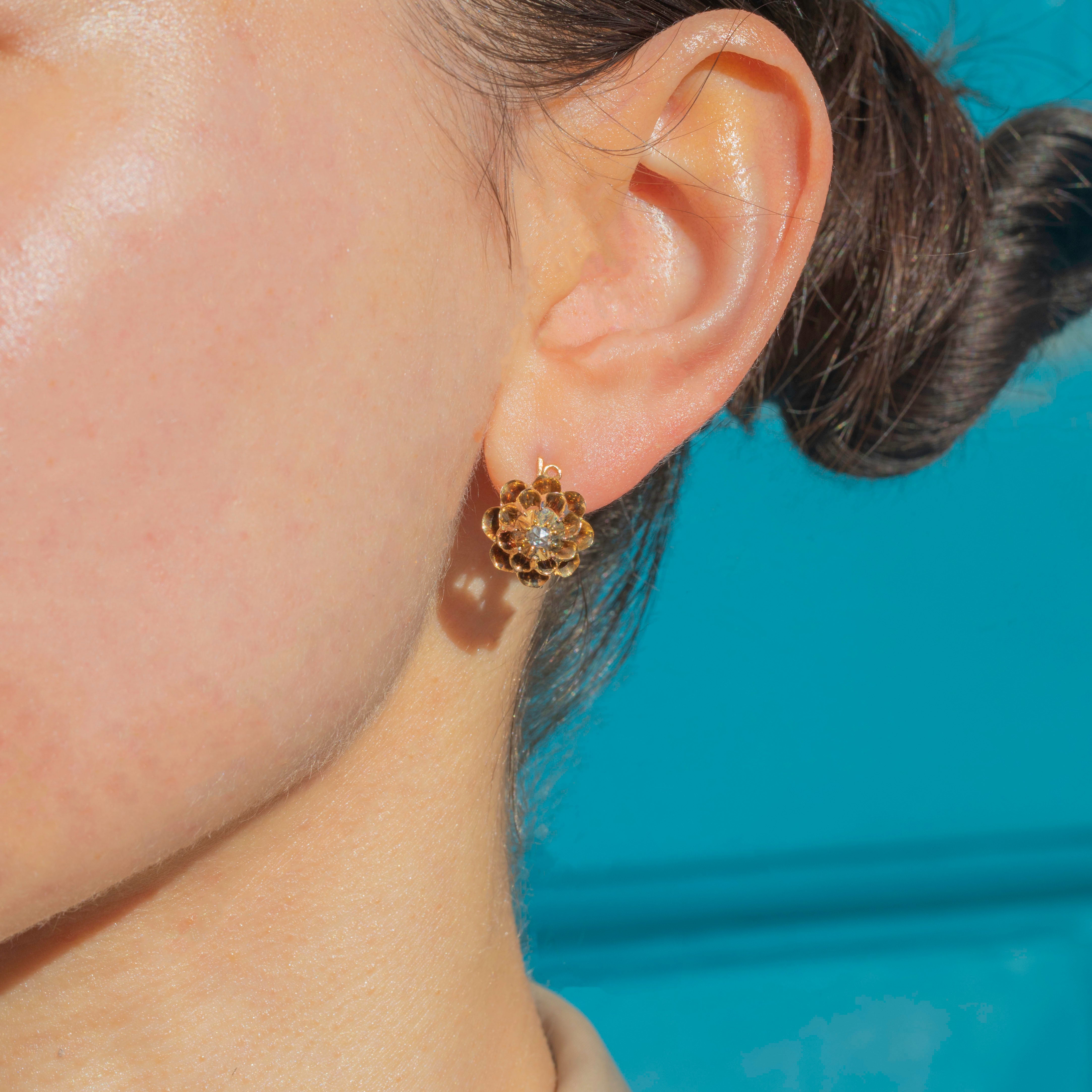 Typically French in deisgn, the exuberant design of these earrings take on a floral form in a traditional dormeuse style, and are crafted from solid, saturated 18ct Gold. These Victorian earrings can be worn comfortably in the ear, with their subtle backs allowing the flower motif to take centre stage!