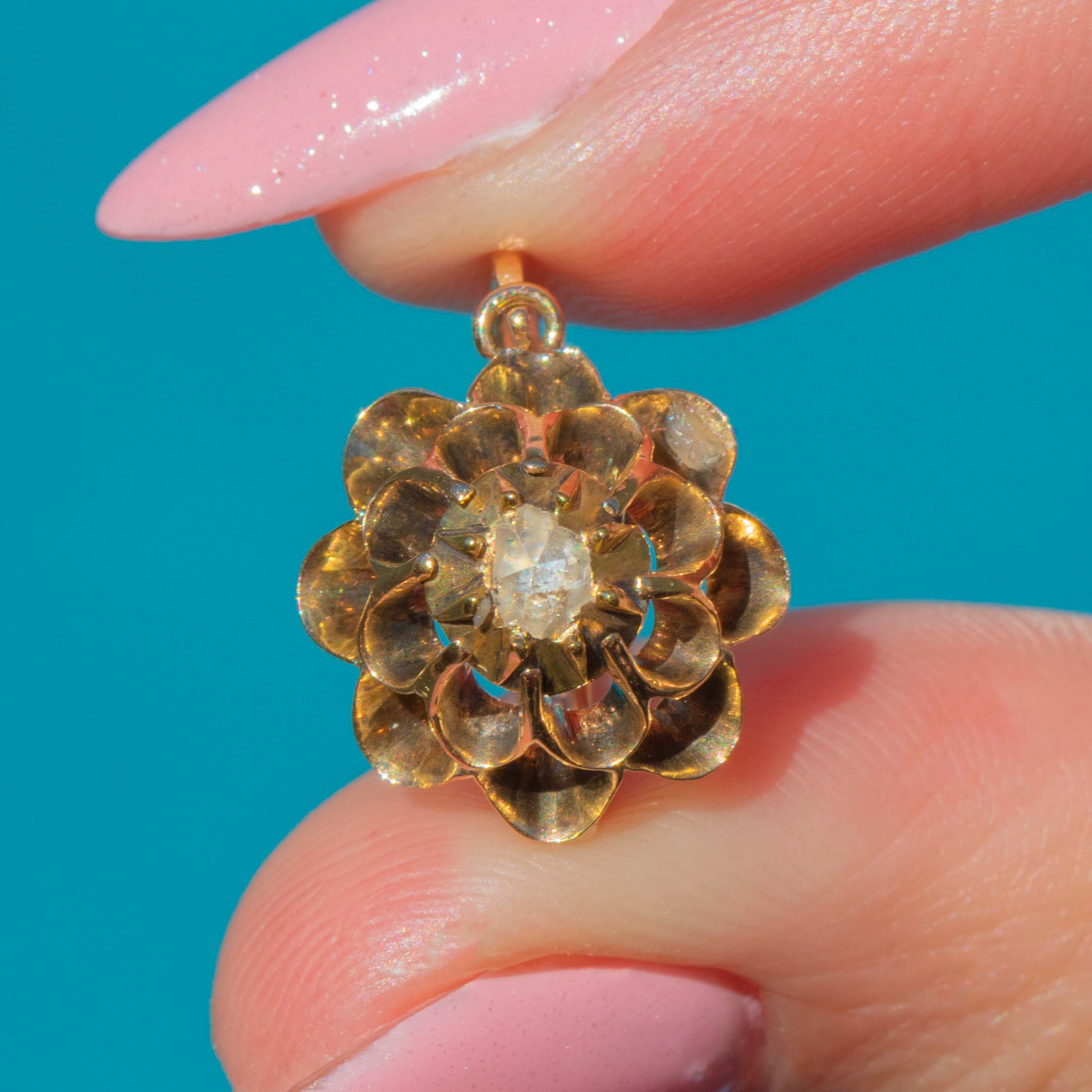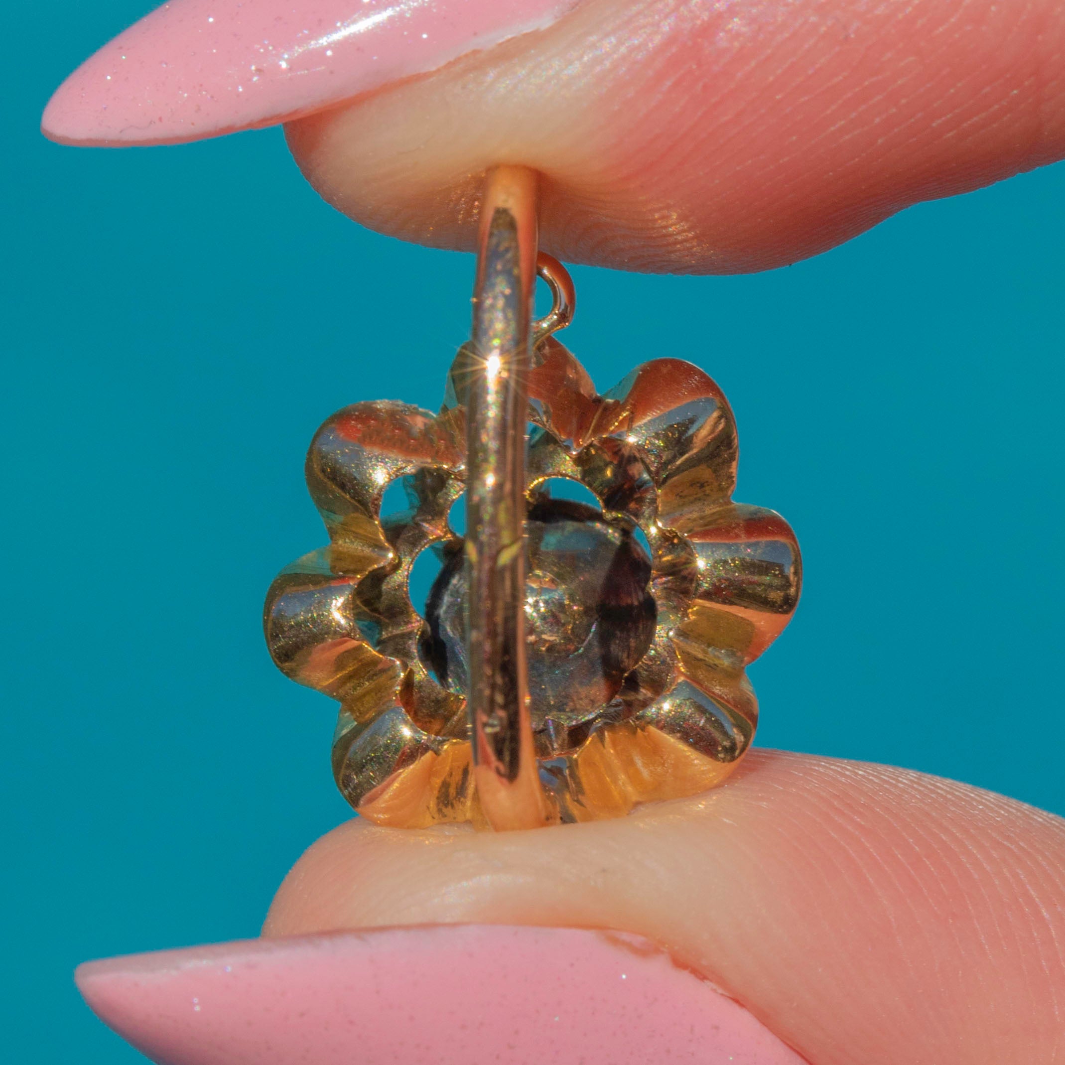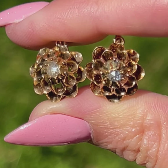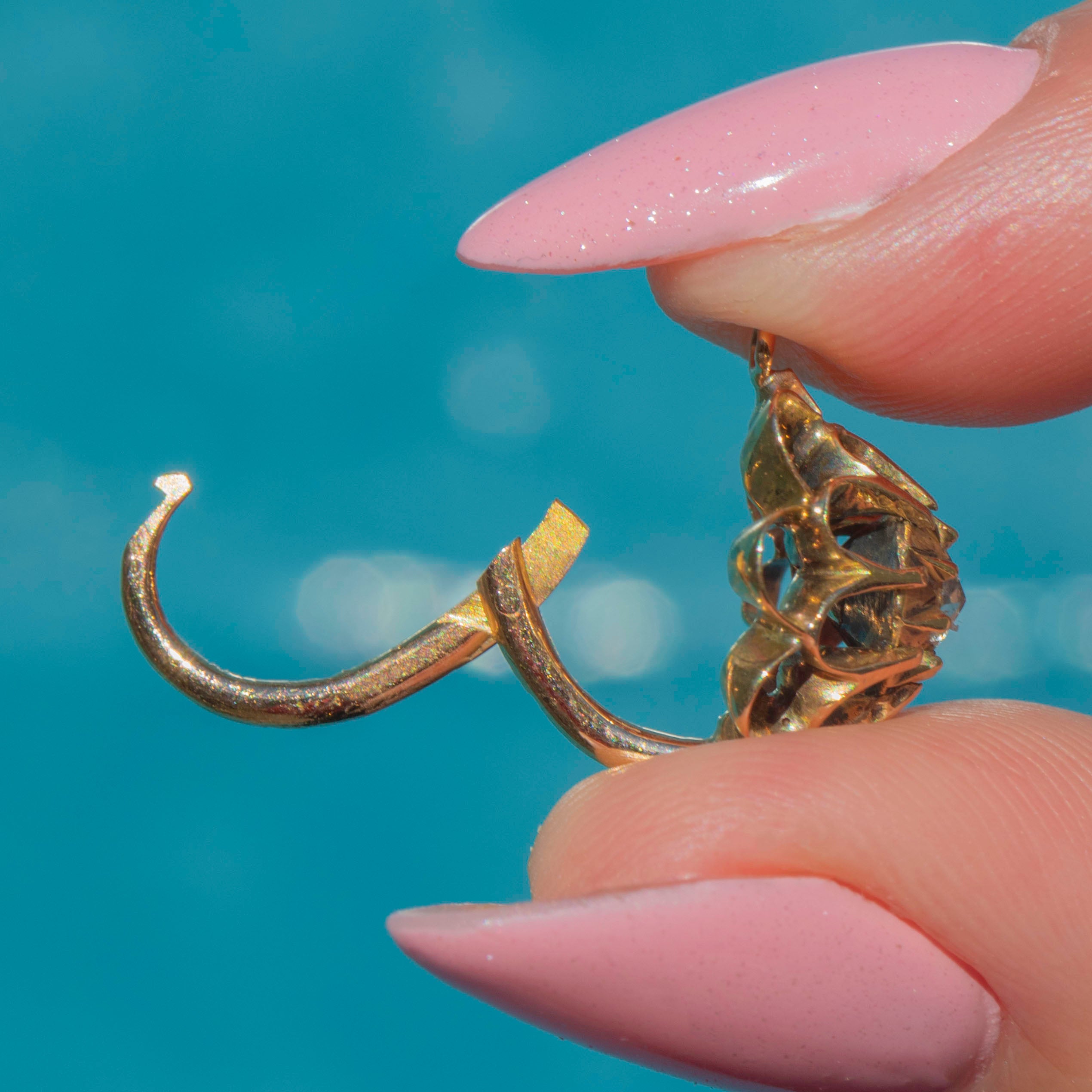 This pair of antique French 18ct Gold Rose-Cut Diamond lever-back earrings are full of life. At the centre of each feminine and floral pair lies a characterful antique rose-cut Diamond, complete with peppery undertones and exquisite facets that sparkle beautifully!