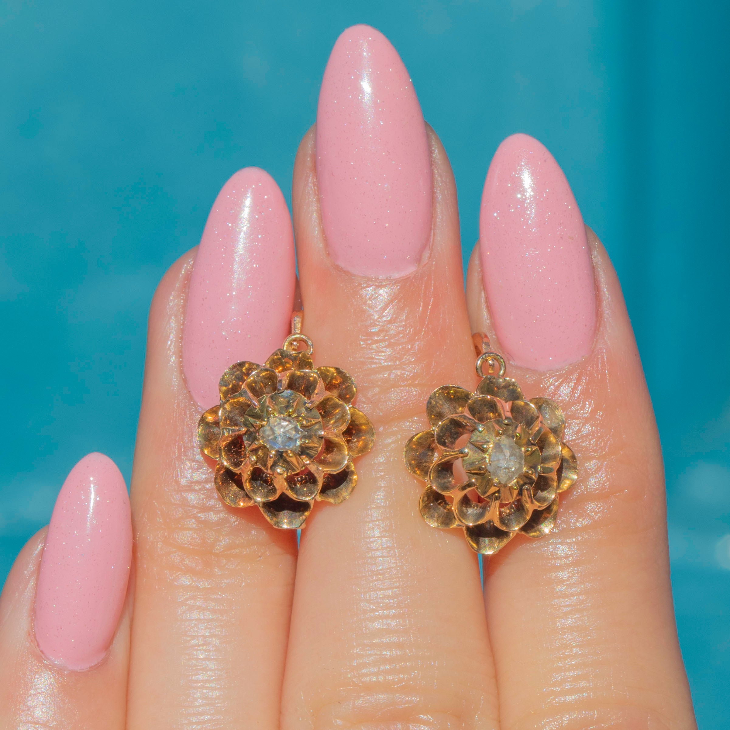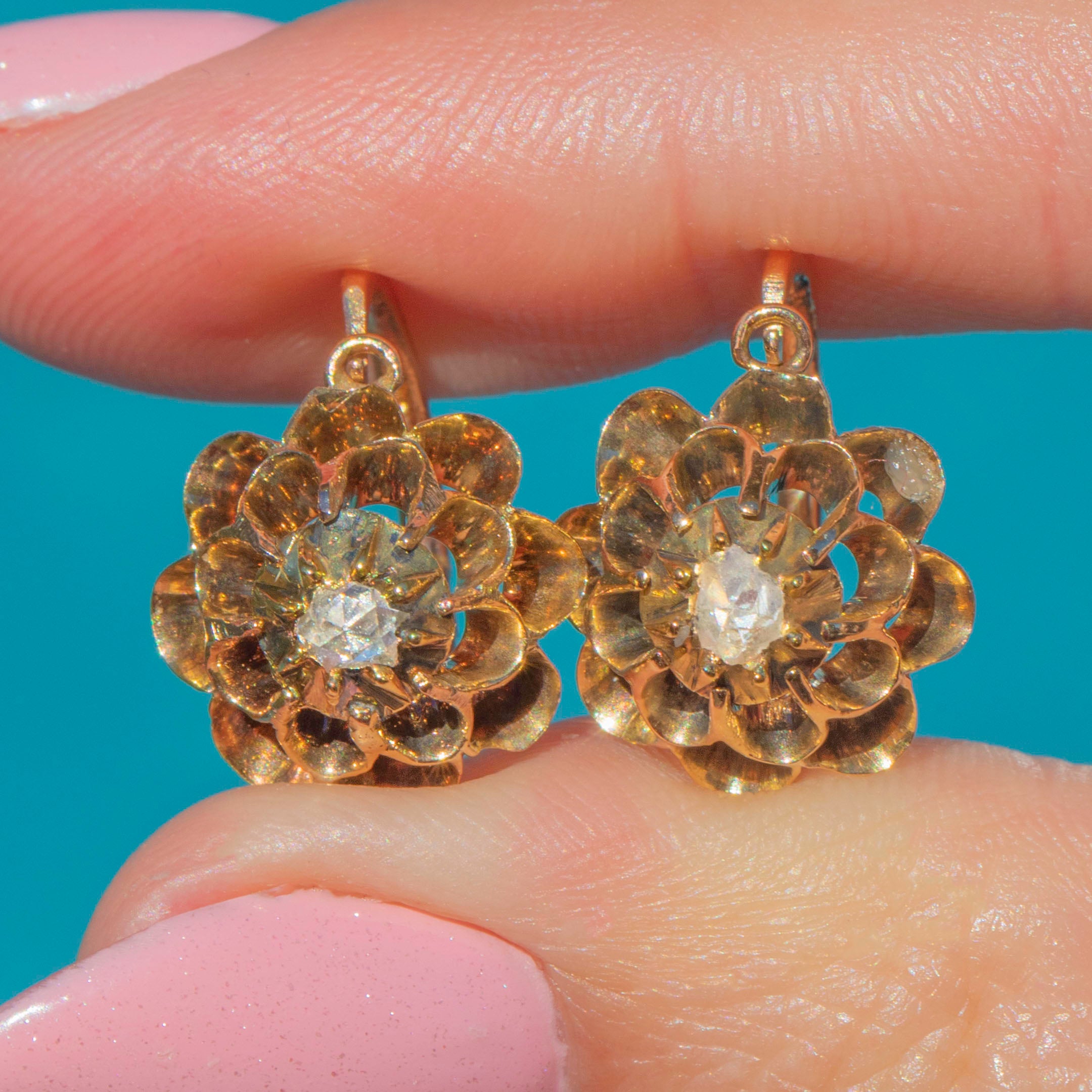 VERY GOOD: These antique French 18ct Gold rose-cut Diamond lever-back earrings are in very good condition. The Gold is brightly saturated with only mild wear at the front of the earrings. The Diamonds are secure in their settings and sparkle wonderfully! These earrings have robust lever backs that allow you to wear them confidently.