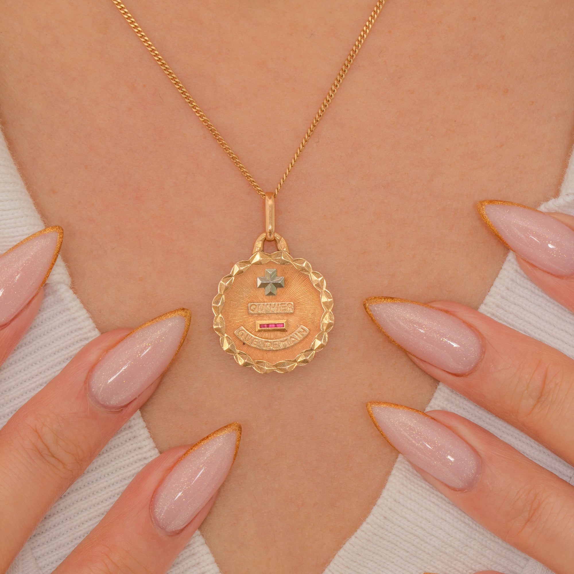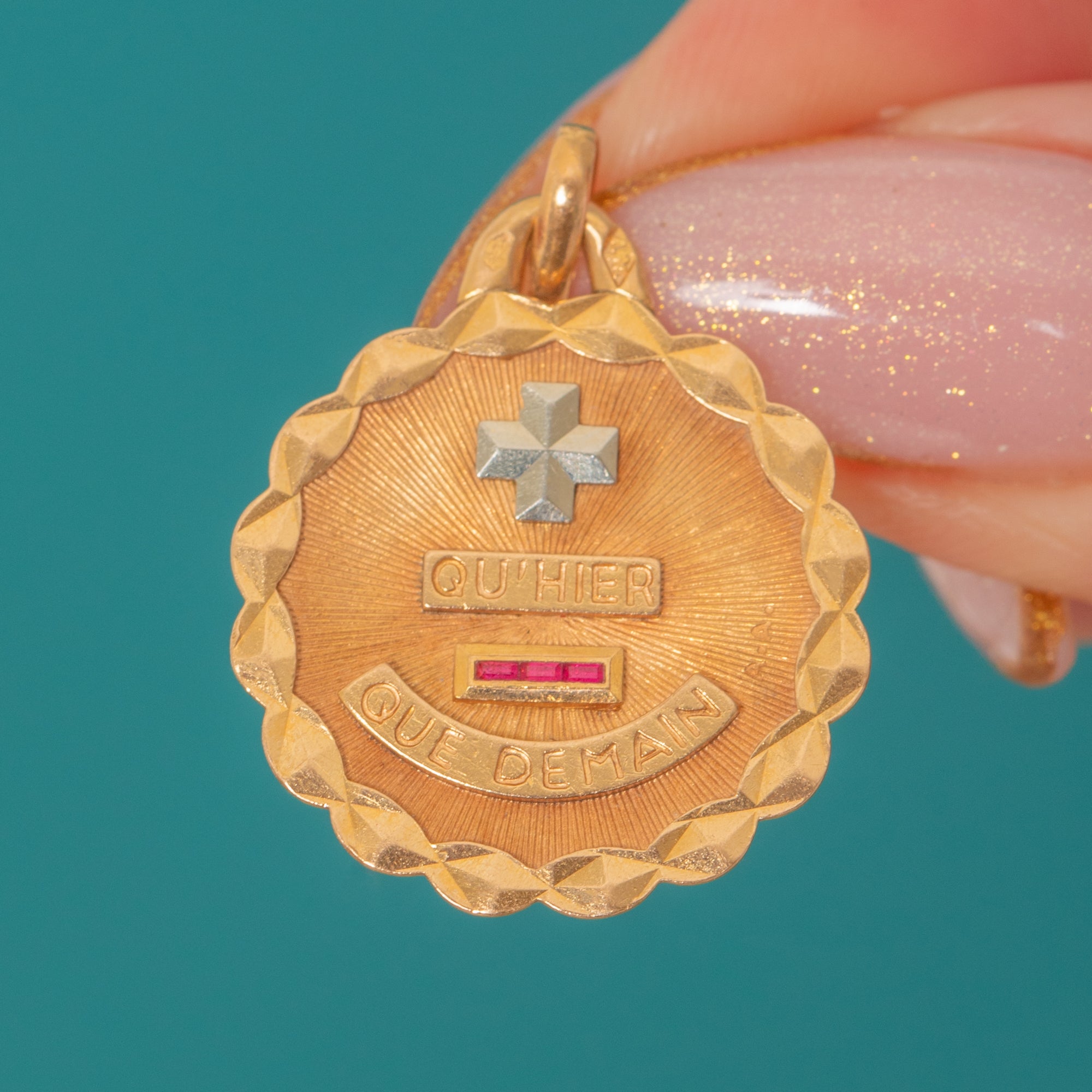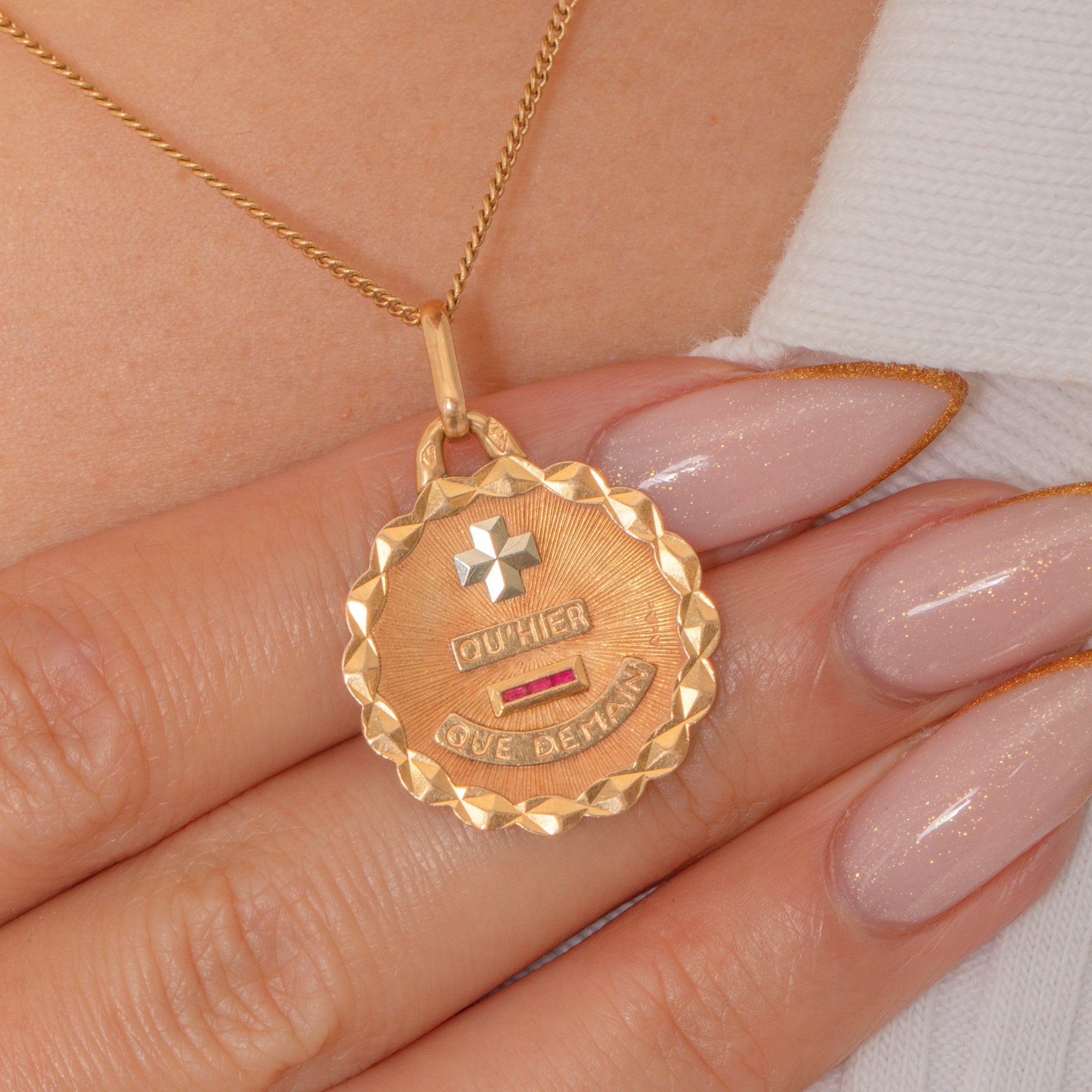 This exquisite antique French Saint Augis love token is a timeless emblem of devotion. Crafted in 18ct Gold, the medal bears the famous rebus “+ qu’hier – que demain,” meaning “More than yesterday, less than tomorrow.”
