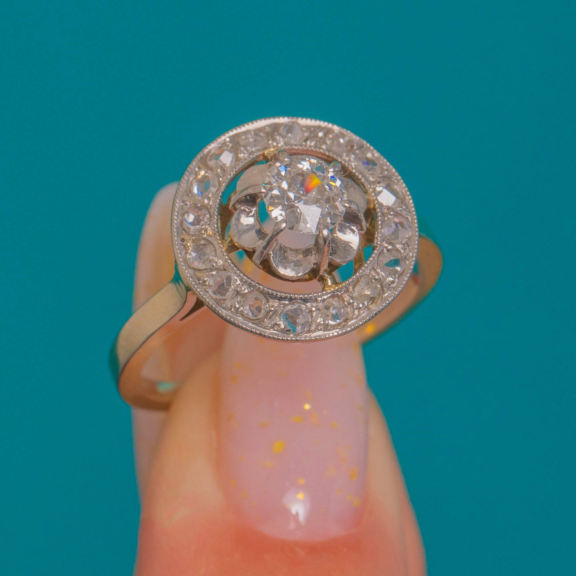 MATERIALS: Tests as 18ct Gold and Platinum, 0.35cts Diamonds (Old European cut centre and Rose-cut halo).
