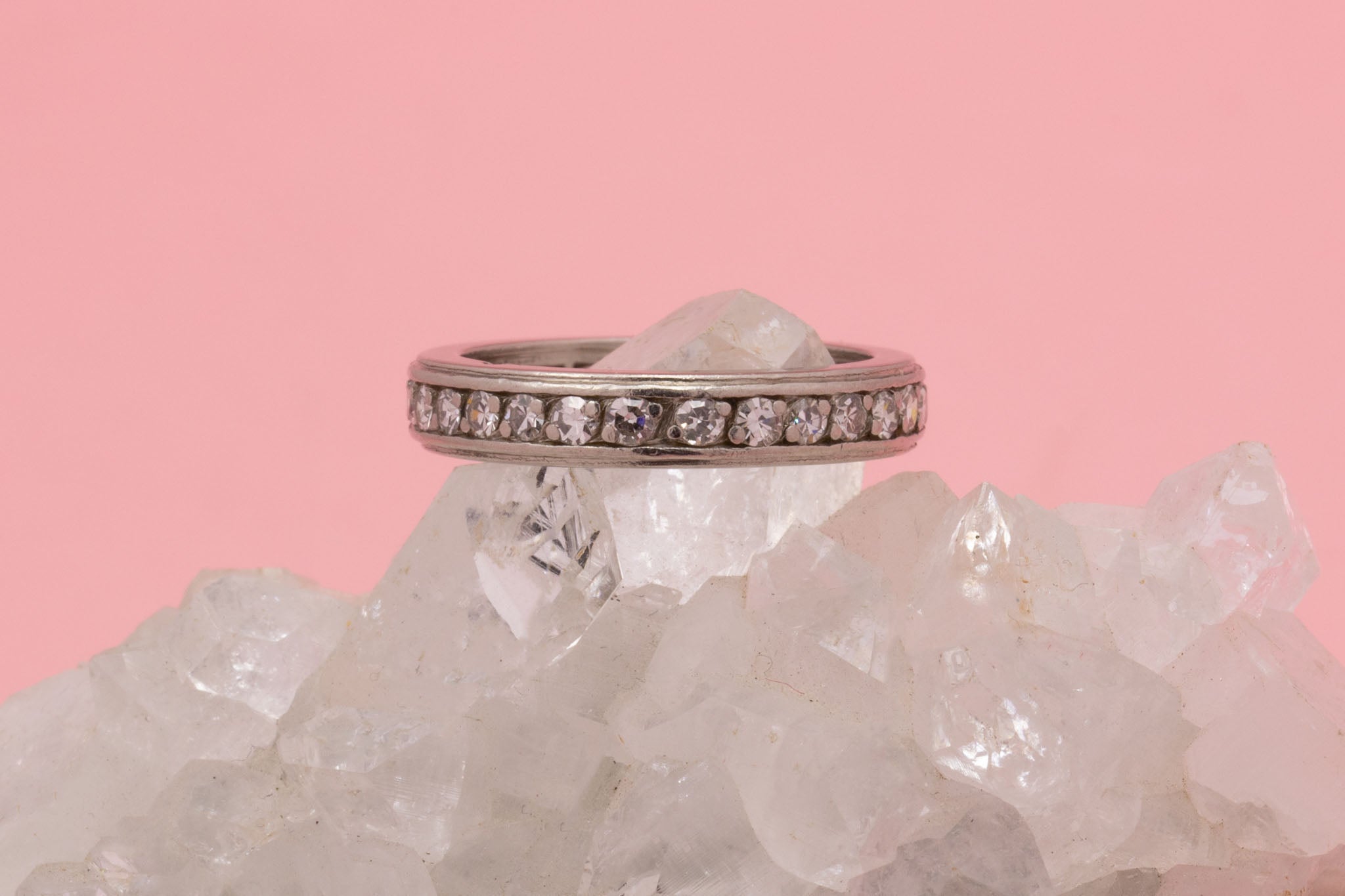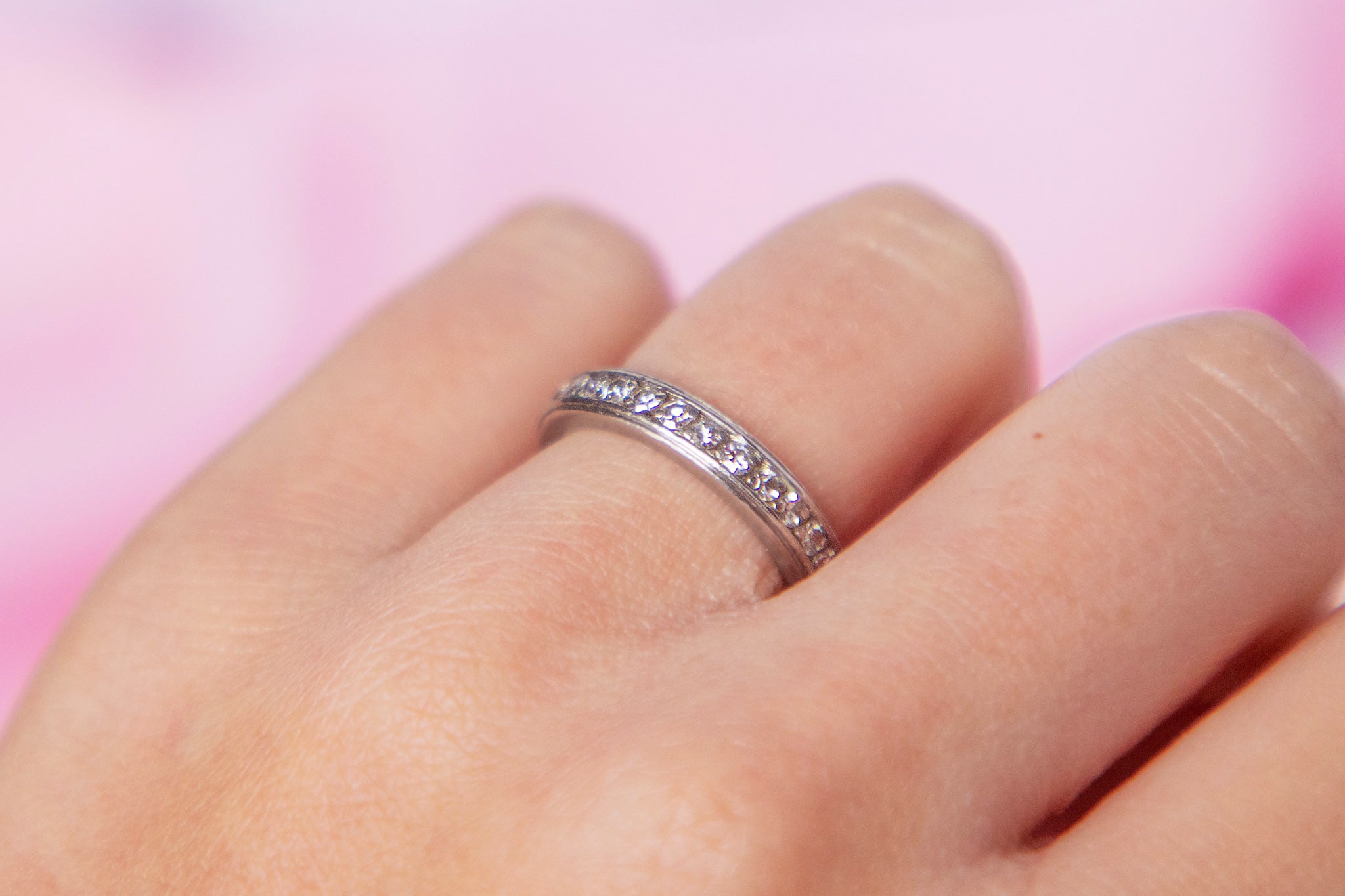 This antique French Platinum Diamond eternity ring is undeniably beautiful! With every inch of her opulent Platinum band adorned with scintillating Diamonds, once on you'll never want to take her off. A beauty from across the waters, her band is stamped with the most desirable French dog heads hallmark, which was used since 1912.