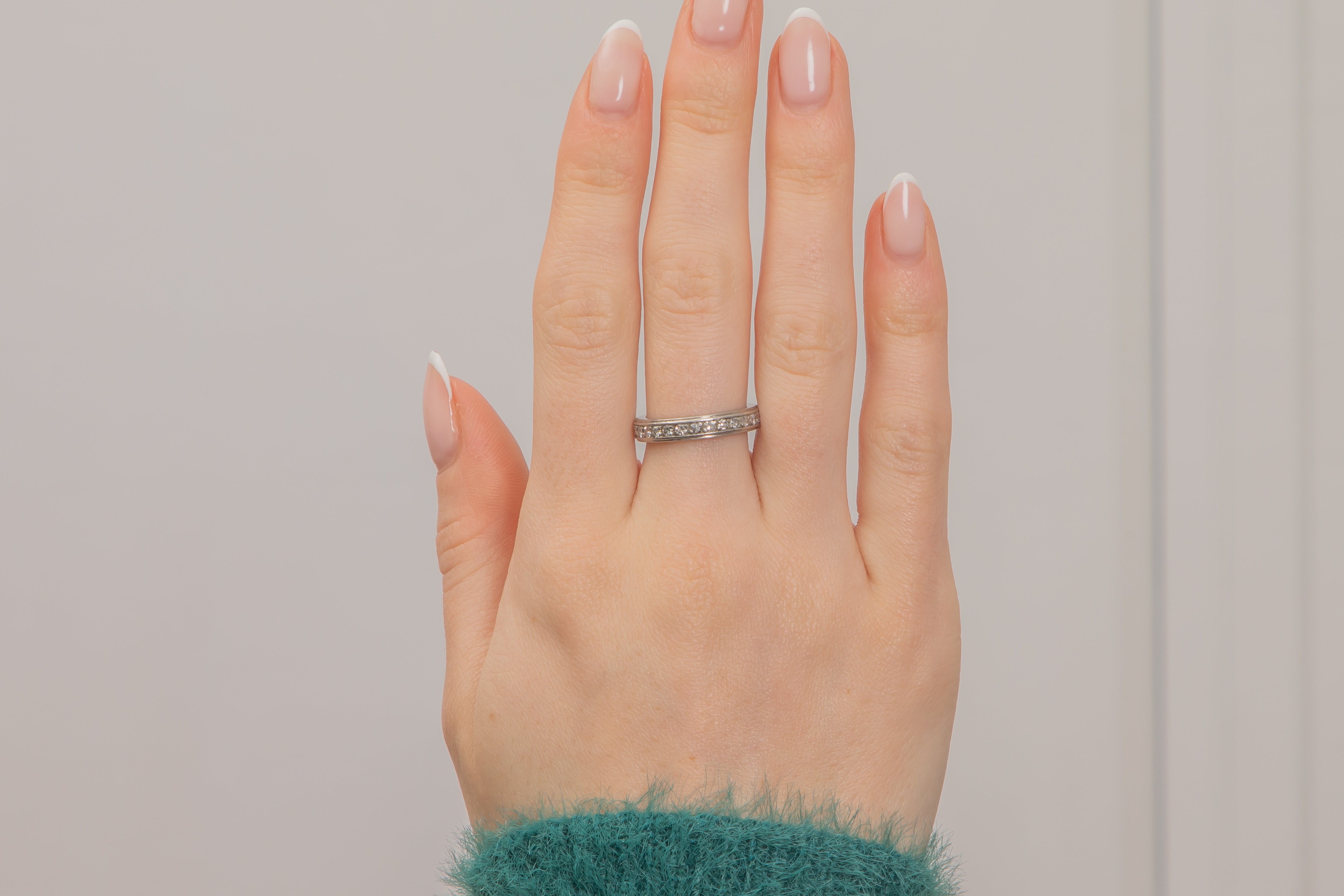 EXCELLENT: This antique French Platinum Diamond eternity ring is in superb condition. All Diamonds remain present, bright, and bursting with sparkle. Her generous Platinum band provides just the right amount of coverage, beautifully framing the Diamonds. Both her French dog head hallmark and maker's mark remain visible! A French treasure to cherish for a lifetime, this Art Deco eternity ring will always be by your side!