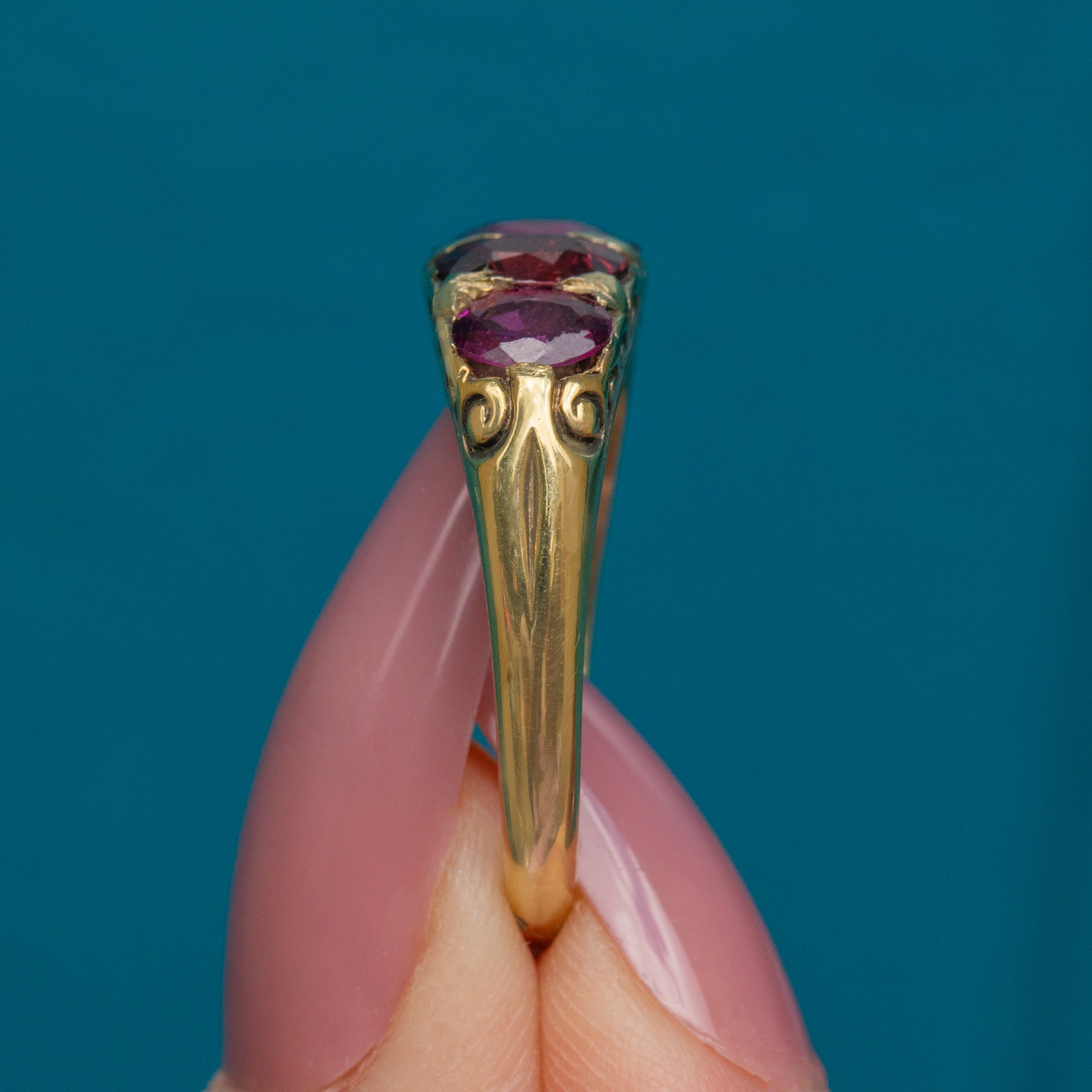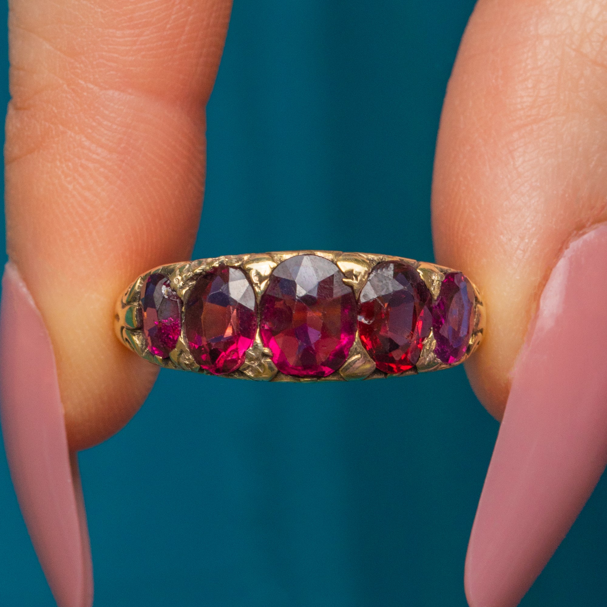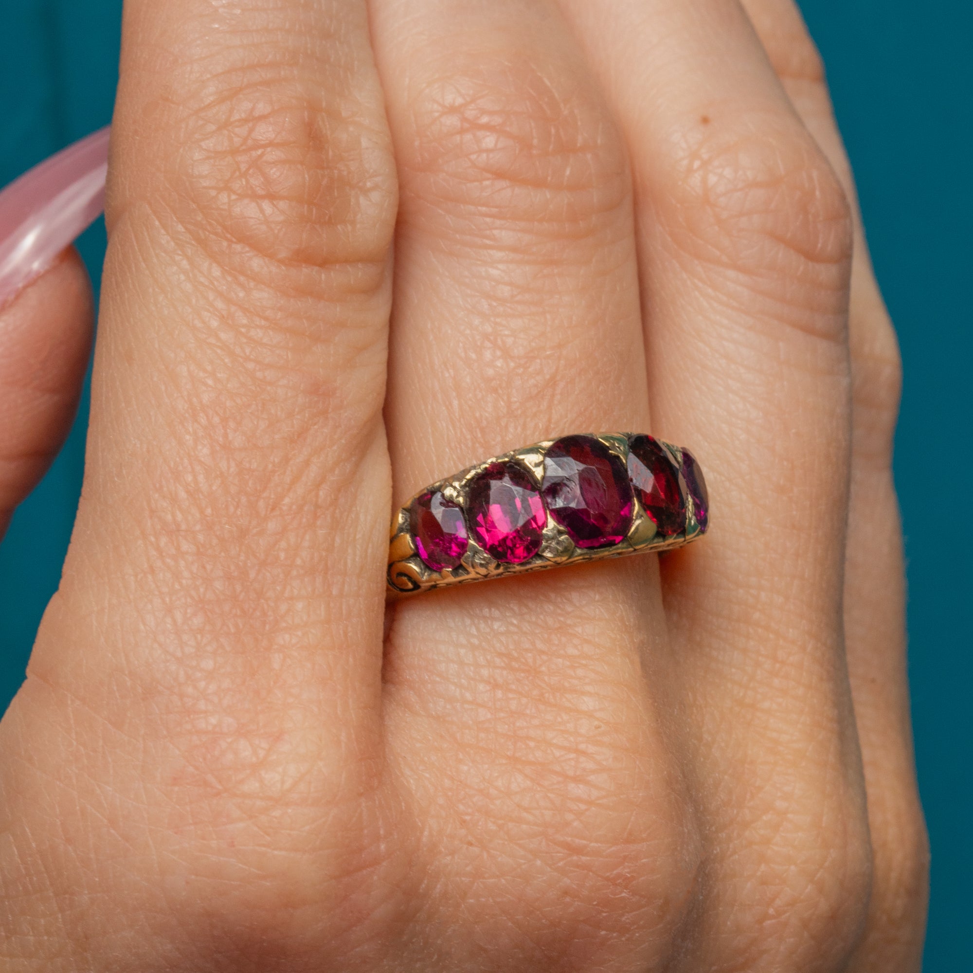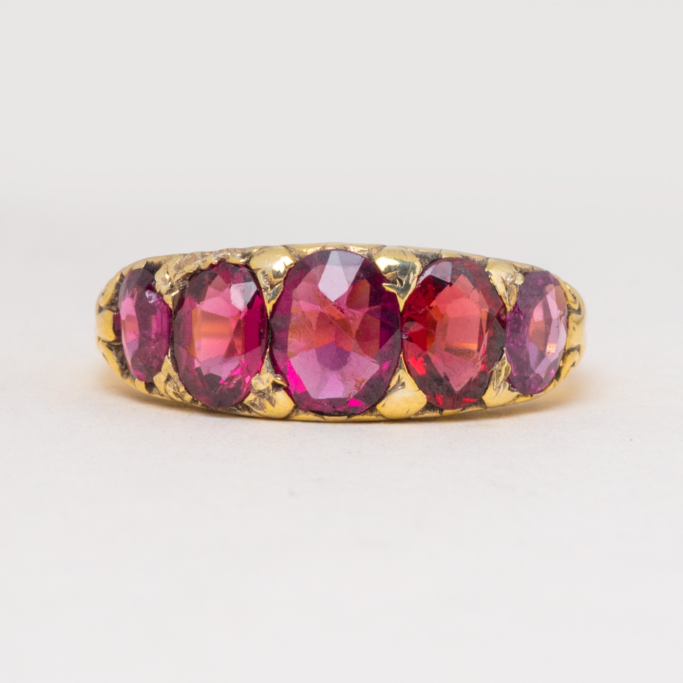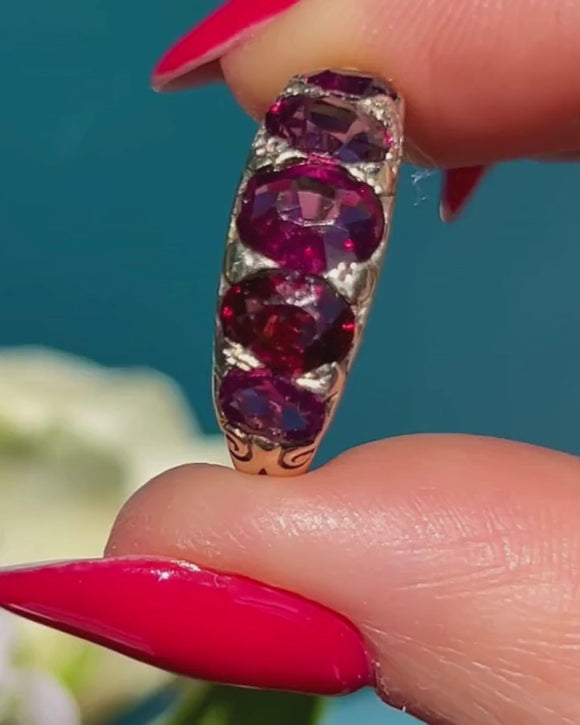 Plucked straight from the 19th century, this antique Garnet five stone ring is full of character! The Garnet gems flaunt a myriad of plum hues that dance between her facets, accompanied by scrolled shoulders for a decorative finish.