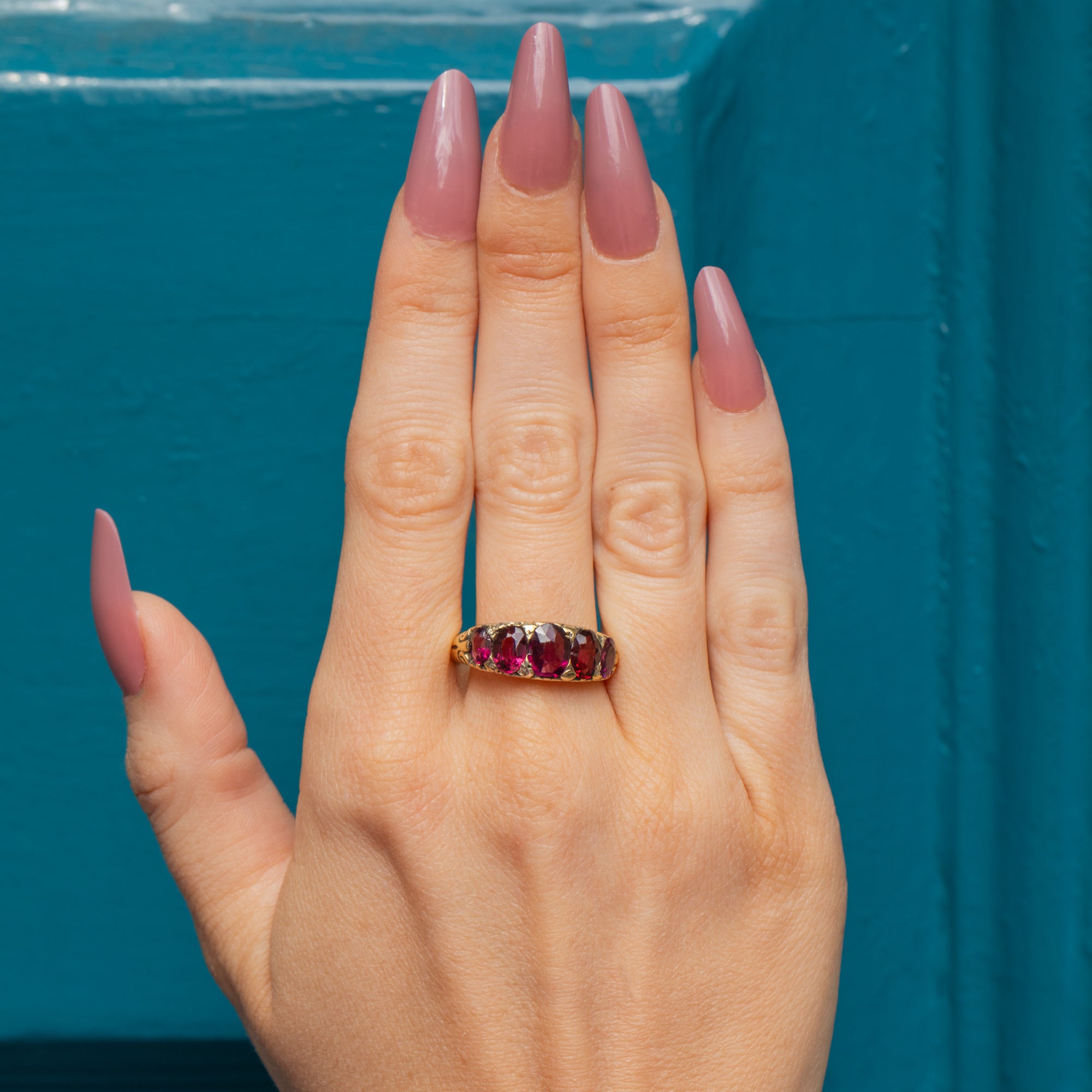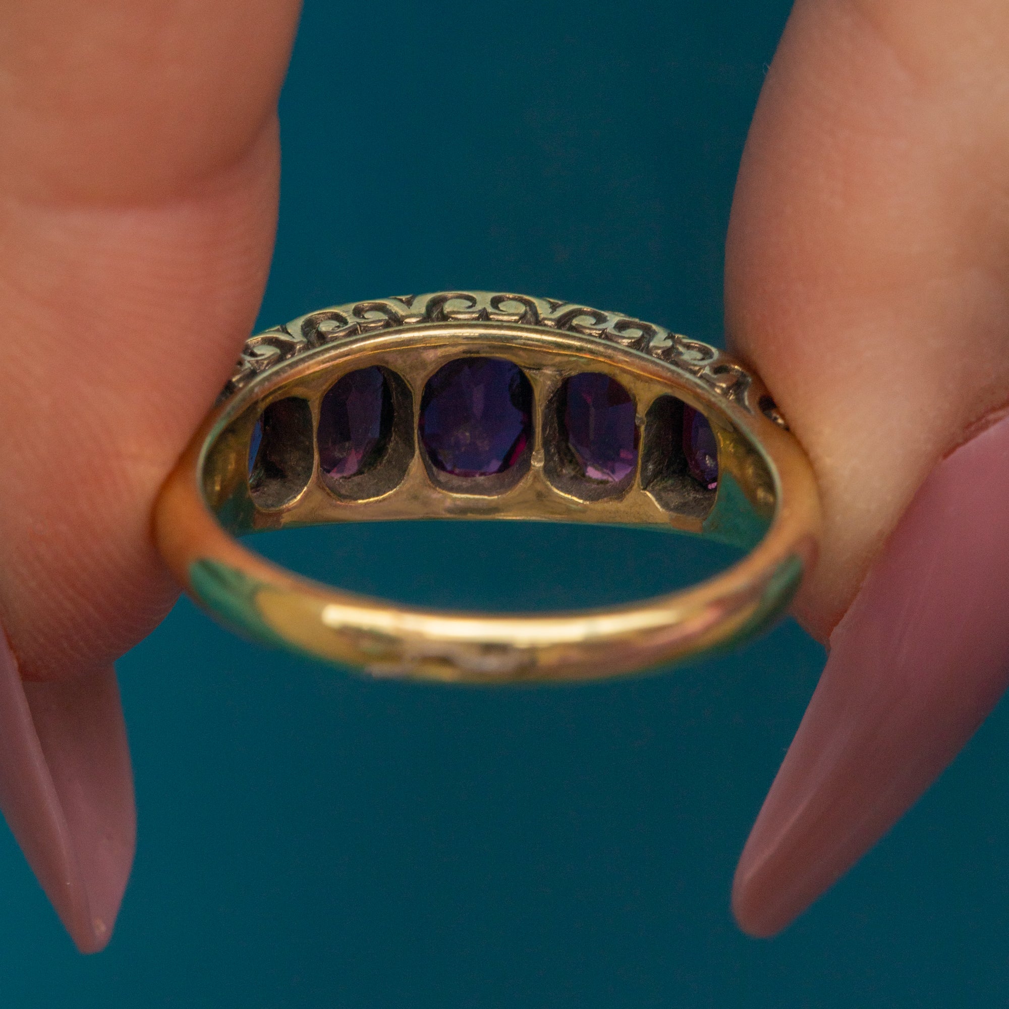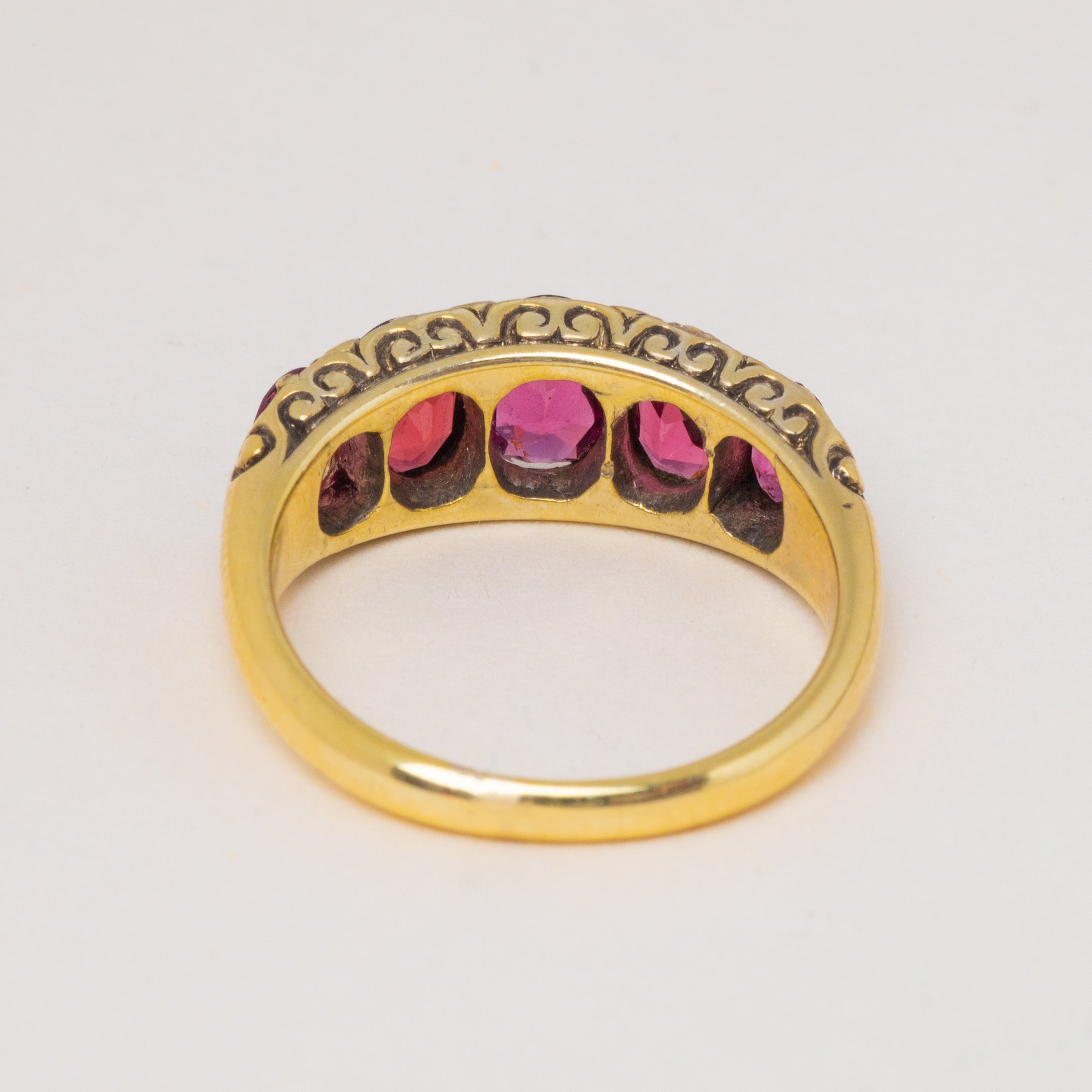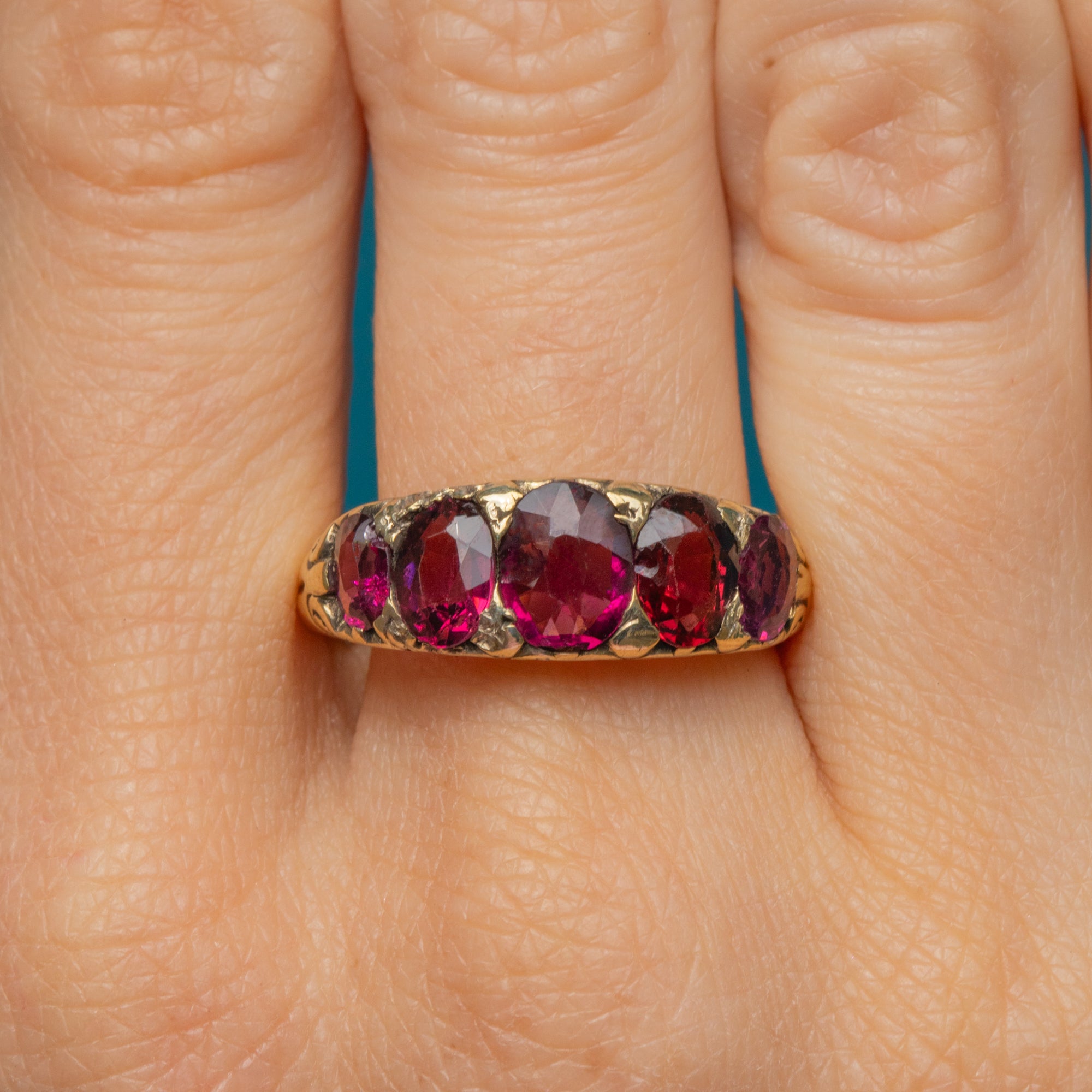 Plucked straight from the 19th century, this antique Garnet five stone ring is full of character! The Garnet gems flaunt a myriad of plum hues that dance between her facets, accompanied by scrolled shoulders for a decorative finish.
