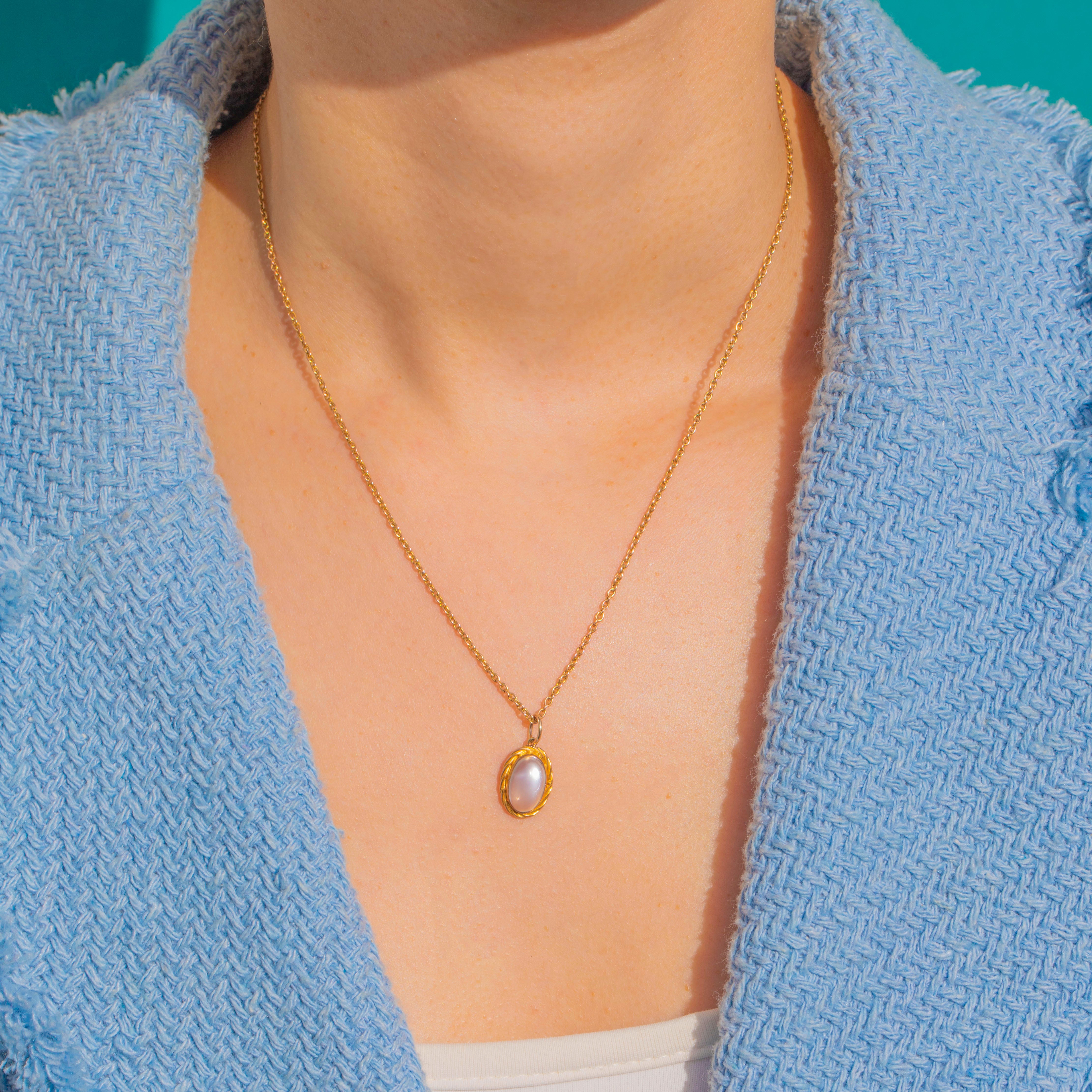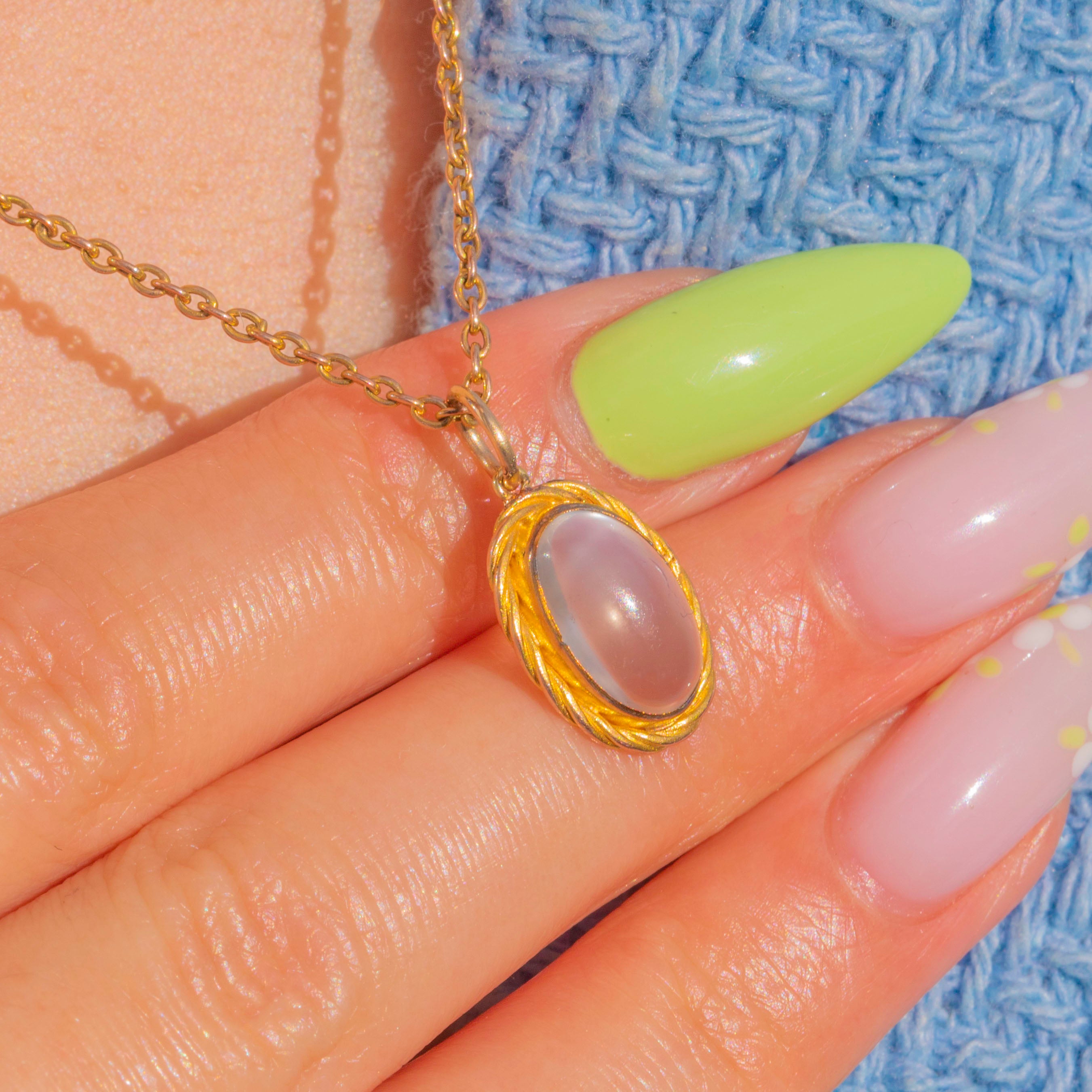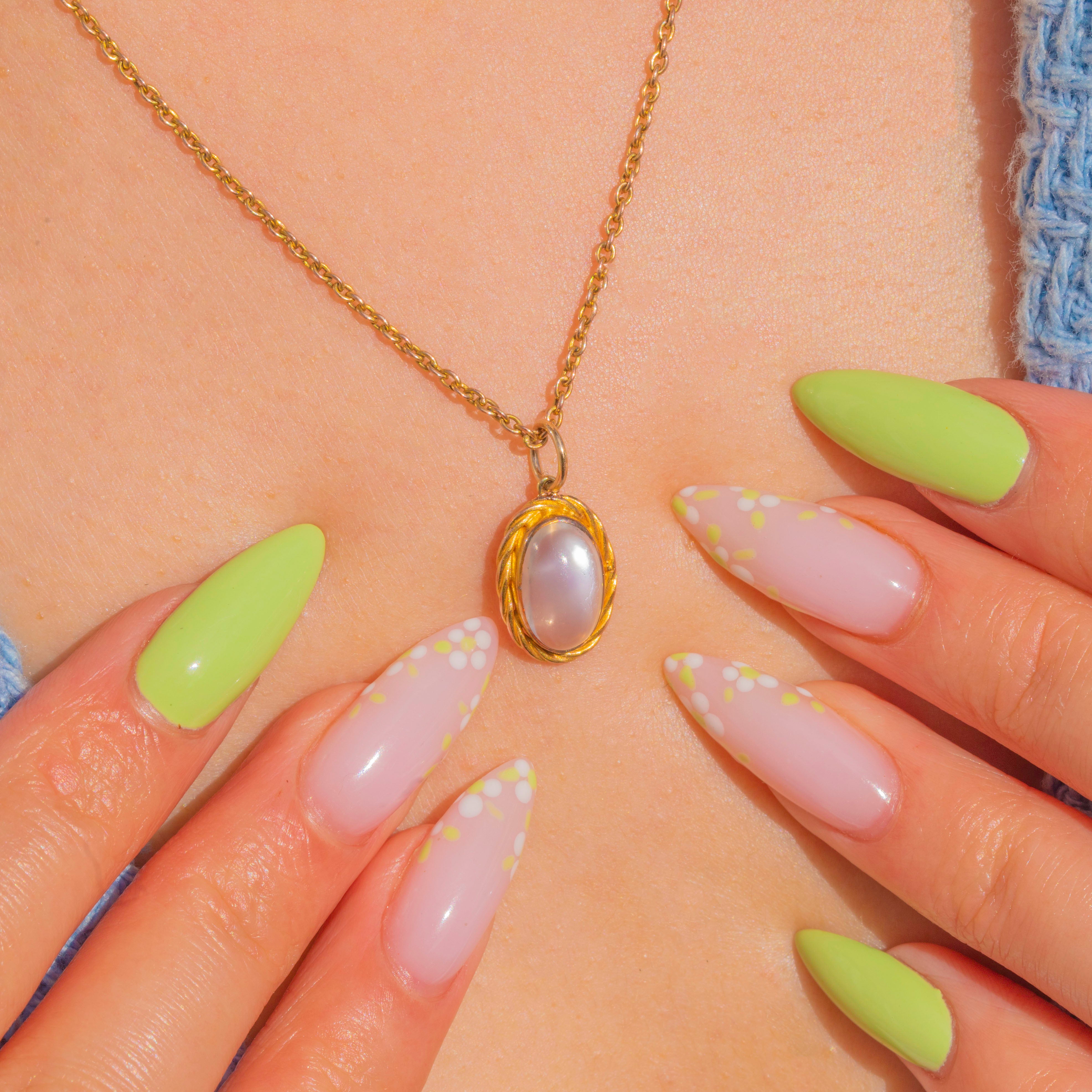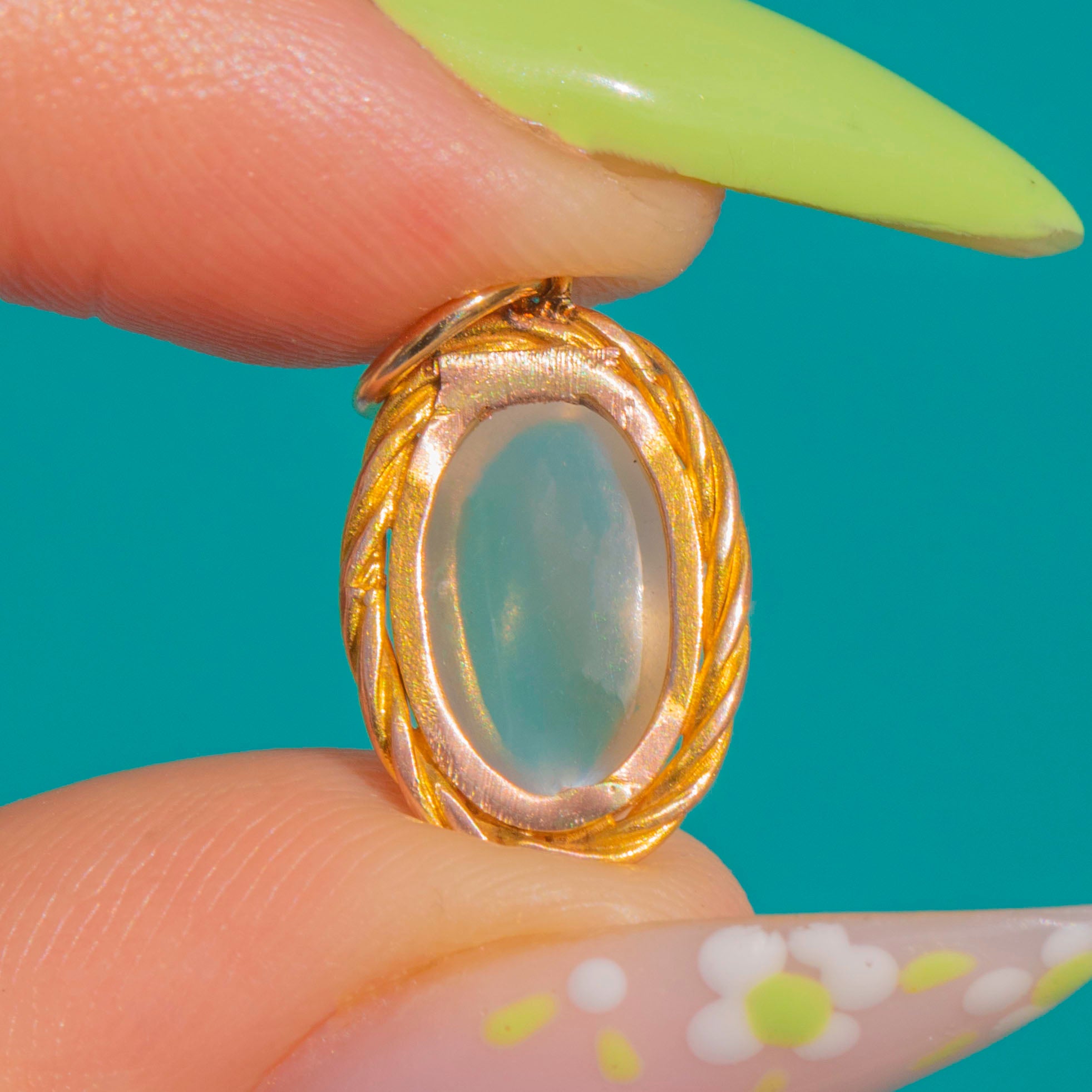 A delicate Victorian Moonstone pendant with a soft ethereal glow. The oval cabochon is framed by a pretty twisted-rope border, its warm gilded Silver lending a buttery hue that beautifully complements the gem’s silvery-blue adularescence.