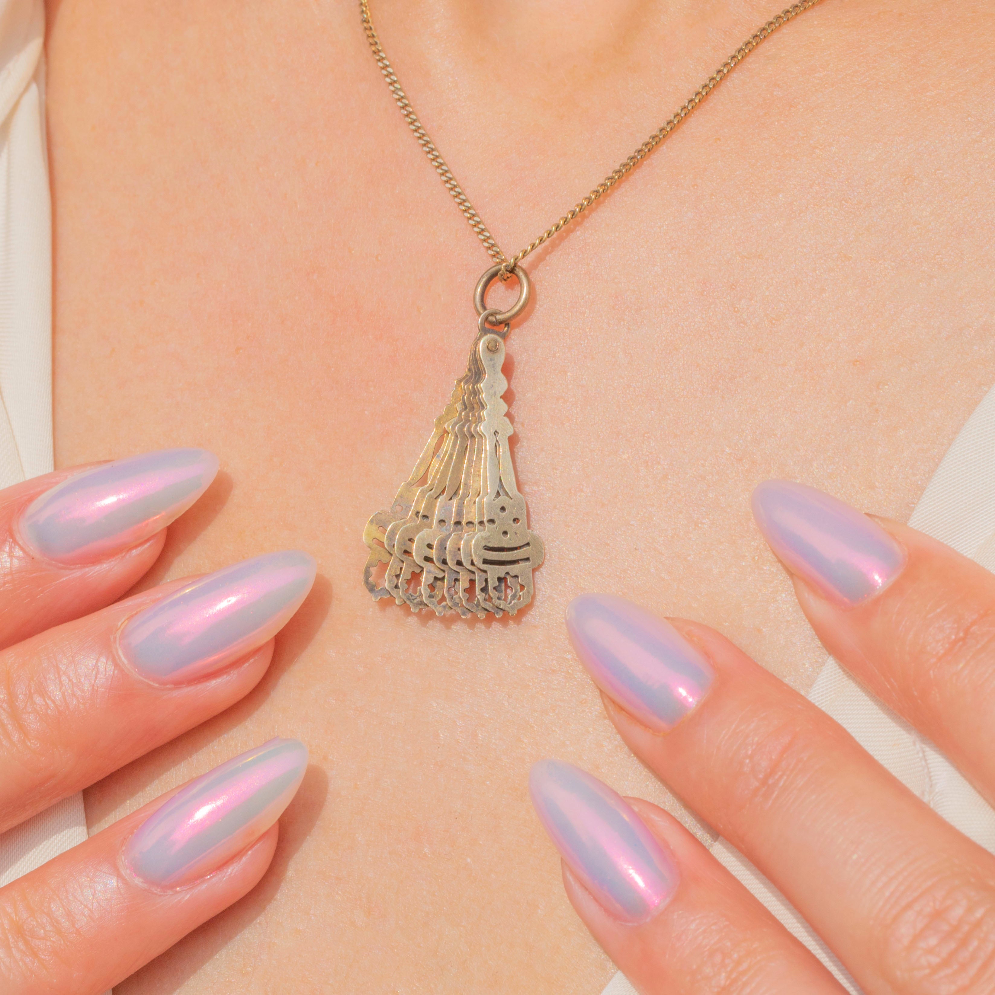 VERY GOOD-EXCELLENT: This Art Deco Gold toned openwork fan pendant is in great condition. Each fan link is well formed and is securely attached. There are some signs of wear to the metal, though this is expected with age. With a securely soldered jump ring, you can wear this openwork pendant with confidence!