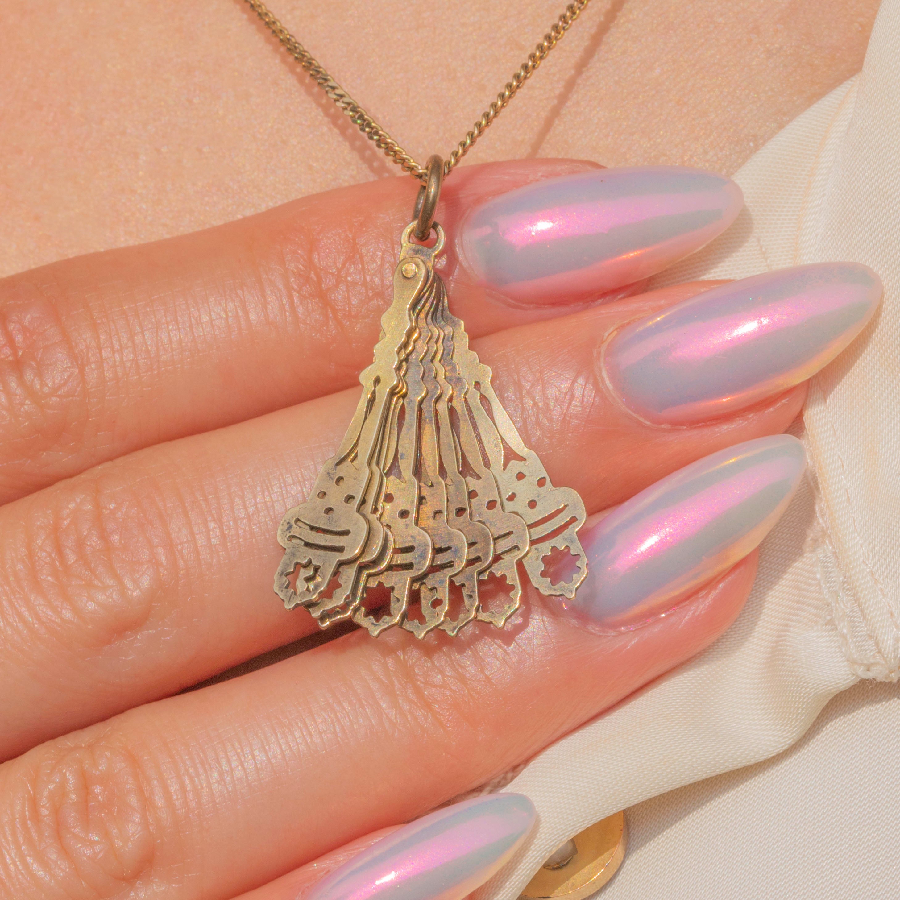 Formed of Gold toned metal, this lightweight pendant has a gorgeous warmth and lovely antique patina, and is the perfect piece to add a touch of Art Deco glamour to your collection!