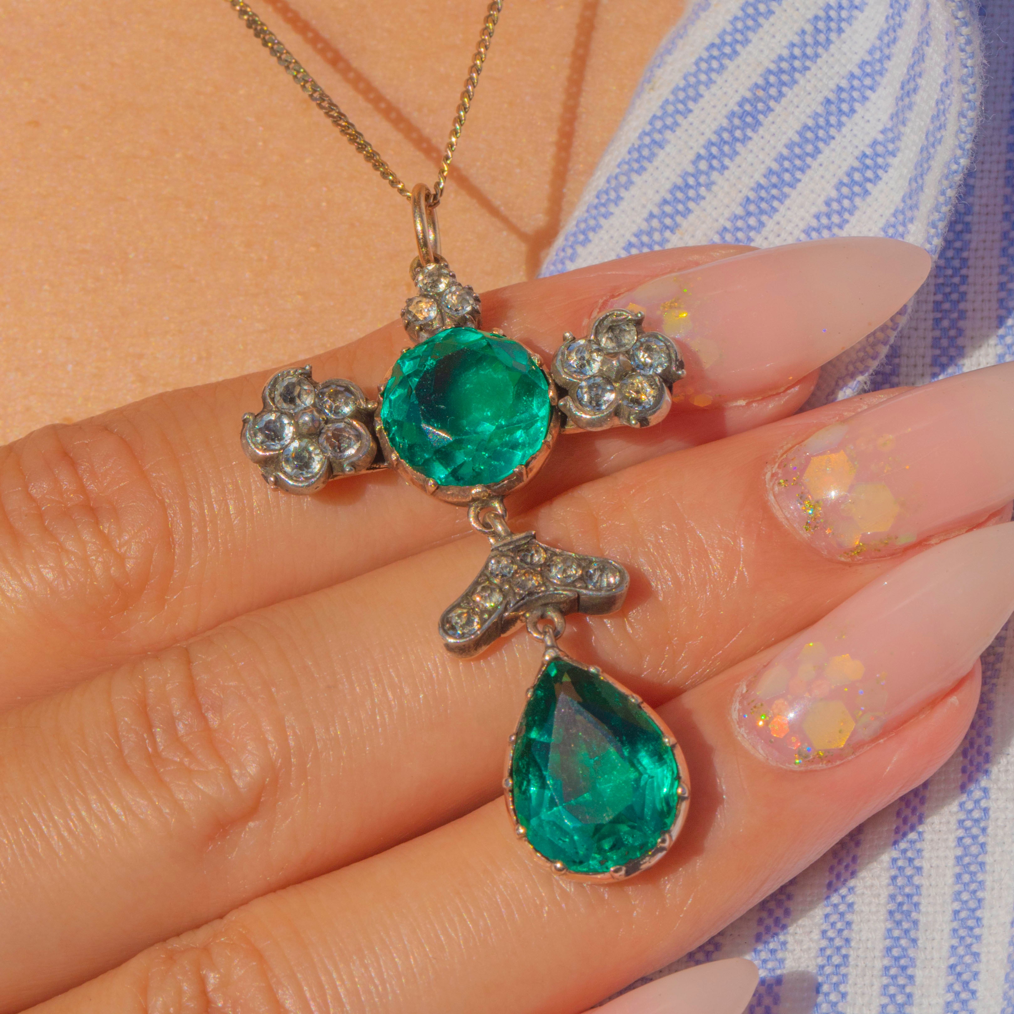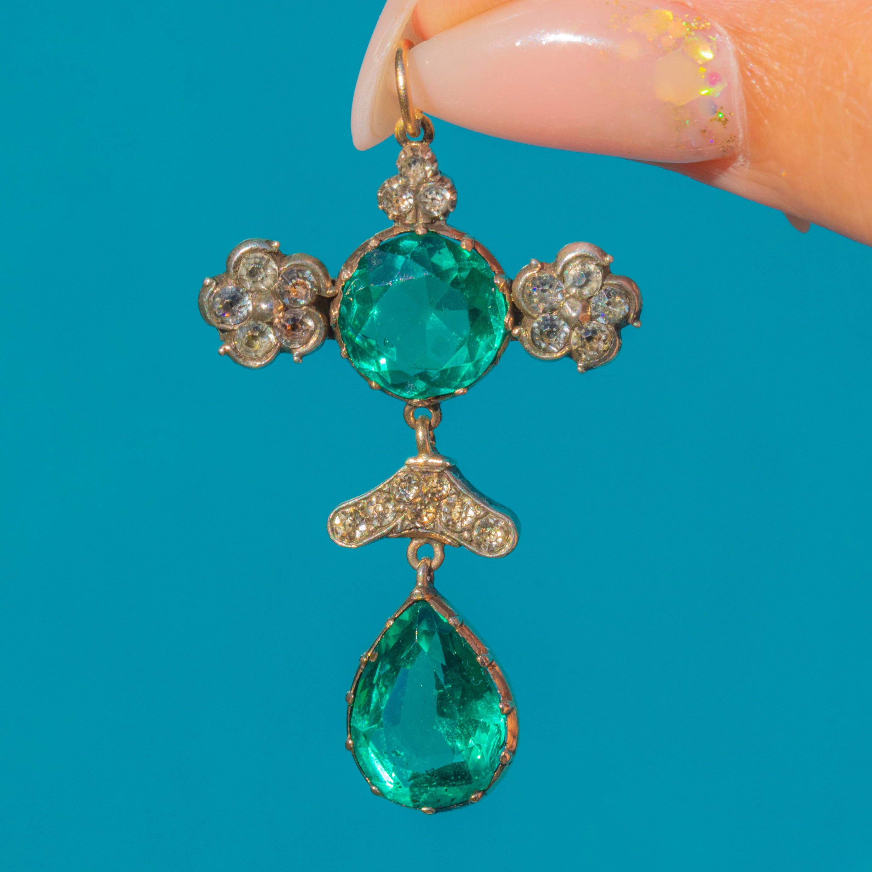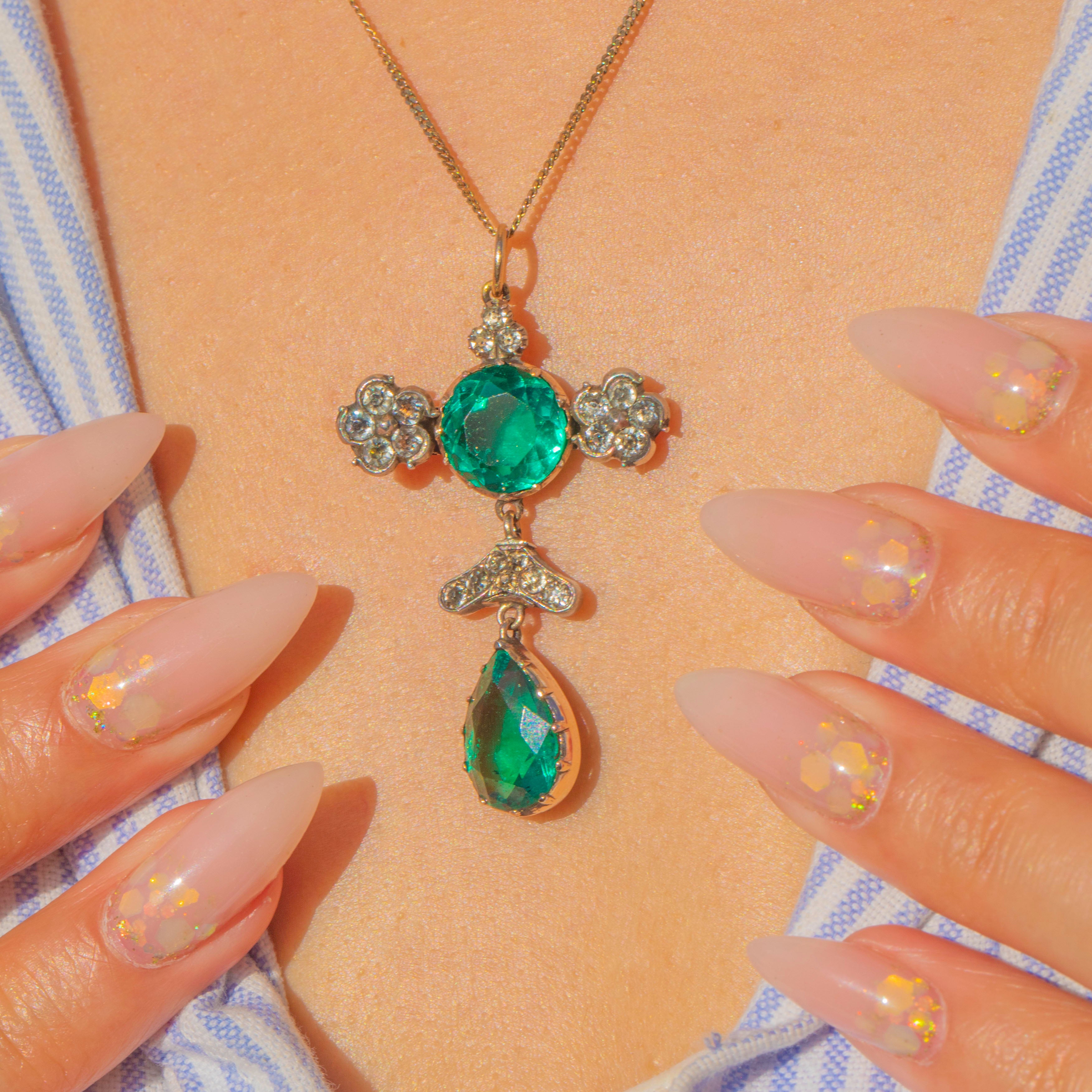 This striking Victorian pendant is crafted in 9ct Gold and Sterling Silver, set with vivid green and white Paste stones in an unusual drop design. The top section resembles a cruciform, centred by a brilliant green round Paste, flanked by white Paste-set flower clusters, and suspending a large pear-shaped green drop below.