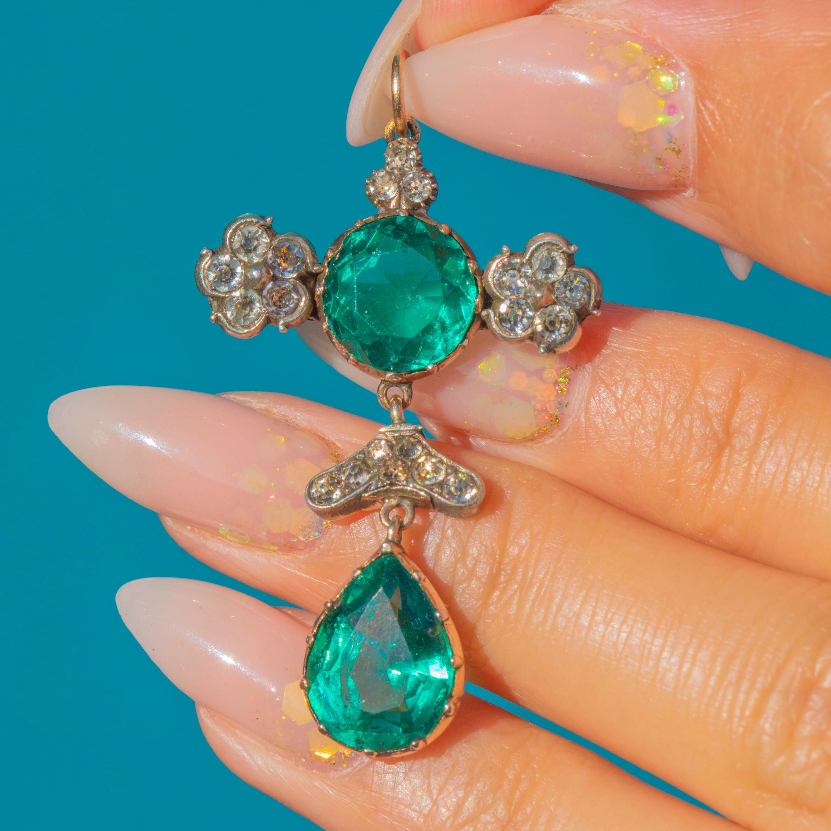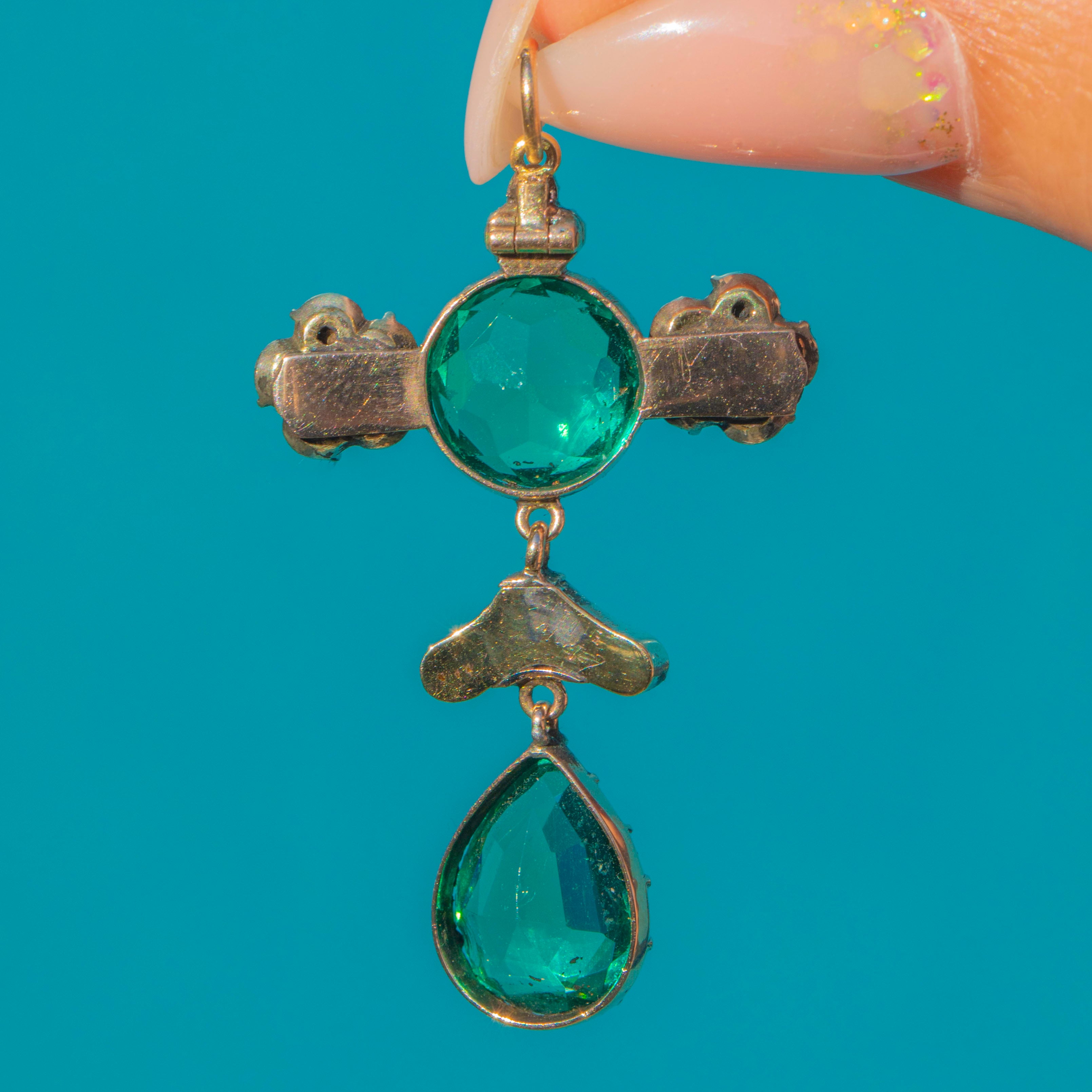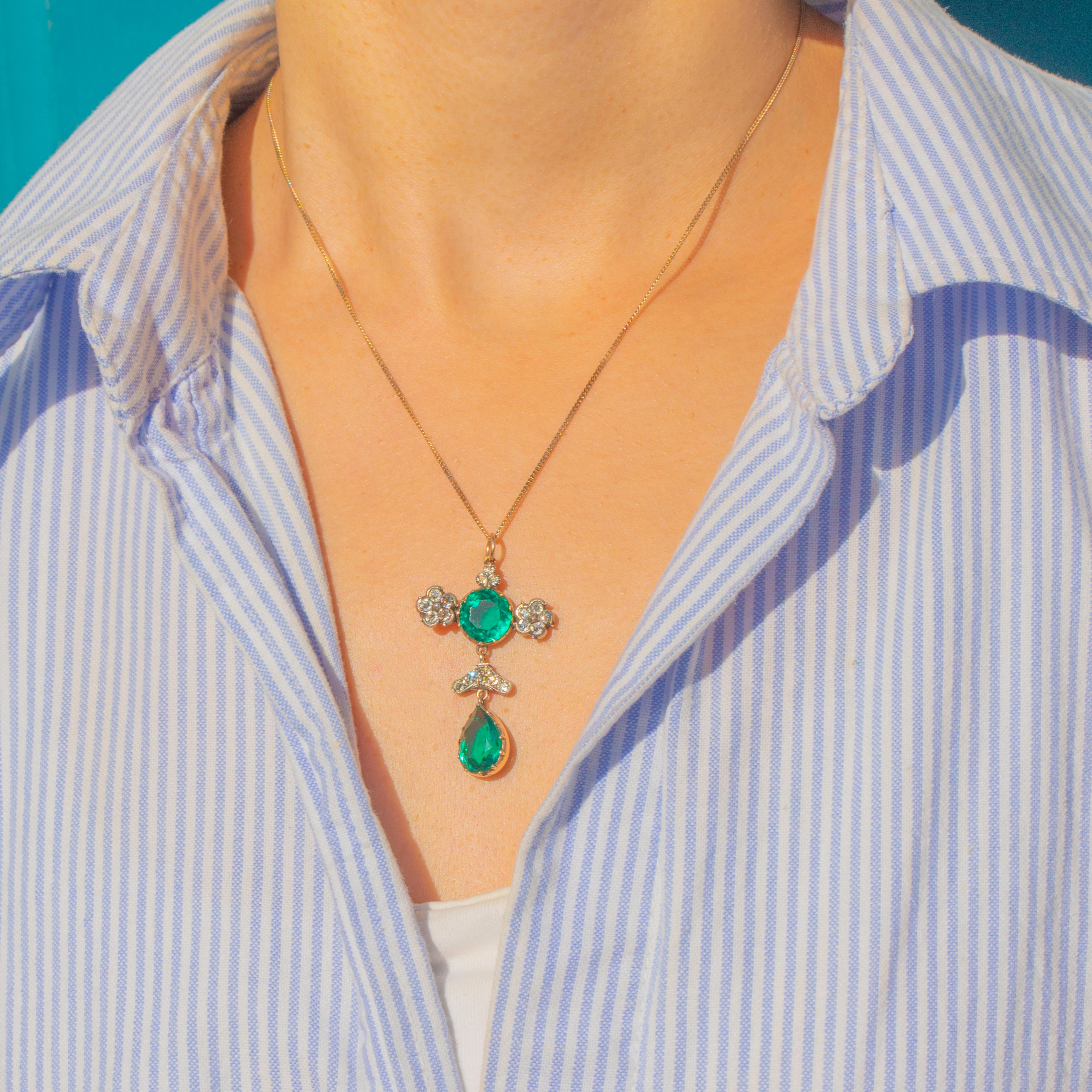 This striking Victorian pendant is crafted in 9ct Gold and Sterling Silver, set with vivid green and white Paste stones in an unusual drop design. The top section resembles a cruciform, centred by a brilliant green round Paste, flanked by white Paste-set flower clusters, and suspending a large pear-shaped green drop below.