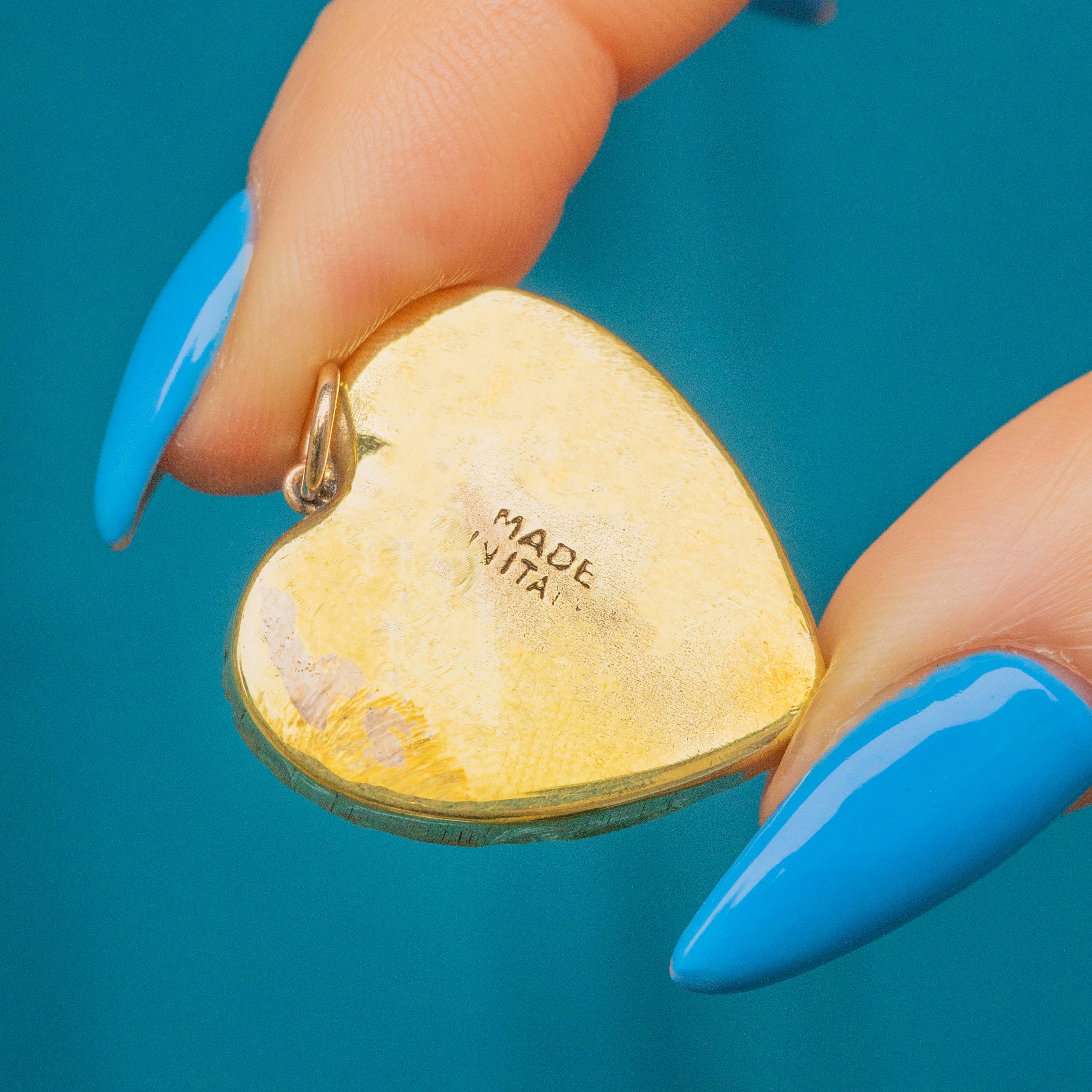 VERY GOOD. This antique Micro-Mosaic heart pendant is in very good condition. The pendant has kept very well over the course of its lifetime, with the micro mosaic pieces remaining secure and undamaged, which is quite incredible! The back of the pendant does bear some sign of its age, but this is not visible during wear and hardly affects the overall impact of the piece. She's a treasure that you won't regret bringing home.