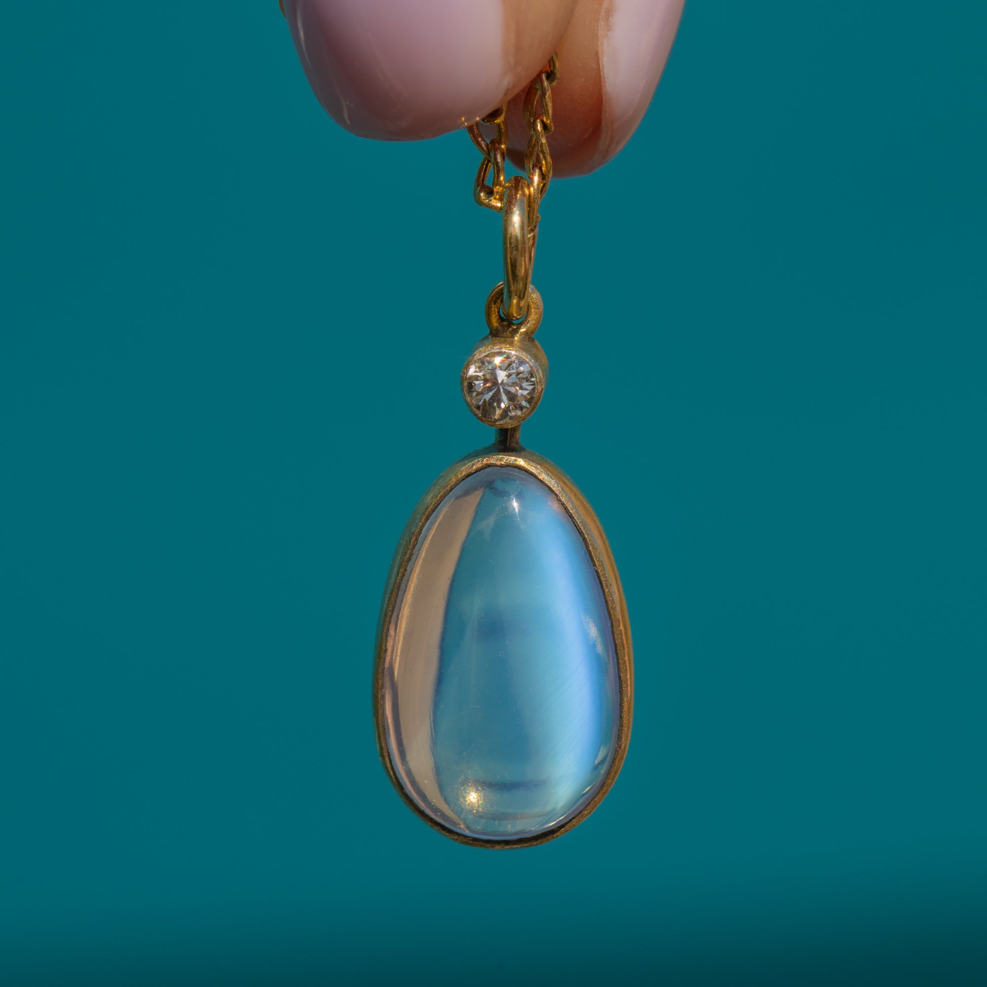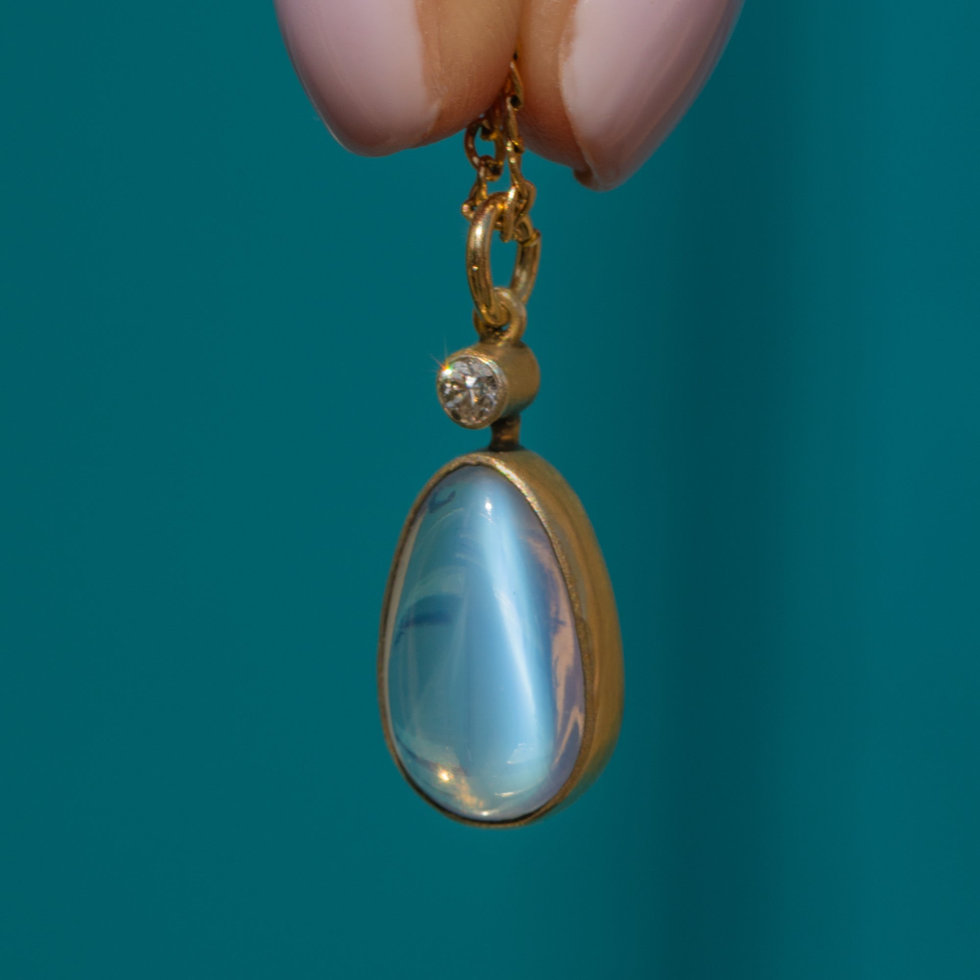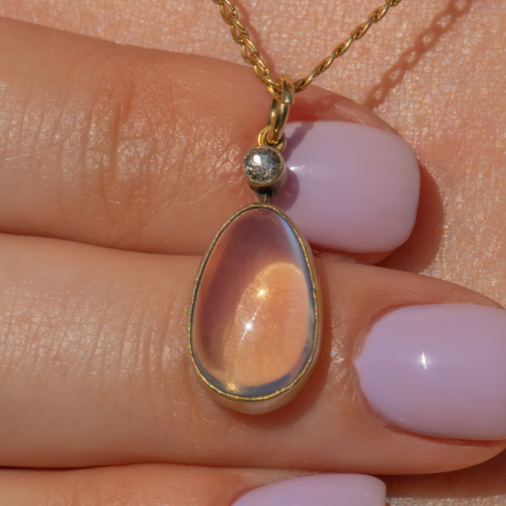 Soak up the ethereal beauty of this antique Moonstone Diamond drop pendant. Studded on top with a Diamond, her vivid sparkle creates a striking contrast against the blue schiller that billows across her smooth 2.90ct Moonstone cabochon.