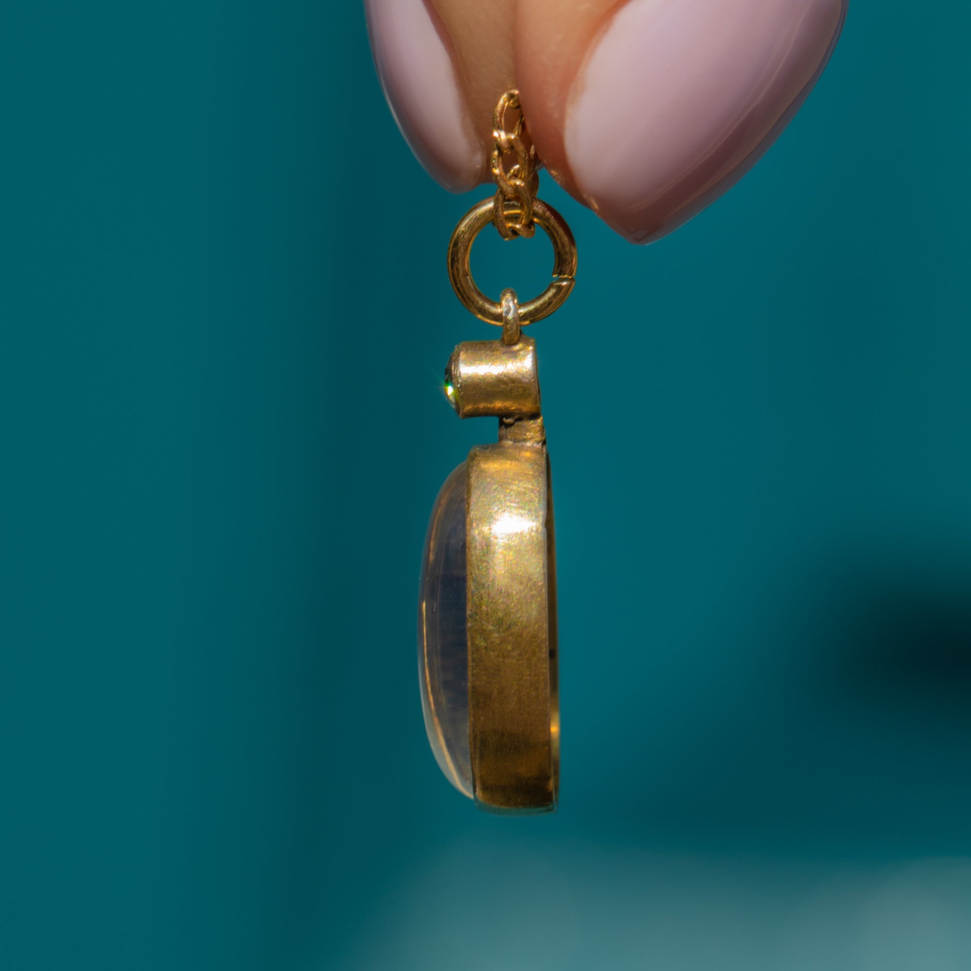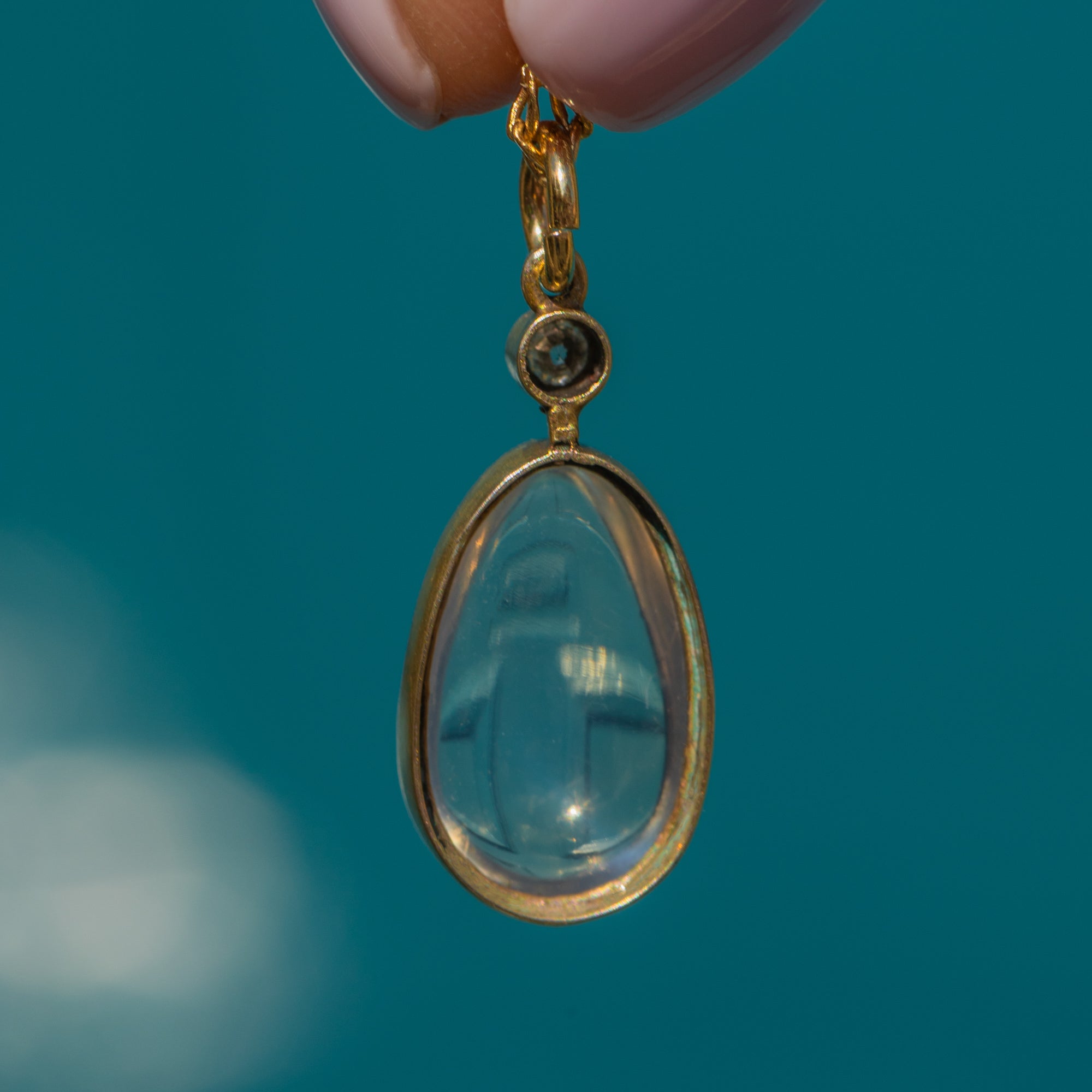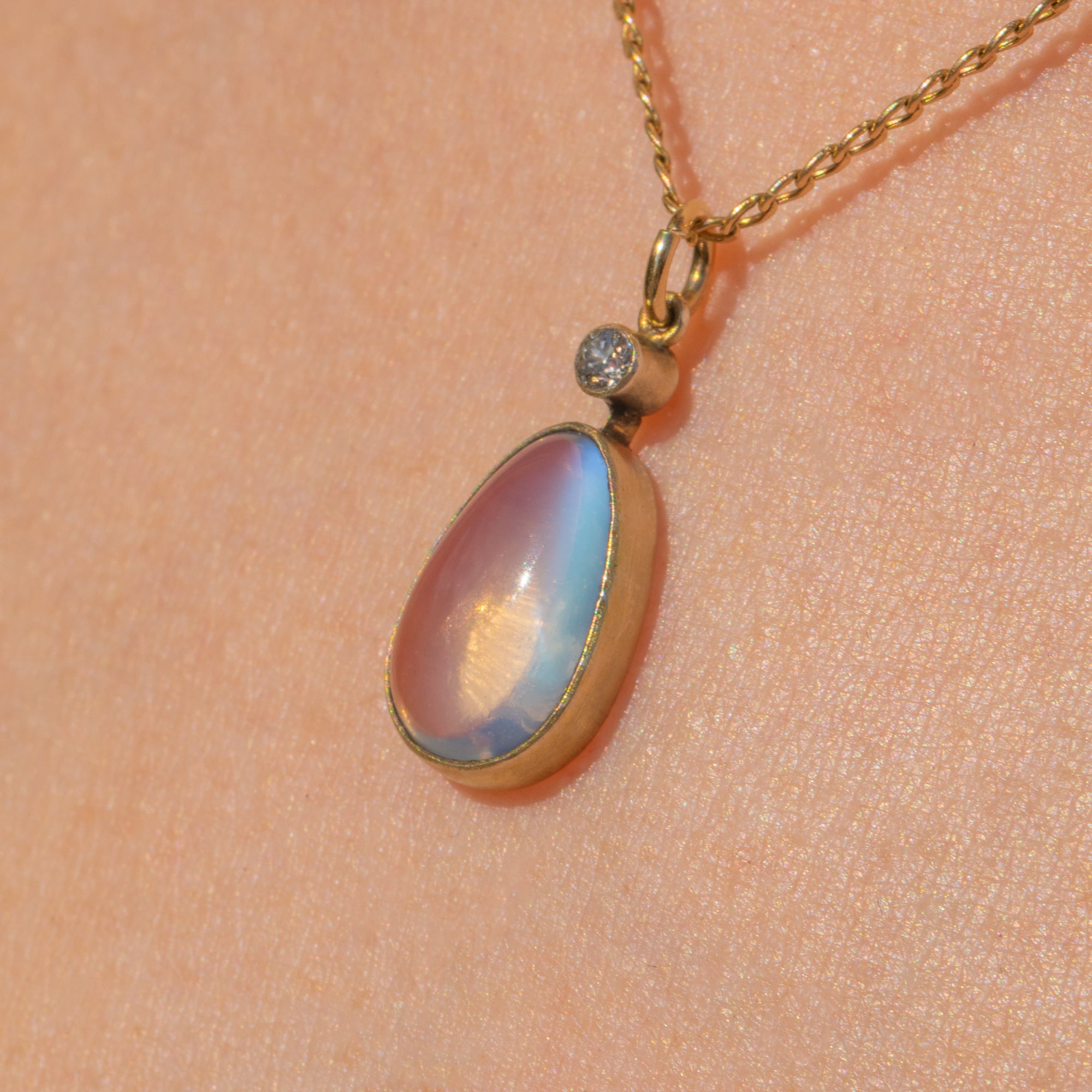 Soak up the ethereal beauty of this antique Moonstone Diamond drop pendant. Studded on top with a Diamond, her vivid sparkle creates a striking contrast against the blue schiller that billows across her smooth 2.90ct Moonstone cabochon.