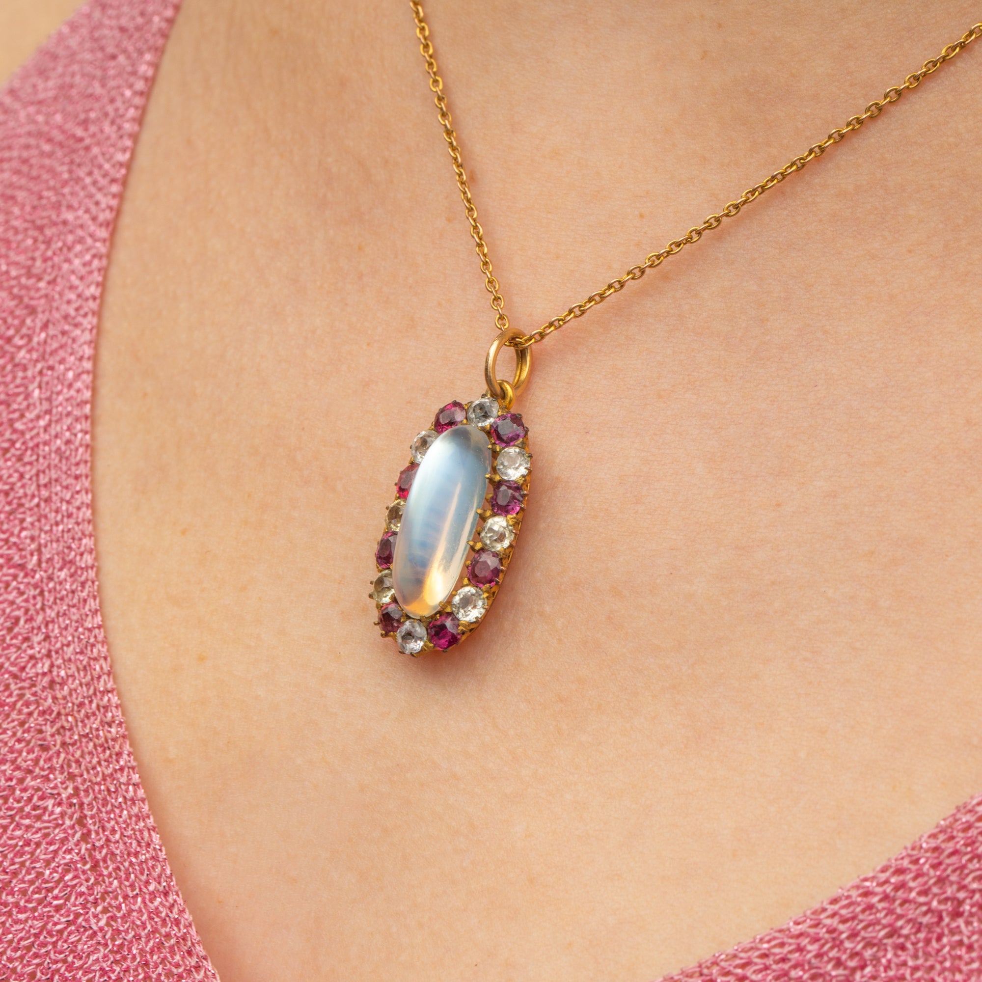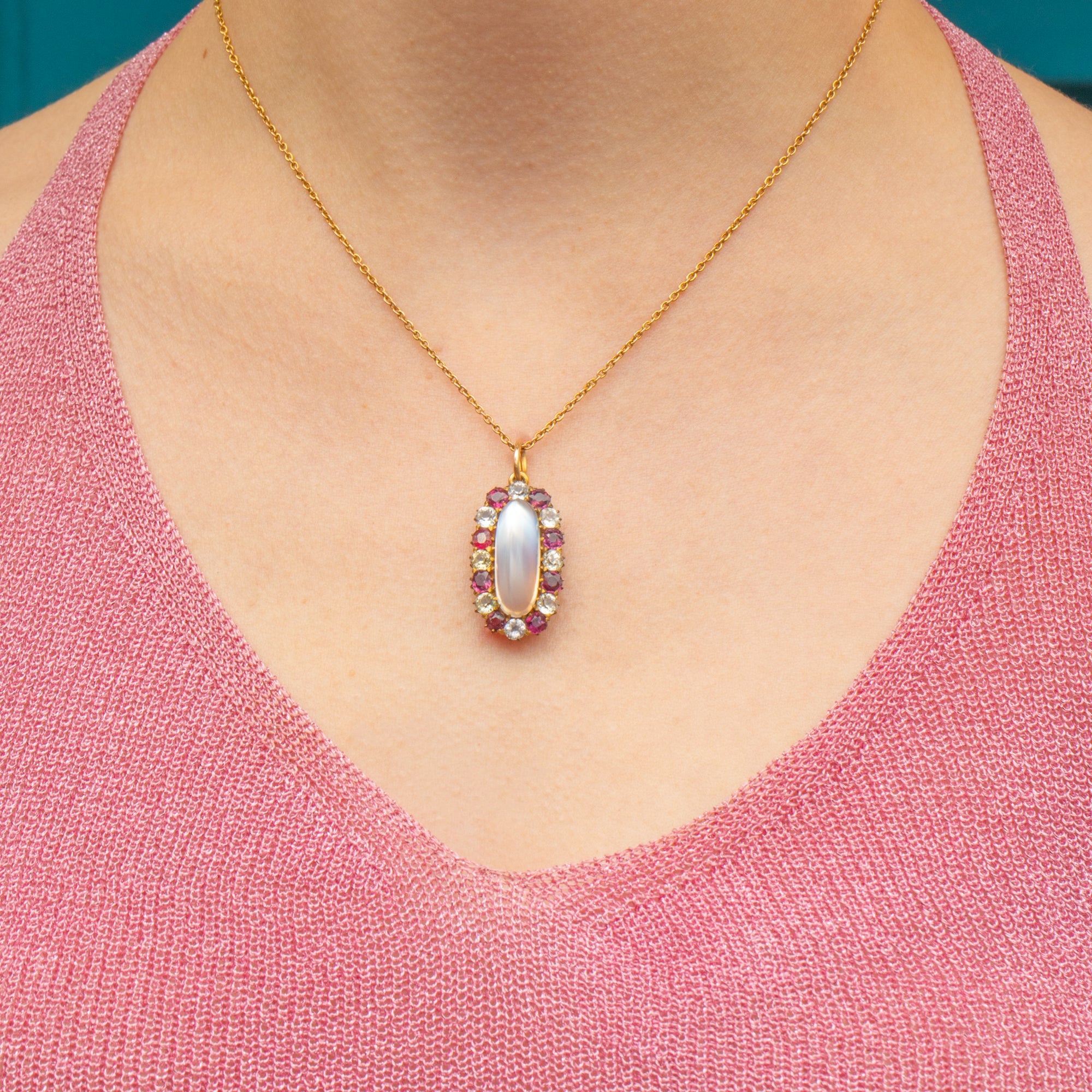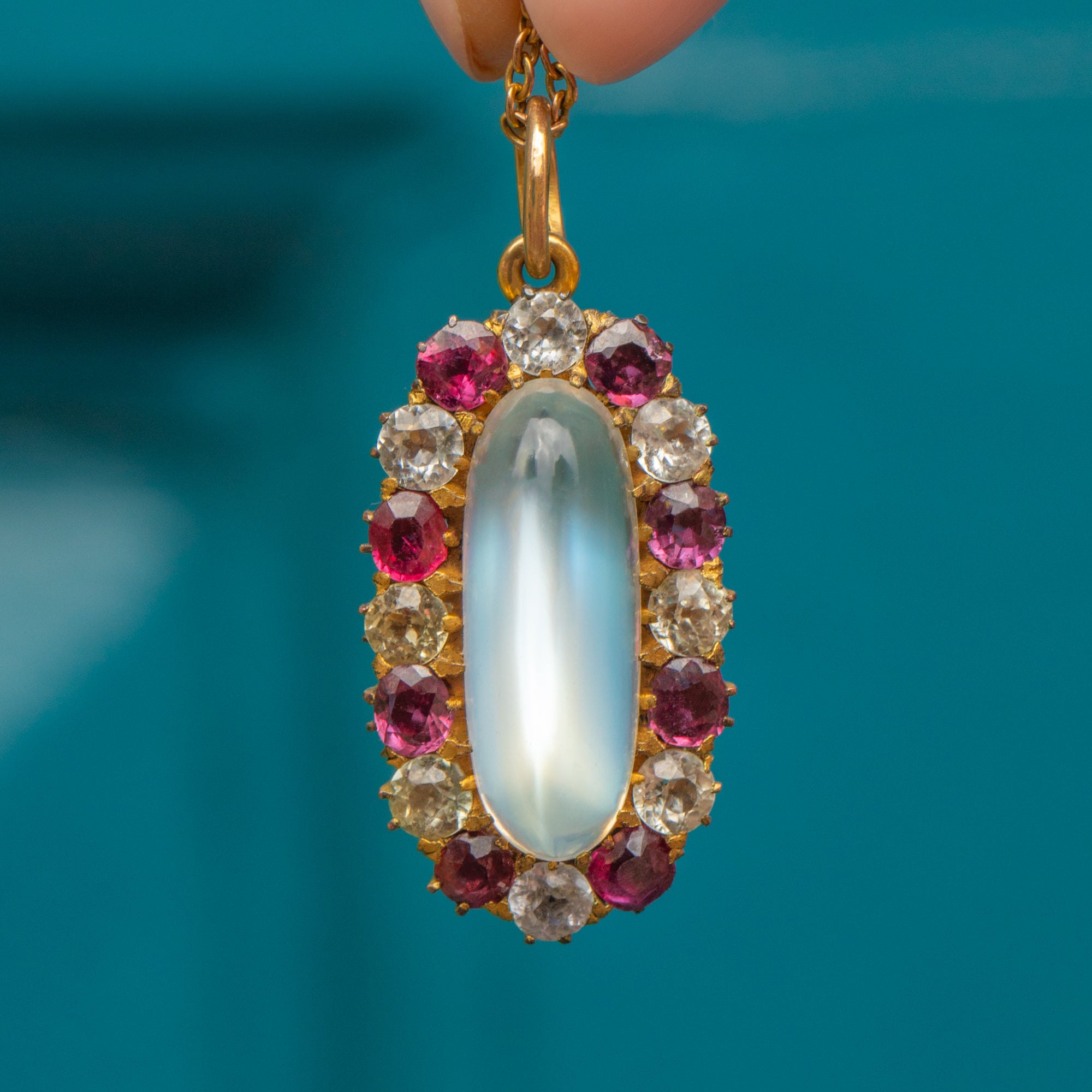 We adore this antique Moonstone Ruby & white Sapphire Cluster pendant! The sleek 5.70ct Moonstone cabochon captures the eye with its mystical moonlight hue, displaying a magnificent silver schiller under the light.
