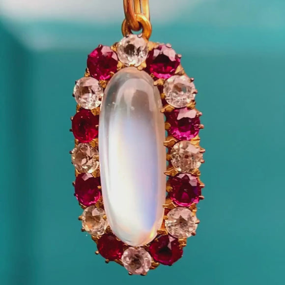 Fuchsia-hued Rubies and white Sapphire gemstones halo the Moonstone, creating a mouthwatering combination. This delectable pendant is bursting with colour; she will make a splendid addition to your antique jewellery collection!