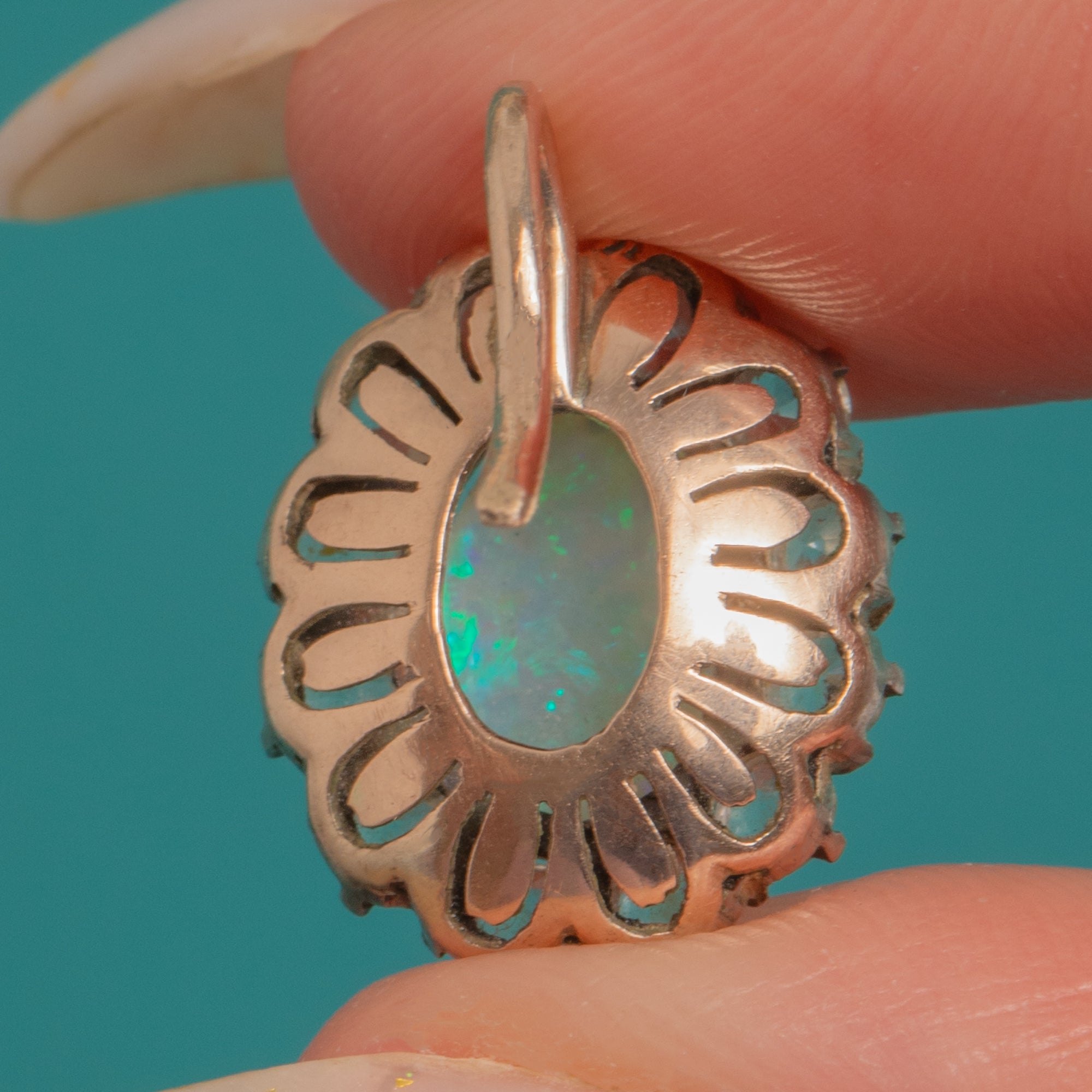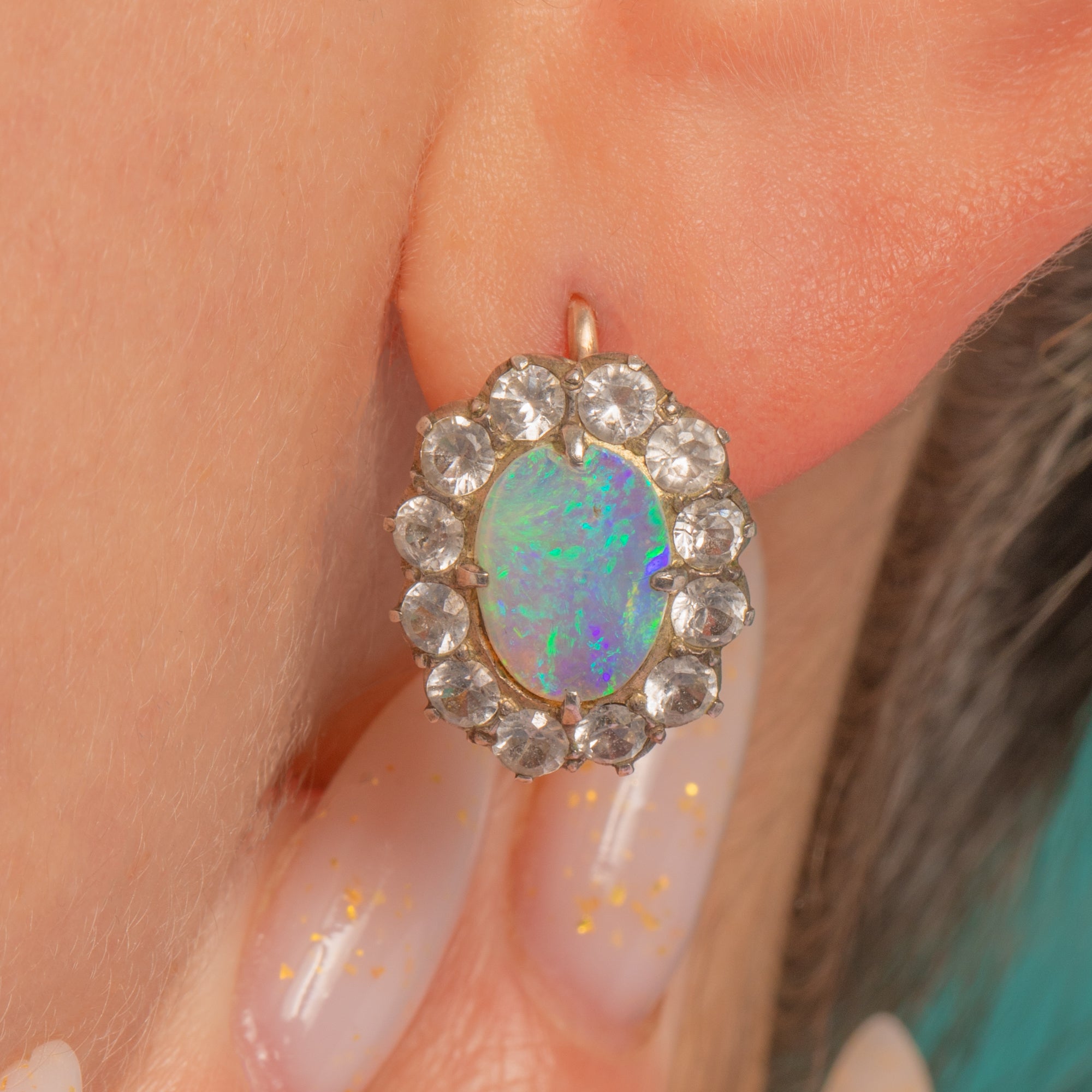 EXCELLENT: Opals are bright and clean with strong play‑of‑colour; White Sapphires are lively with only light, minor facet abrasions visible under magnification. Settings are secure with well‑formed claws and a pleasing antique patina to the silver‑topped halos. Hooks and mounts are in excellent order with minimal age wear.