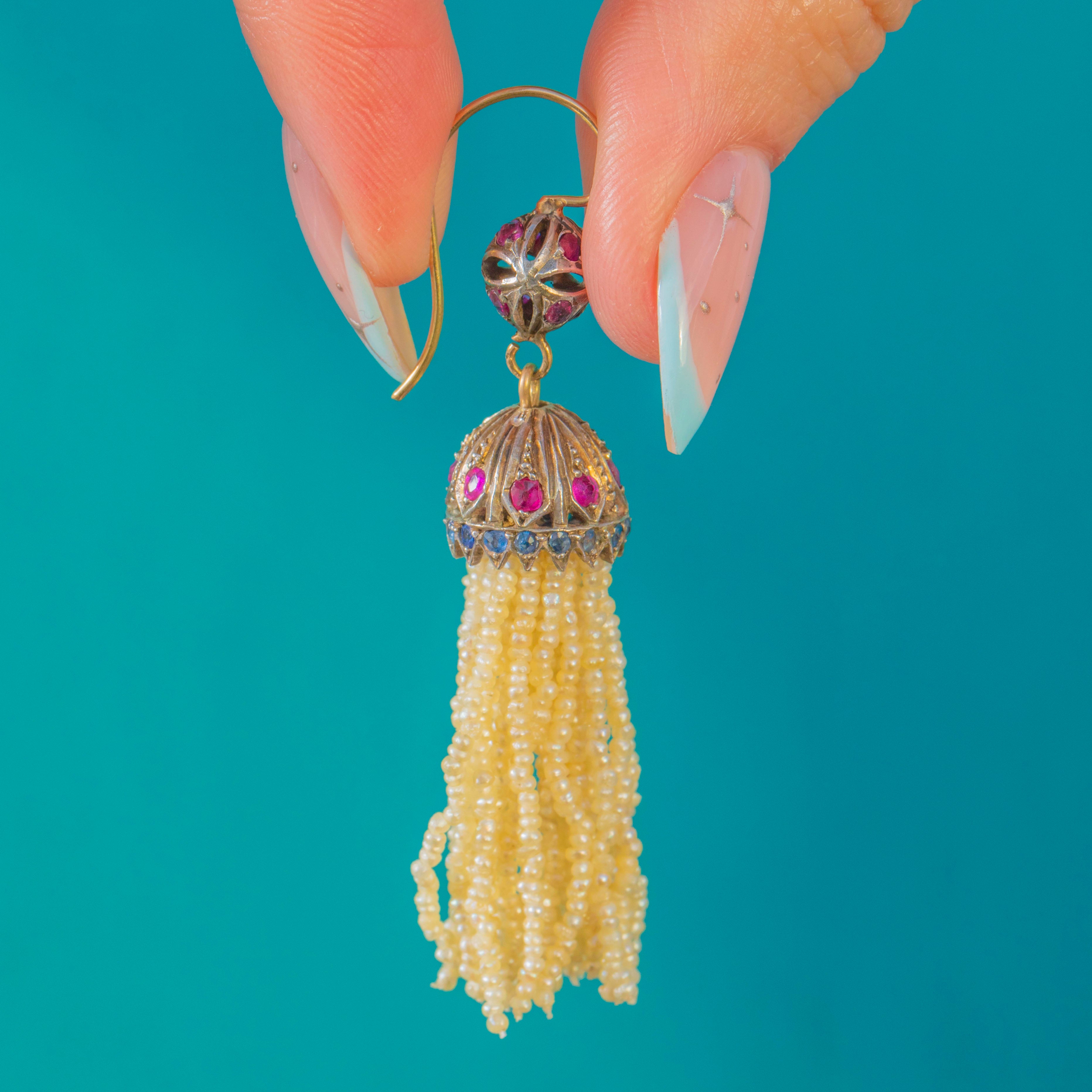Antique Natural Pearl Ruby Sapphire Tassel Earrings - 9ct Gold Hooks