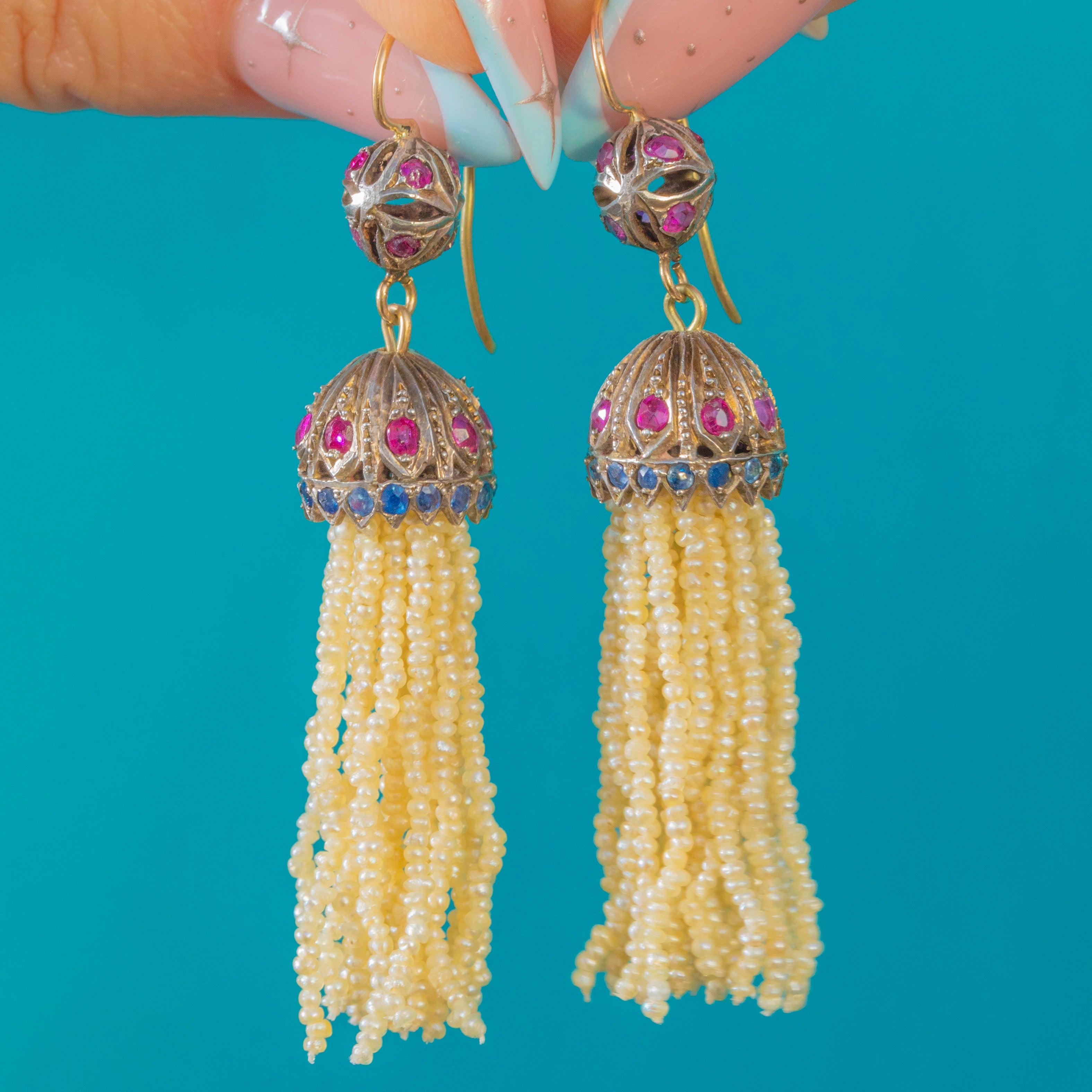 Ornate and wonderfully fluid, this Victorian pair marries gem-set architecture with the swish of Pearl fringes. Each earring suspends a generous tassel of creamy Natural Pearl micro-beads from a pierced jhumka dome, preceded by a gem-set openwork sphere for beautiful articulation and movement. Vivid Ruby accents and a continuous band of deep blue Sapphire around the dome add sumptuous colour, enhanced by fine beaded edges and delicate openwork.