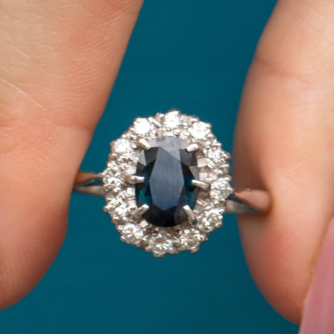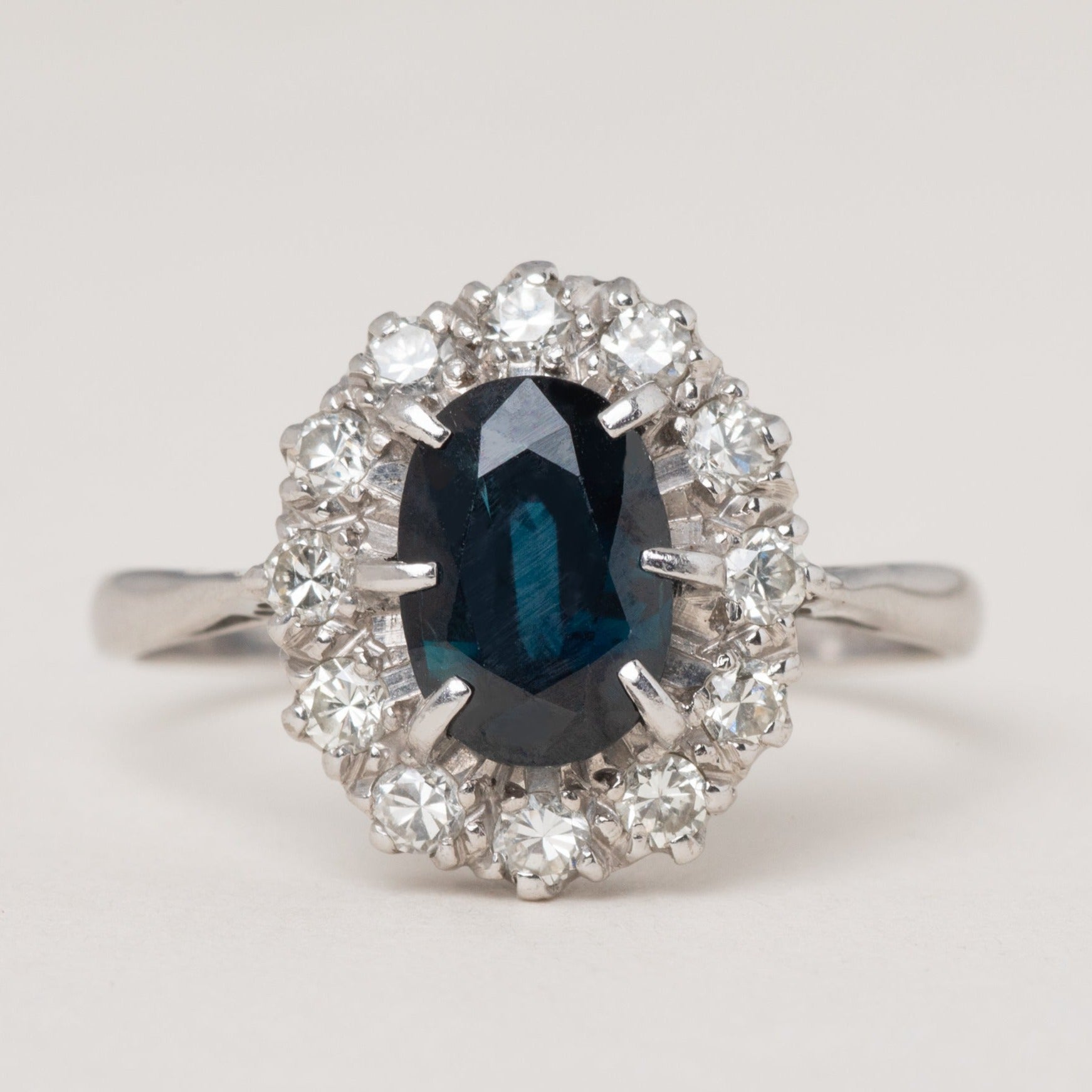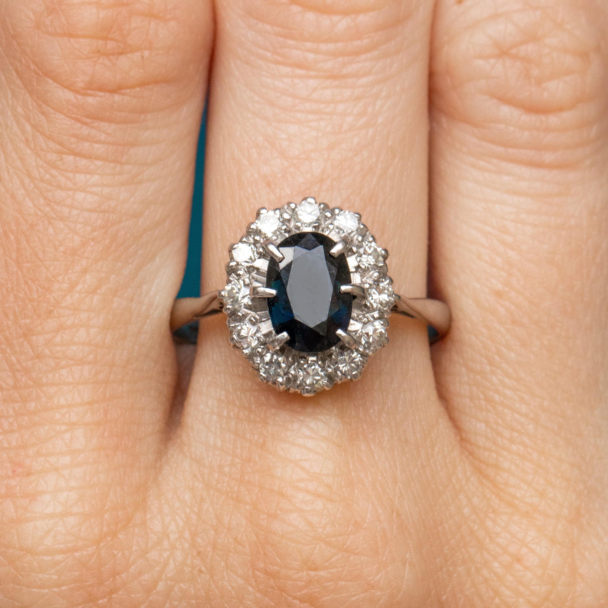 A striking antique natural Sapphire Diamond ring to adorn your finger! This gorgeous ring is home to a 1.60ct natural blue Sapphire, with a 0.25ct halo of sparkling Diamonds.